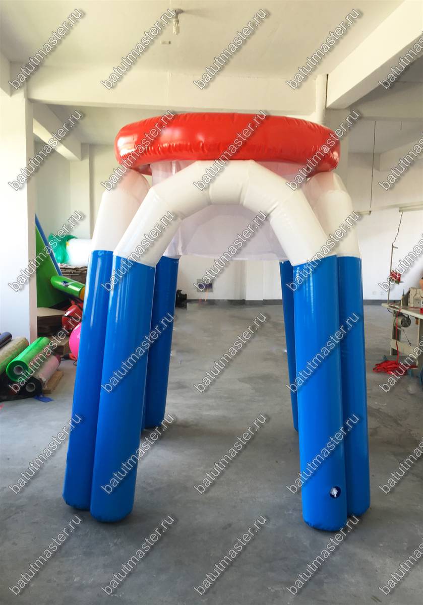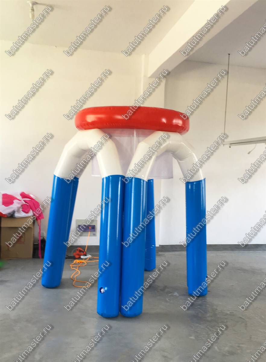 Внешне - это привлекательная конструкция из белого и синего ПВХ, а контуры самой корзины окрашены в красный, что позволяет концентрировать внимание при броске. Аттракцион нуждается в постоянной подкачке, но может устанавливаться, как в помещении, так и на улице. 4 надувные ноги надежно конструкцию, чем делают ее дизайн надежным и практичным. Высота в 2 м придает заметности. Мобильный модуль может стать и частью школьный состязаний или эпицентром любого корпоратива.