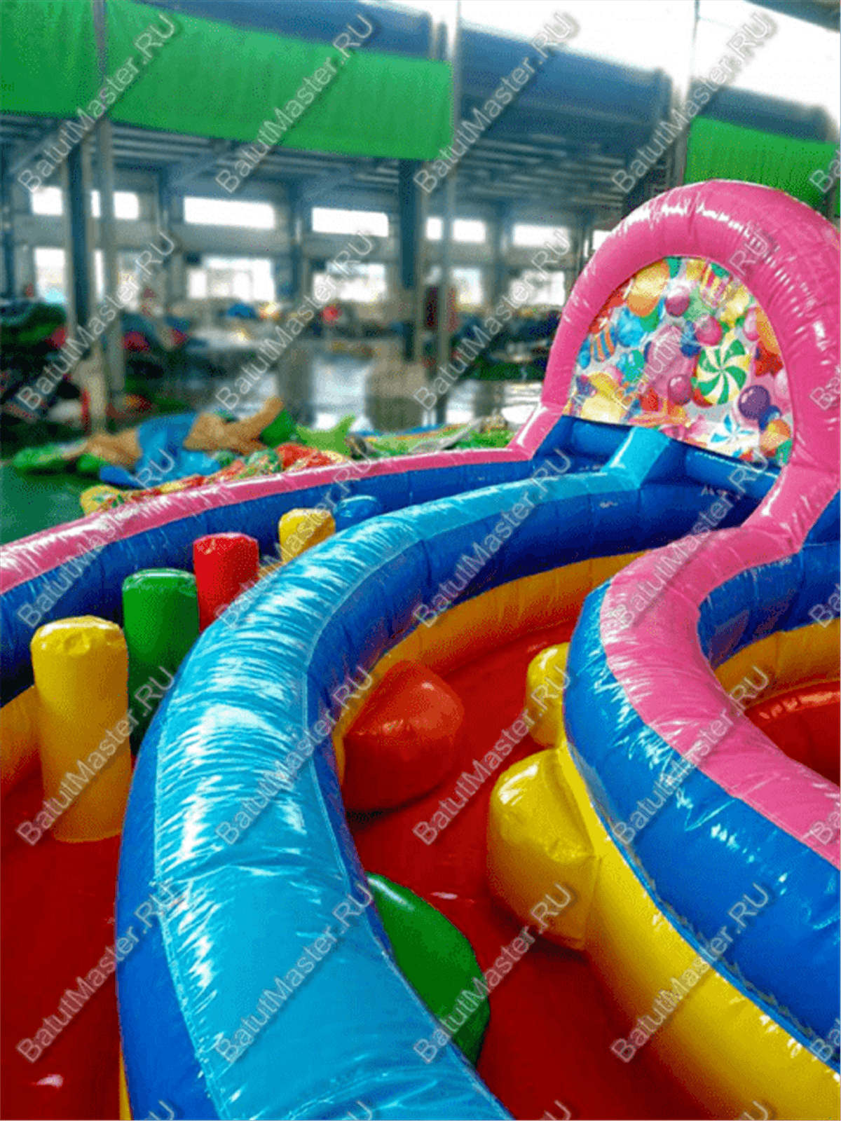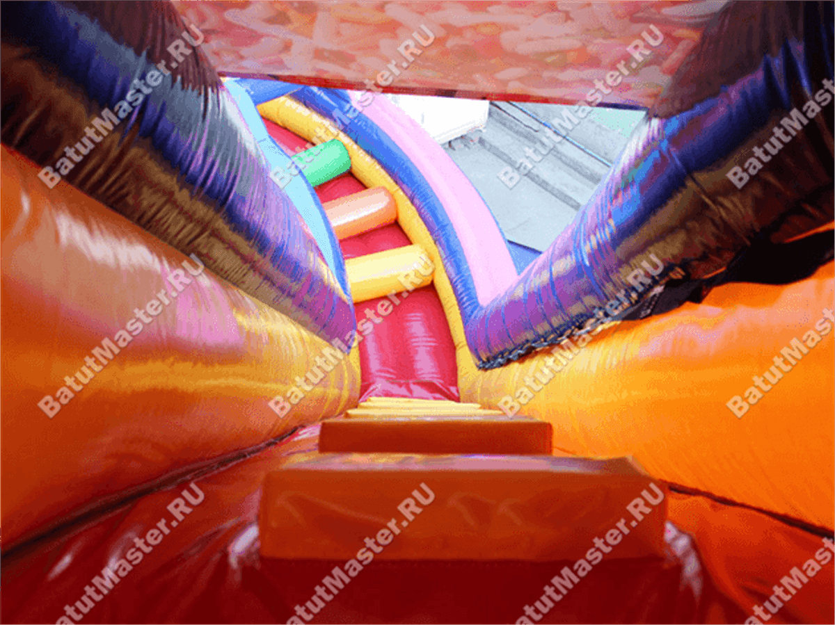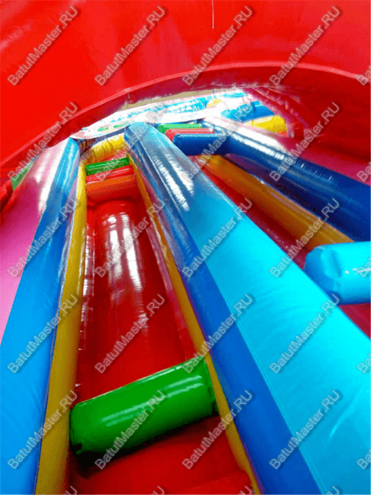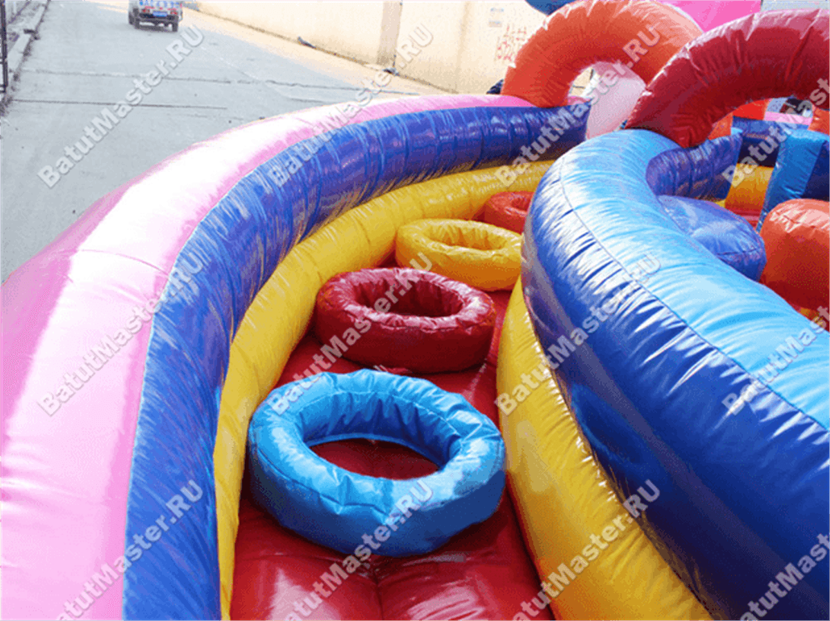 Огромная и разноцветная магистраль в виде восьмерки плавно переходит в подъем и ловко продолжается спуском. Яркий батут из всех цветов радуги это и есть увлекательная полоса препятствий с мягкими преградами, которые делают прохождение более легким и увлекательным. Такой надувной батут можно установить на любом школьном поле или в спортивном зале, чтобы превратить скучные уроки физкультуры в забавные игры. Дети даже не будут замечать, как в ходе игры их мышечная масса растет и развивается.