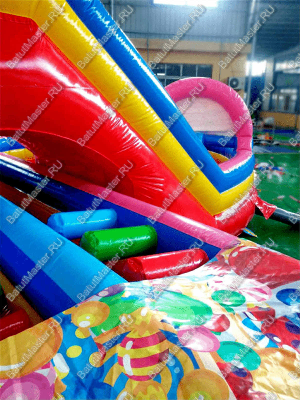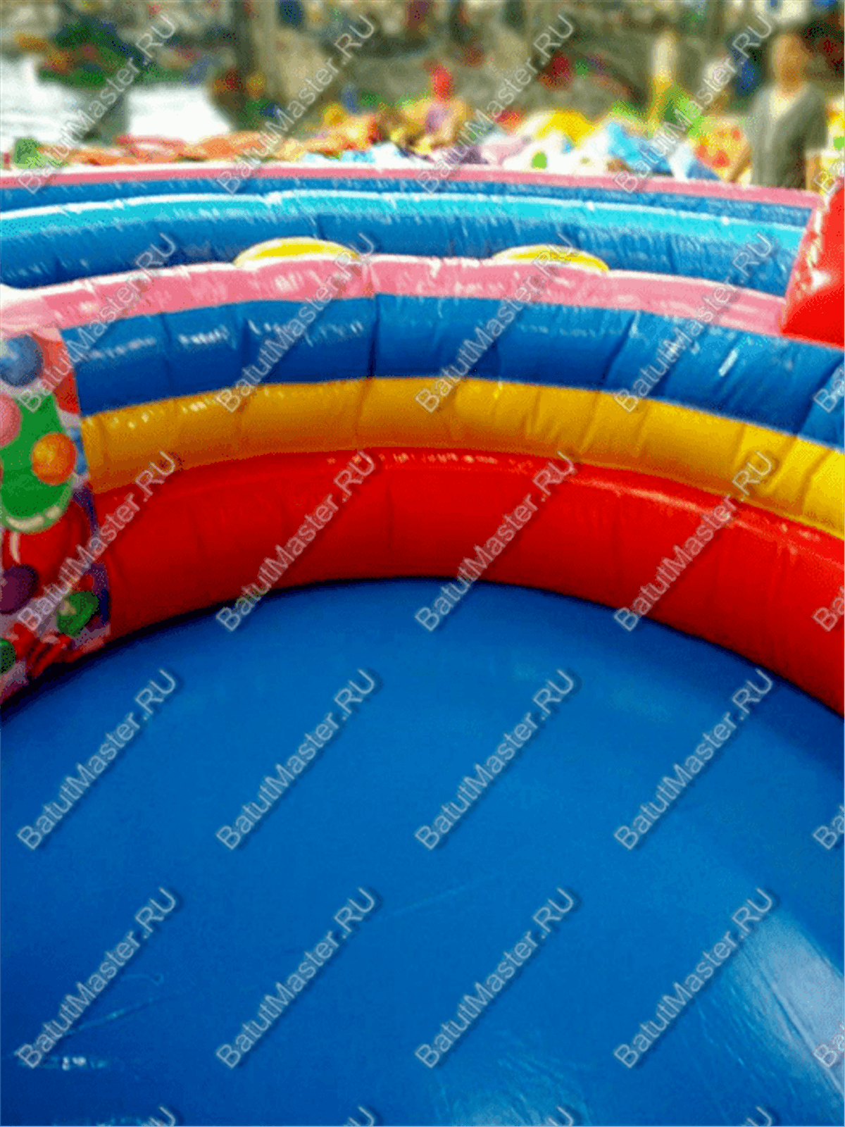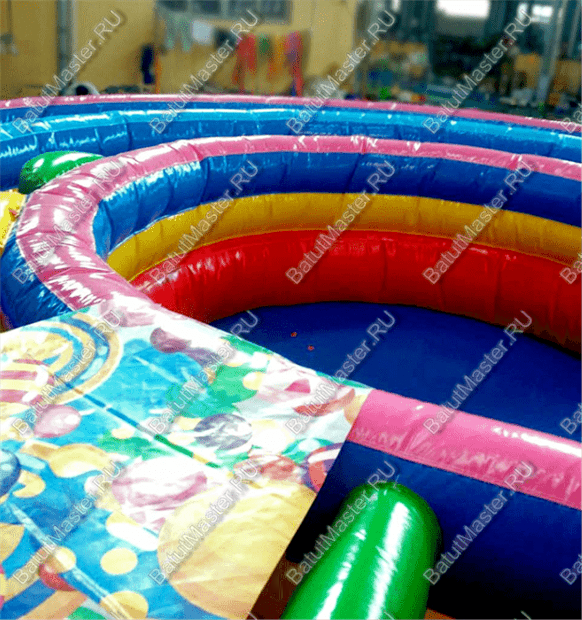 Огромная и разноцветная магистраль в виде восьмерки плавно переходит в подъем и ловко продолжается спуском. Яркий батут из всех цветов радуги это и есть увлекательная полоса препятствий с мягкими преградами, которые делают прохождение более легким и увлекательным. Такой надувной батут можно установить на любом школьном поле или в спортивном зале, чтобы превратить скучные уроки физкультуры в забавные игры. Дети даже не будут замечать, как в ходе игры их мышечная масса растет и развивается.