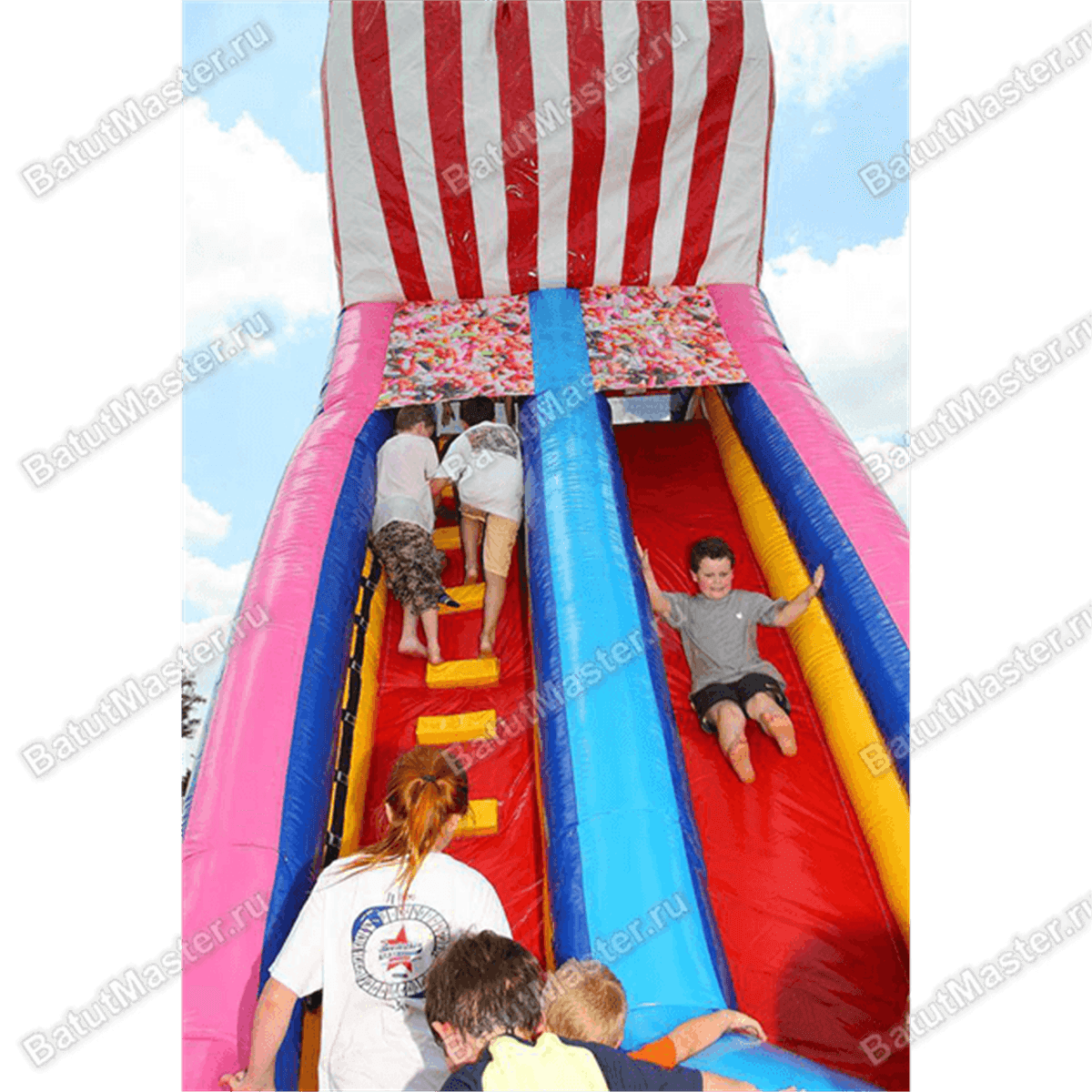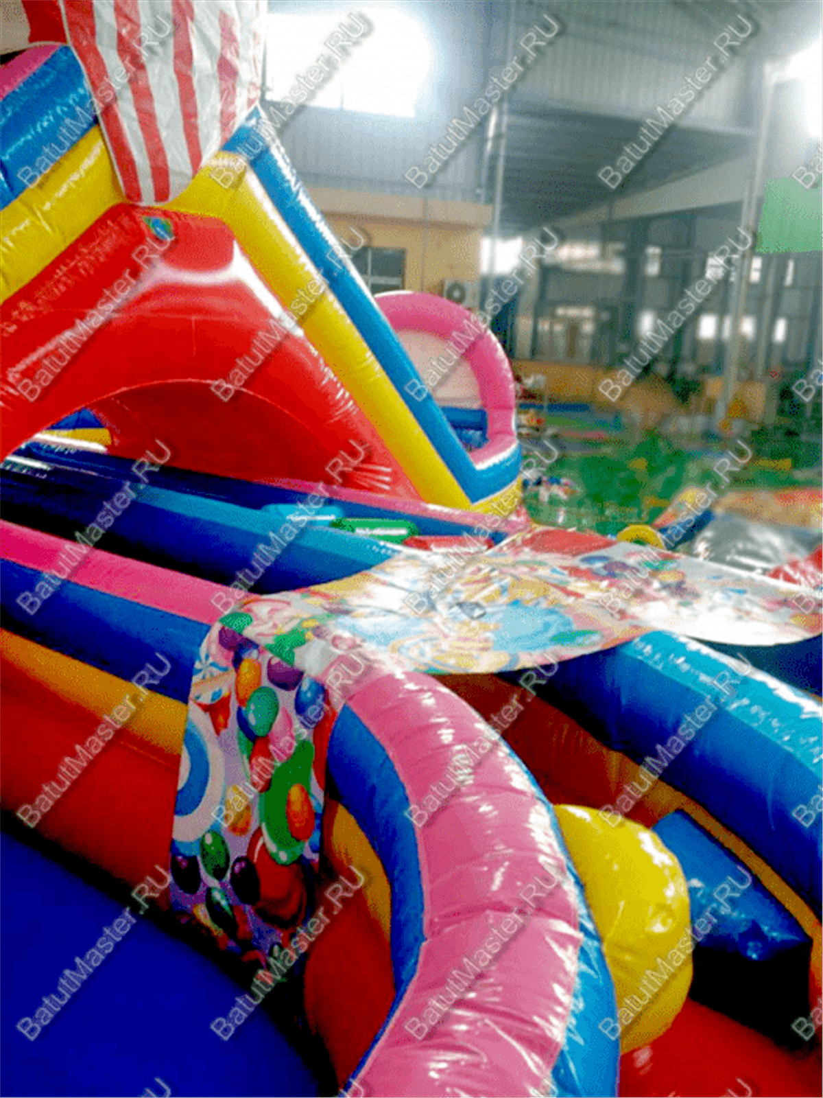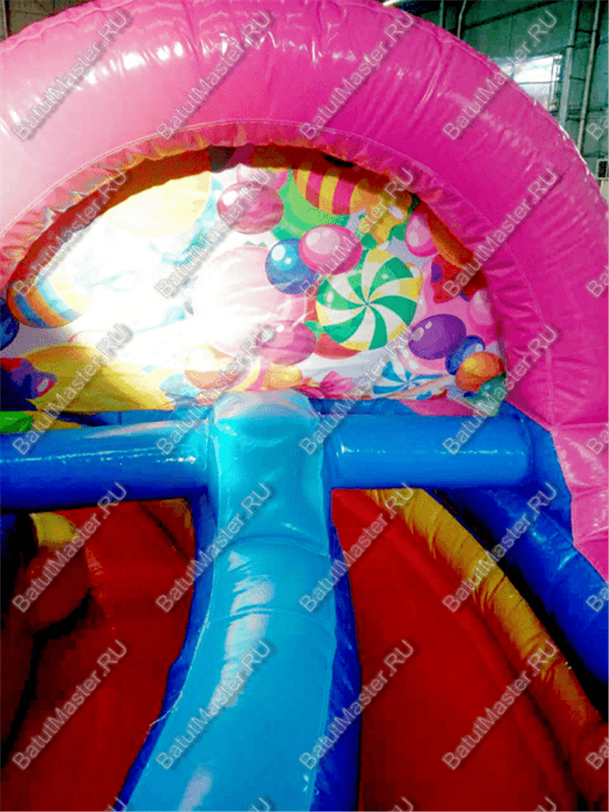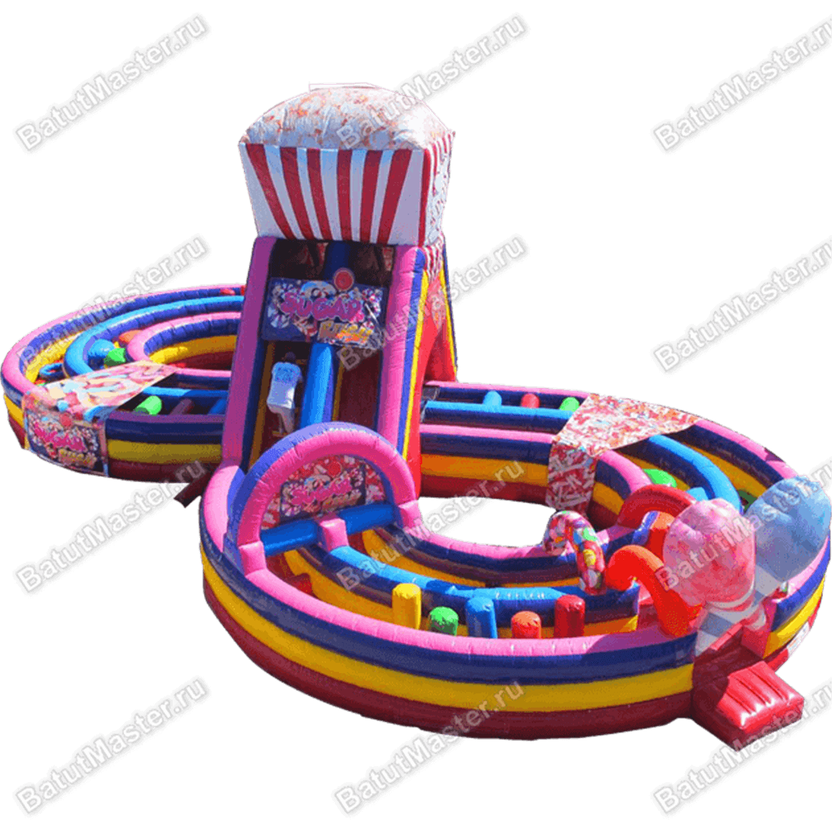 Огромная и разноцветная магистраль в виде восьмерки плавно переходит в подъем и ловко продолжается спуском. Яркий батут из всех цветов радуги это и есть увлекательная полоса препятствий с мягкими преградами, которые делают прохождение более легким и увлекательным. Такой надувной батут можно установить на любом школьном поле или в спортивном зале, чтобы превратить скучные уроки физкультуры в забавные игры. Дети даже не будут замечать, как в ходе игры их мышечная масса растет и развивается.