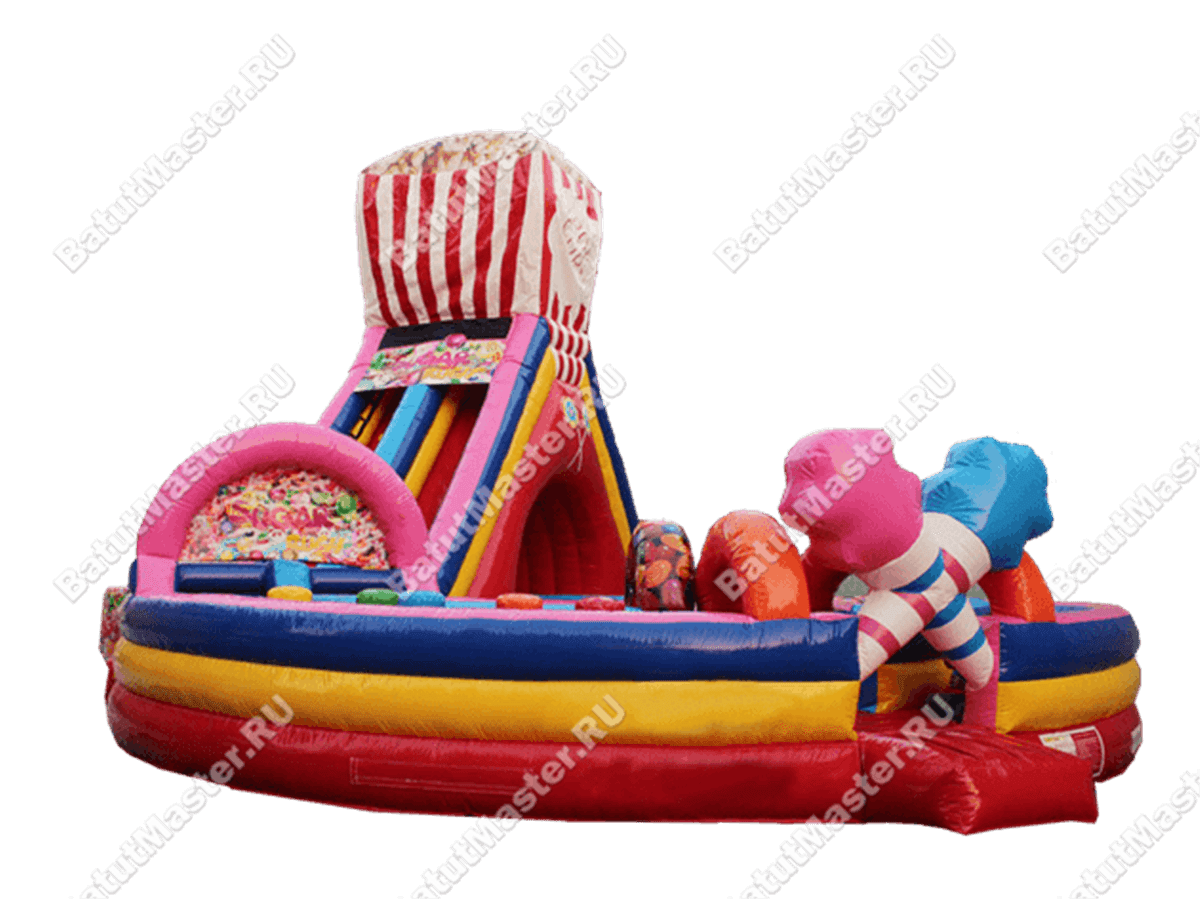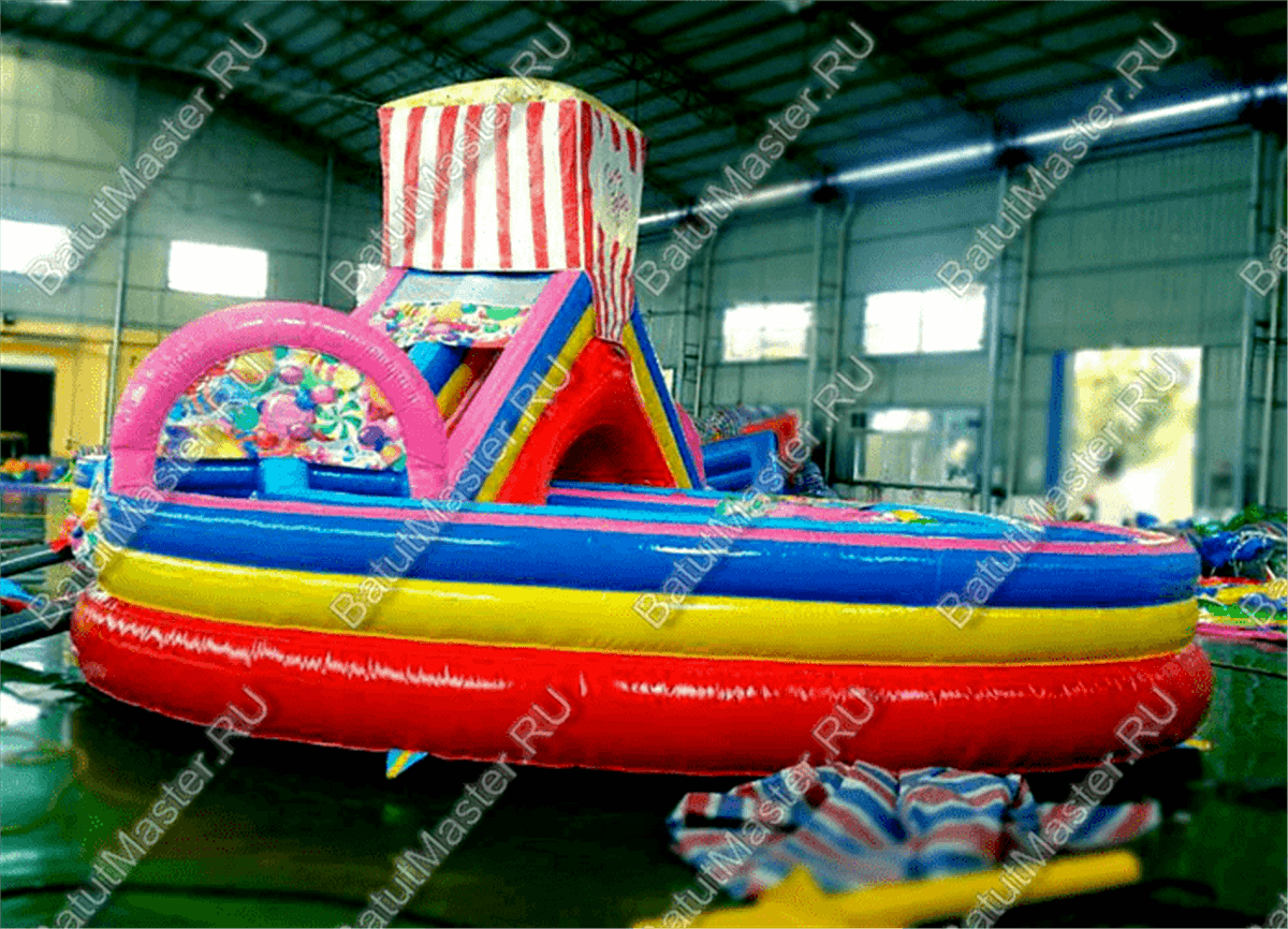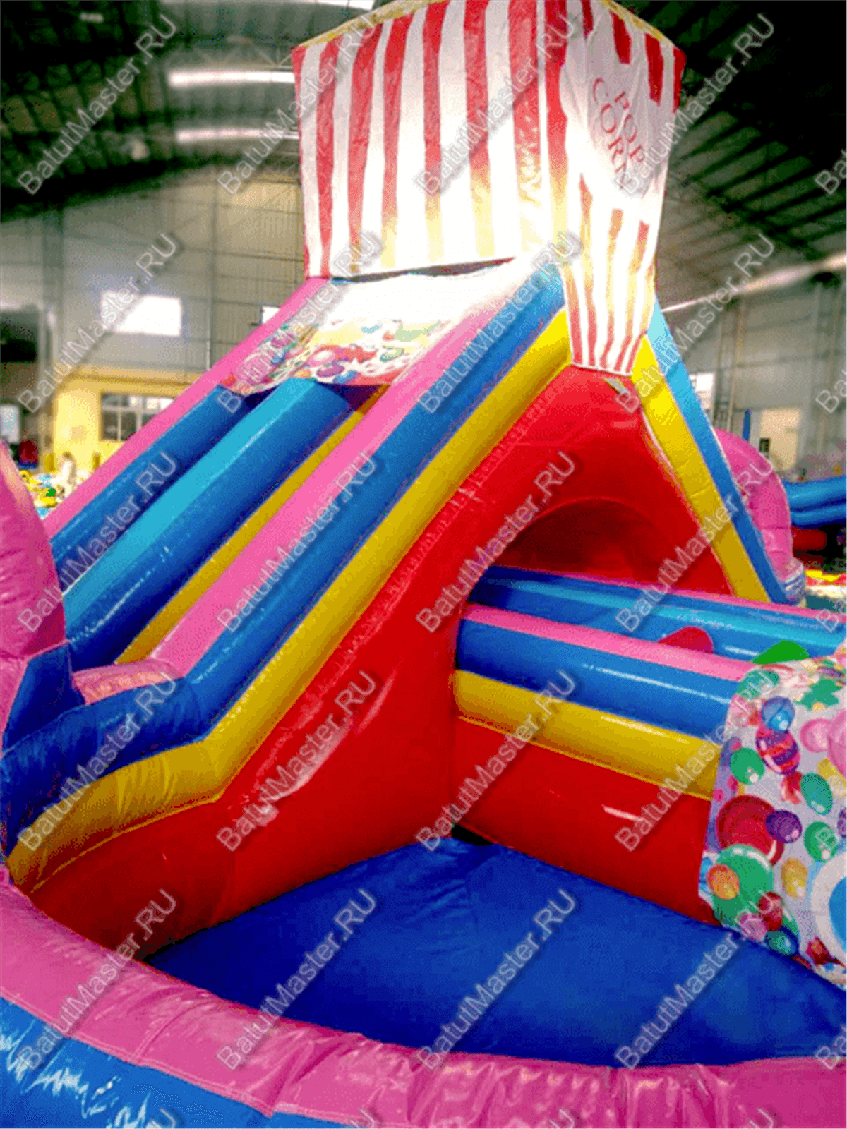Самой важной частью полосы препятствий является огромный «пакет» с попкорном из ПВХ, возвышающийся над горкой. Некоторые части сверху укрыты плотным материалом и создают темные зоны, также встречаются и арки. Наличие валиков, колец и других элементов делают батут пестрым, его можно заметить даже вдалеке. Наличие препятствий и преград не говорит о том, что здесь нельзя попрыгать. Можно и даже везде, ведь каждая часть мягкая и отлично отпружинивает детское усилие.