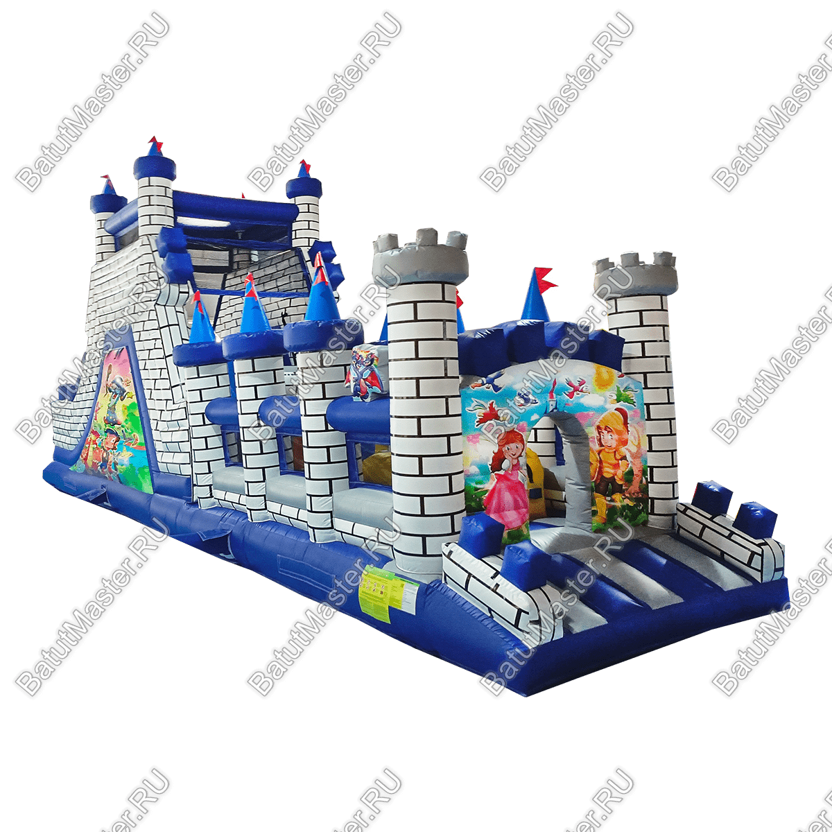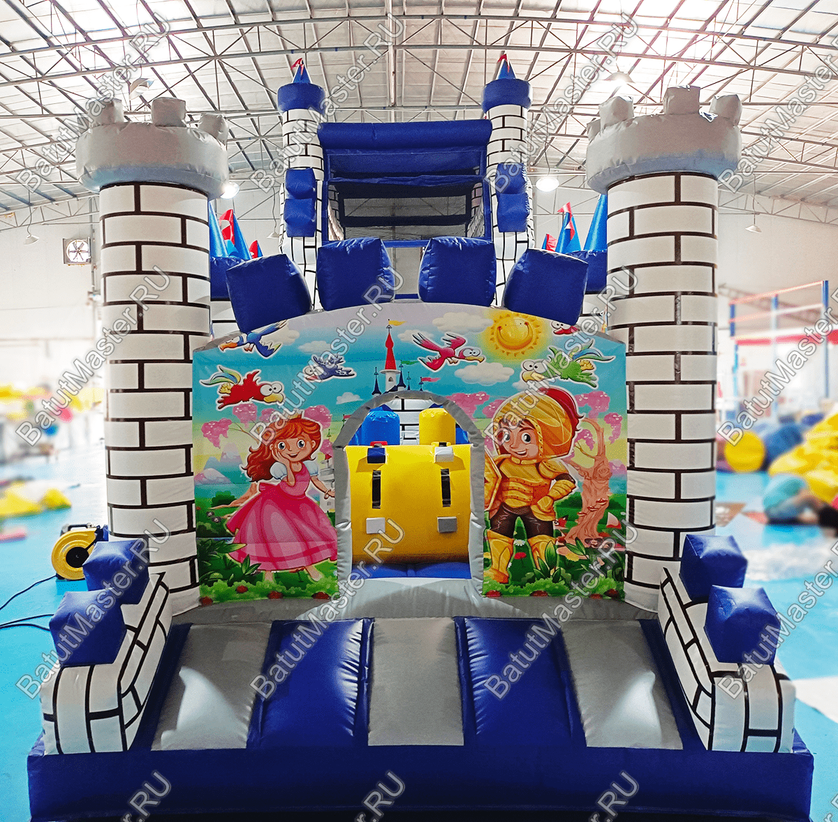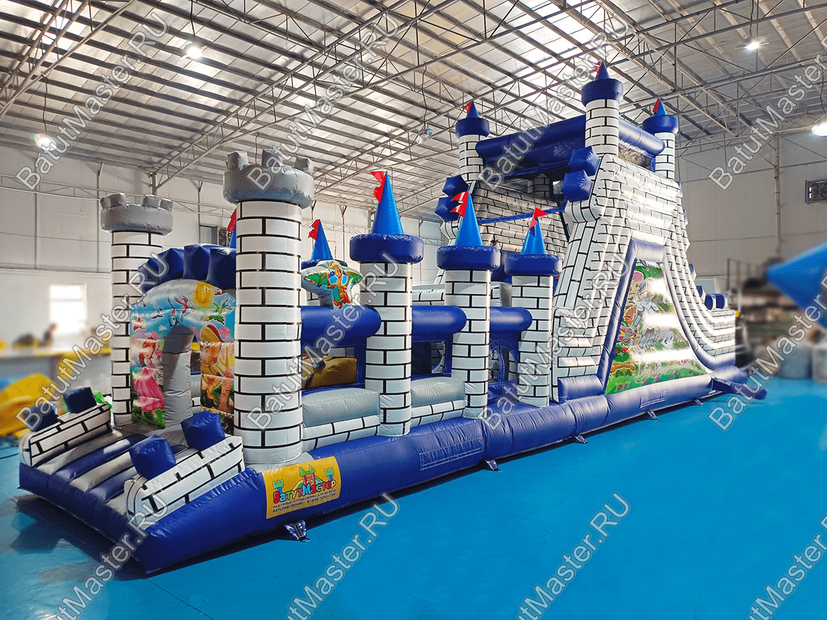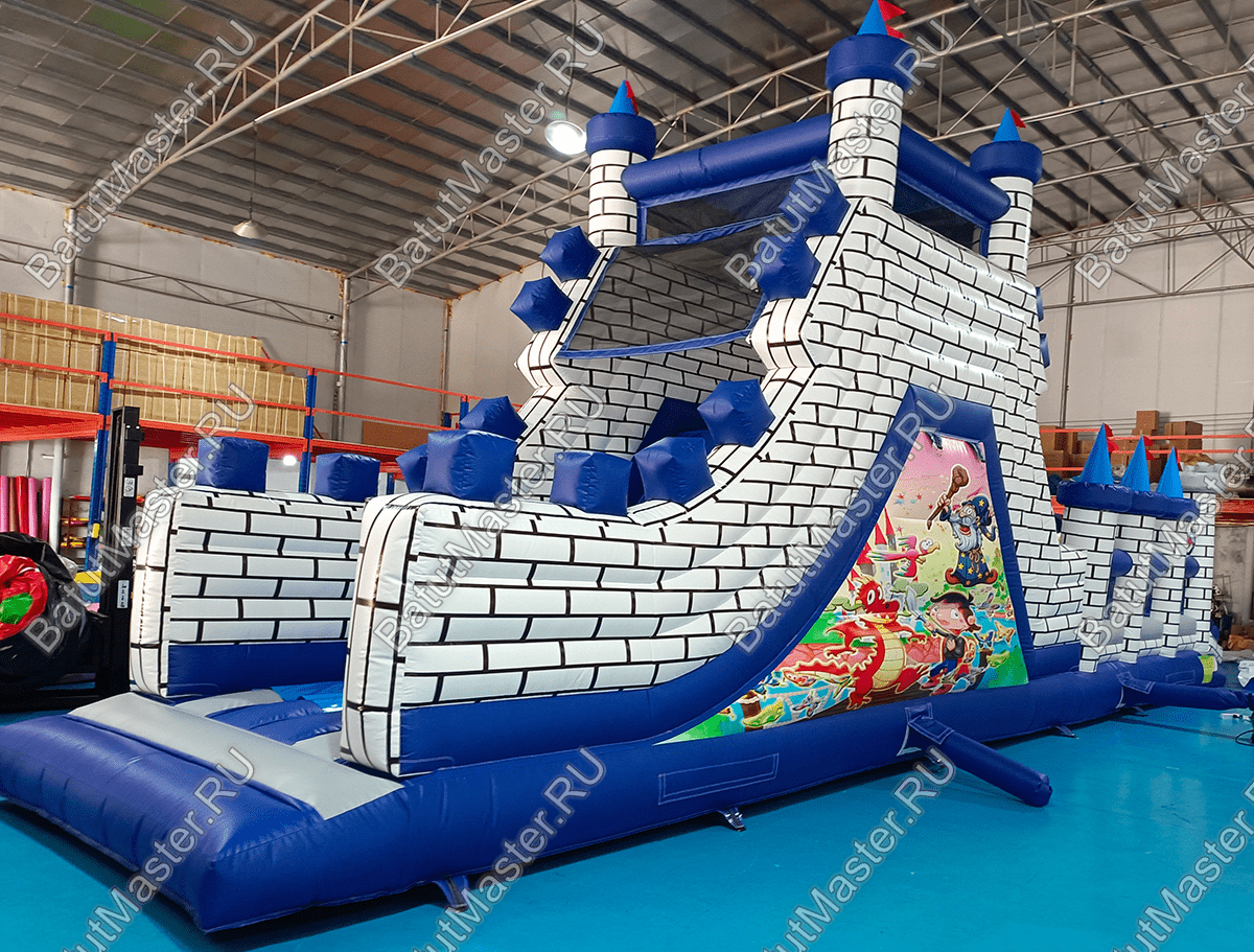 Дух средневековья всегда пленит мальчишек рыцарскими доспехами, а девчонок – пышными платьями, поэтому не побывать в средневековом замке для детей просто невозможно. Вся конструкция выполнена в белом, сером, голубом и синем тоне, который полностью передает холодное готическое настроение. По всему периметру вместо опор установлены остроконечные надувные колонны с синими башнями и только на входе стоят два столба с обычной зубчатой каймой.