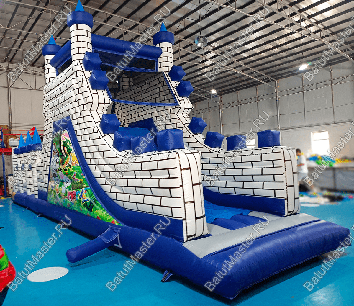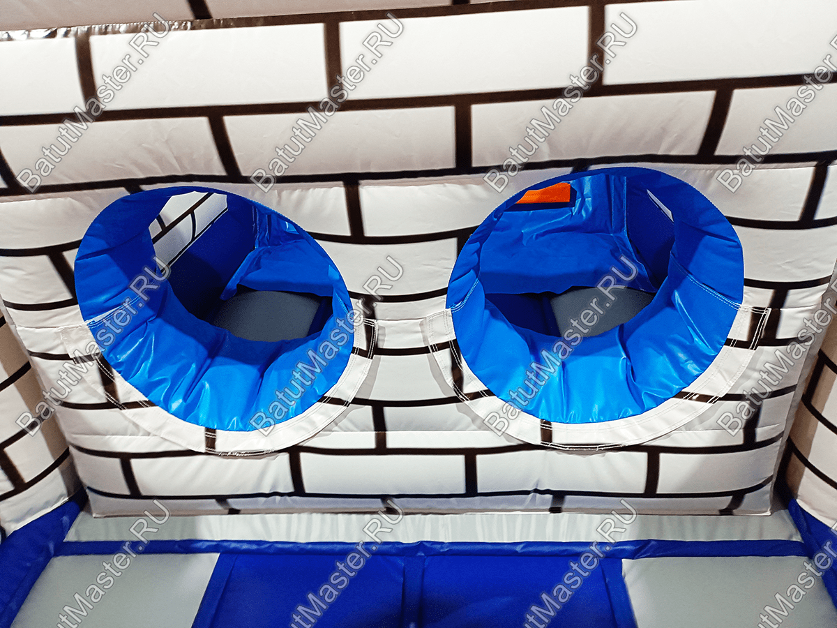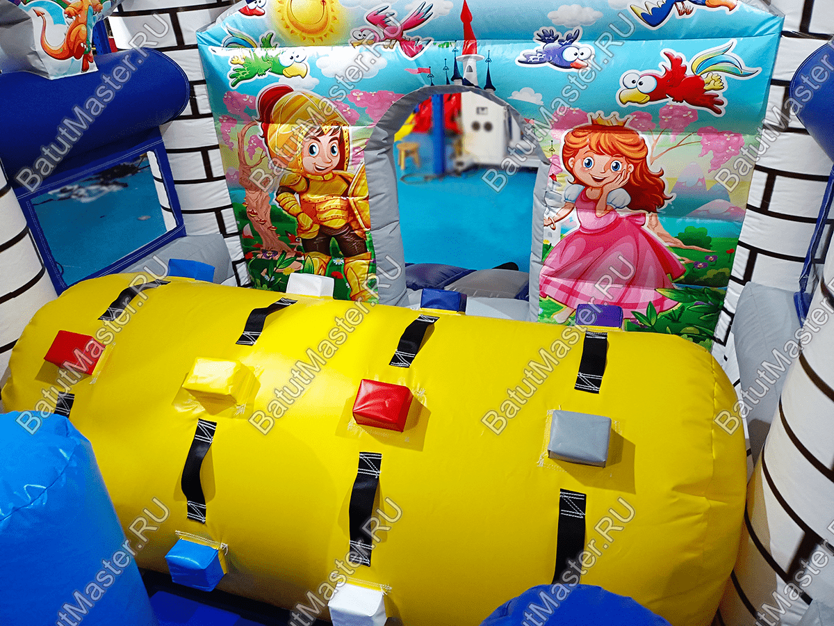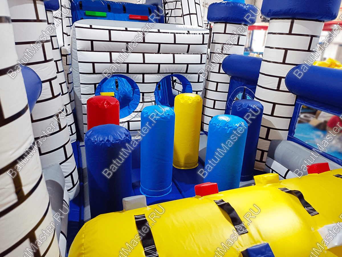 Почти весь батут – это одно сплошное место для прыжков и для бега, переполненное препятствиями и игровыми фигурами. Начинаются они сразу после входа с горизонтального полувалика, дальше предстоит преодолеть целую гряду высоких и тонких столбиков разного цвета, а еще дальше – «кирпичную» стену с двумя круглыми лазами. Потом останется лишь один высокий барьер и лестница, которая приведет юного «рыцаря» на самую высокую точку замка для того, чтобы он мог насладиться захватывающим спуском.
