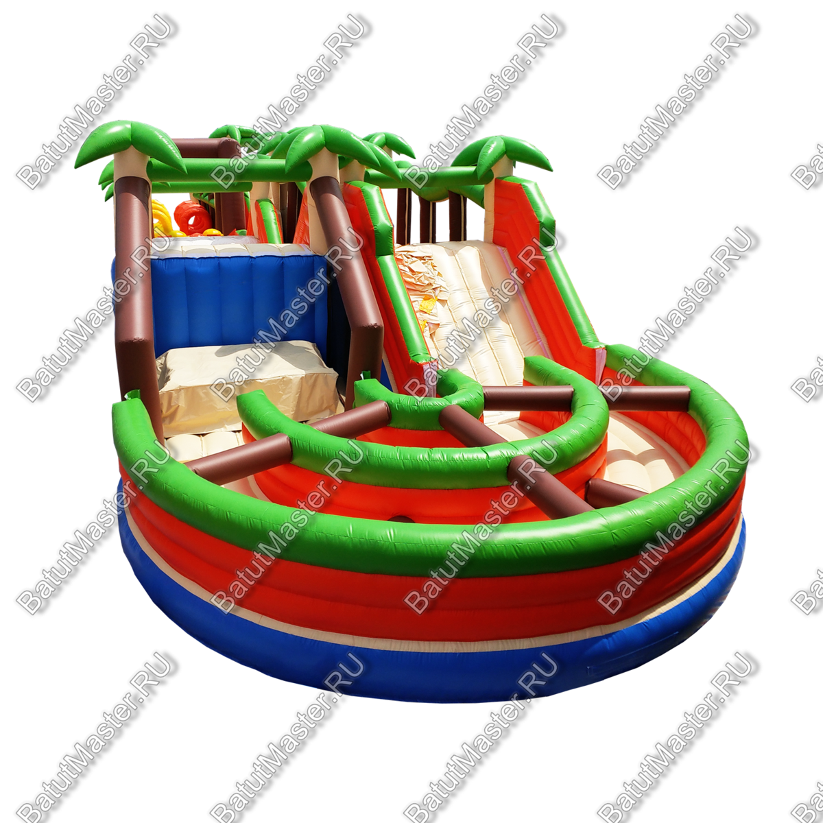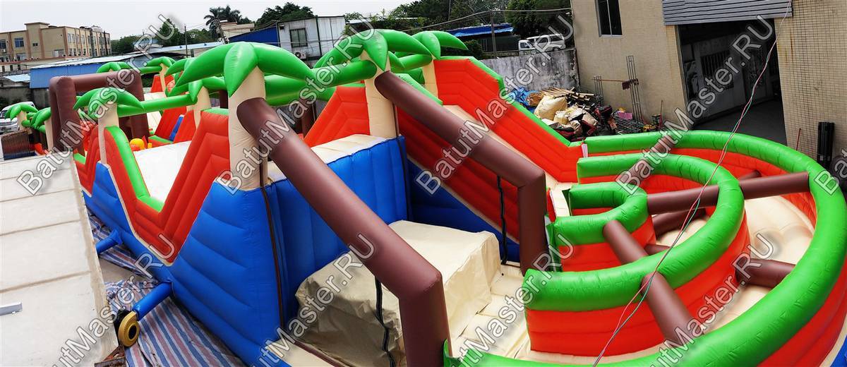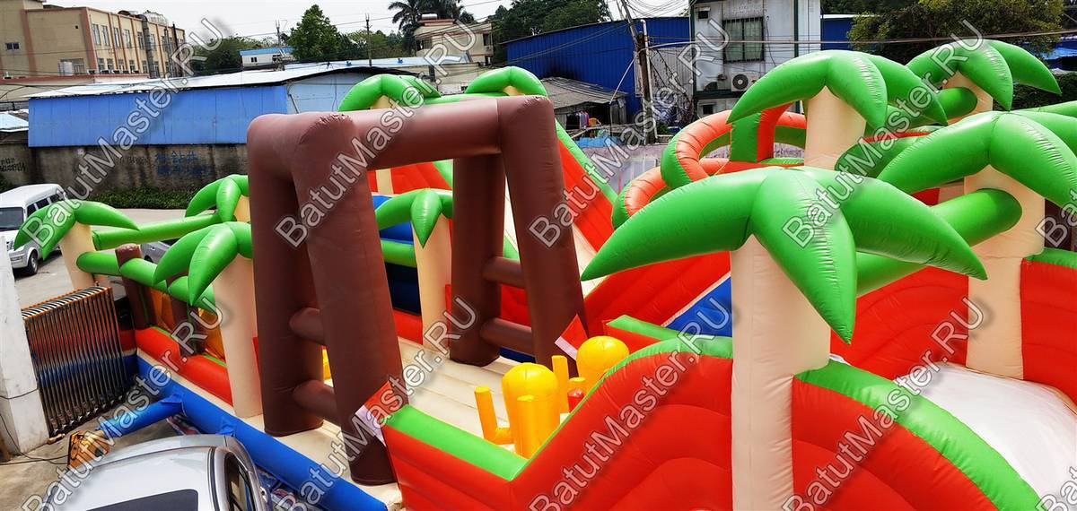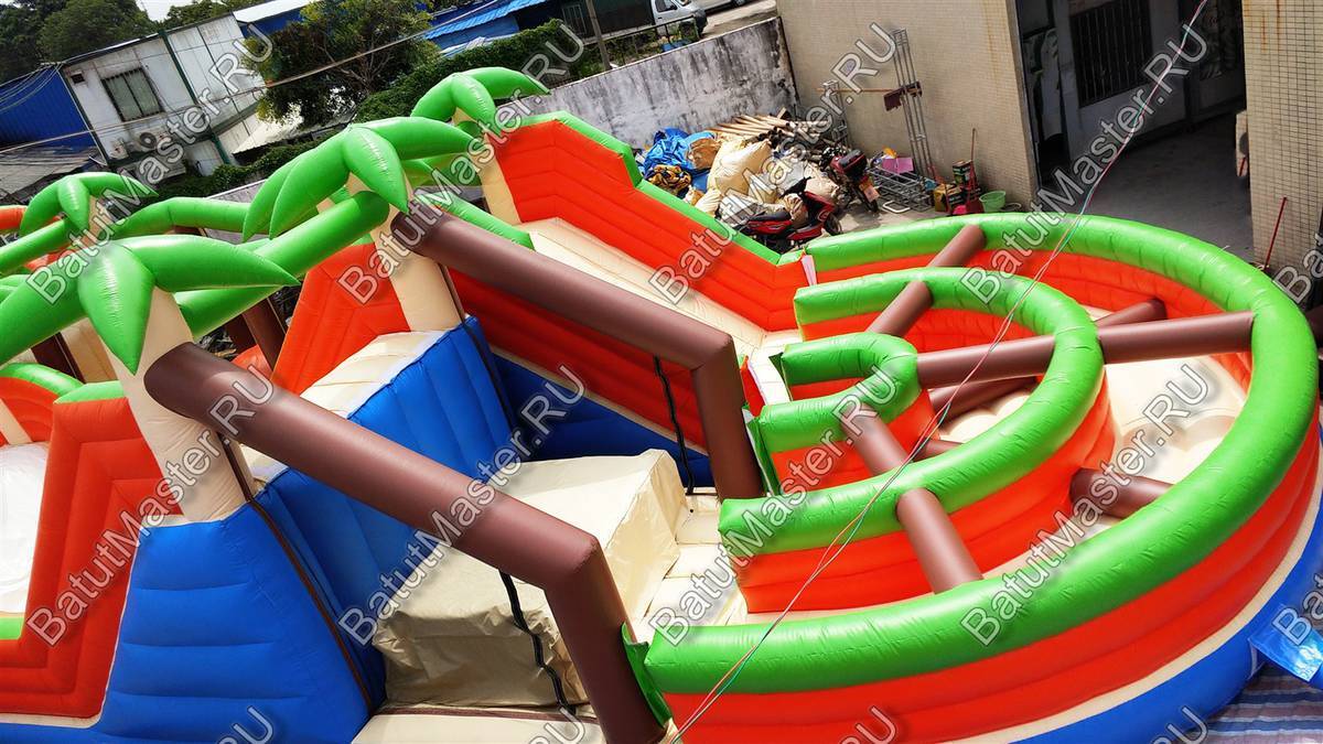Полоса препятствий «Гонки в джунглях» - это интересный, функциональный комплекс, предназначенный для развития и улучшения физических показателей у детей, а также для невероятных состязаний. Это не просто надувной батут, это целая арена для приключений. Первое, что бросается в глаза, так это необычная форма батута – он выполнен в виде полукруга. Спустившись с горки, детям нужно преодолеть путь, который перекрыт горизонтальными надувными модулями, при этом им придется приседать и прыгать, такие действия чередуются несколько раз подряд. В середине пути их ждет невысокая стена, на которую предстоит забраться, и дальше соревноваться за то, кто первый придет к финишу. Все это развивает и улучшает физические показатели, что так важно на тапе развития юных непосед.