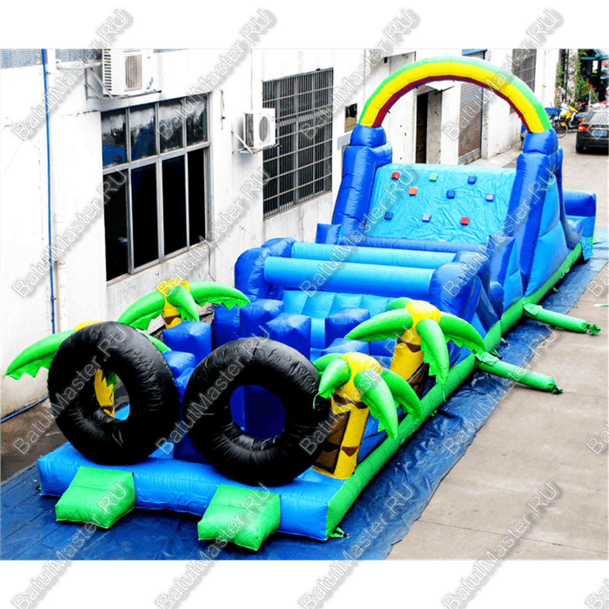 Сбоку надувной батут украшают пальмы, таким образом, они разбавляют строгую тематику полосы соревнований. Он занимает не много места при интересном и функциональном наполнении. Рассчитан для бизнеса. Не выгорает на солнце и не сжимается при низкой температуре, поэтому может быть установлен под открытым солнцем. Идеальным решением будет его размещение в торгово-развлекательном центре или парке, где всегда большое скопление детей. Непременно, юные непоседы захотят проверить свои силы здесь. Коммерческий комплекс полностью безопасен, несмотря на то, что он не имеет высоких бортов. Края защищены частями самих модулей, а также батут невысокий, поэтому получить травму здесь непросто.
