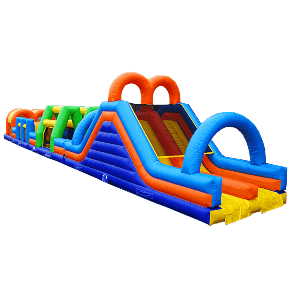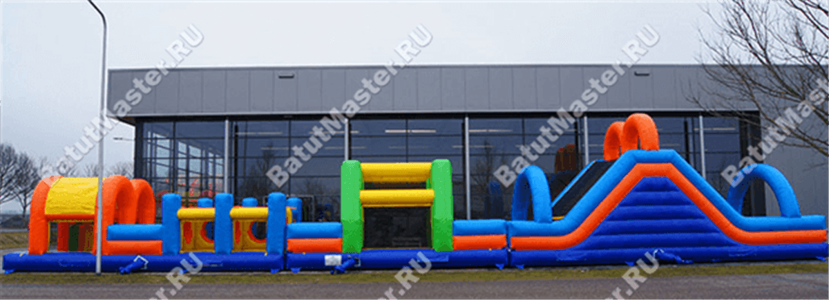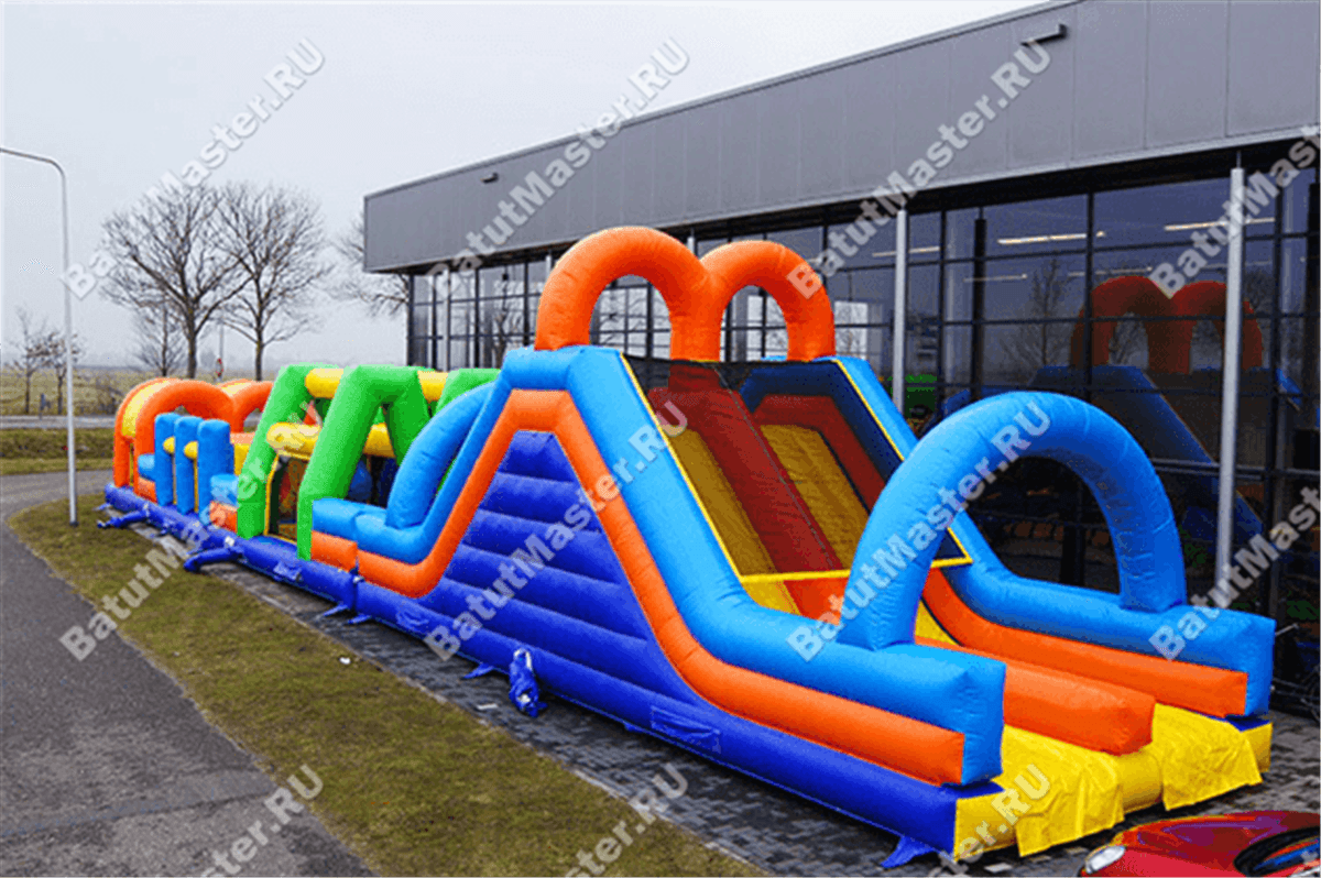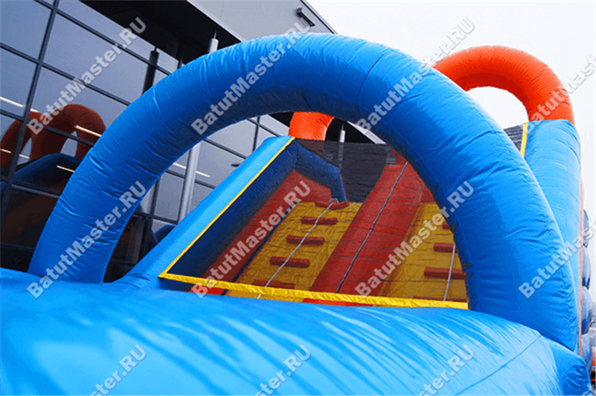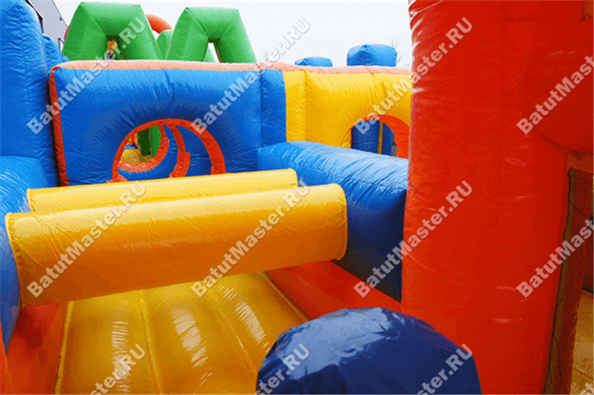 Необычный батут состоит из самых ярких разноцветных игровых фигур и препятствий. Здесь нет животных и мультяшных персонажей, но дети смогут увлечься аттракционом не на один час. Левая сторона более сложная, на ней скопились почти все спортивные фигуры в виде мягких лазов, надувных горизонтальных валиков. Перед самым подъемом установлена высокая синяя арка и двойная лестница. И подъем, и спуск накрыты почти прозрачной сеткой, главная высокая конструкция разделена на 2 части. Самая верхняя площадка украшена двумя дугообразными арками.