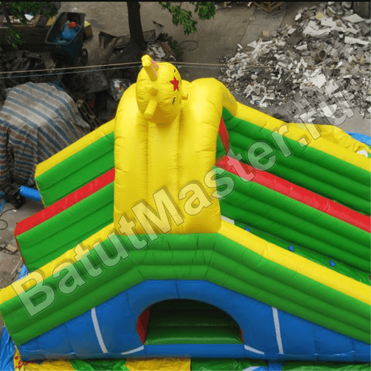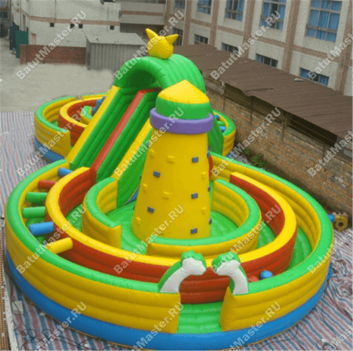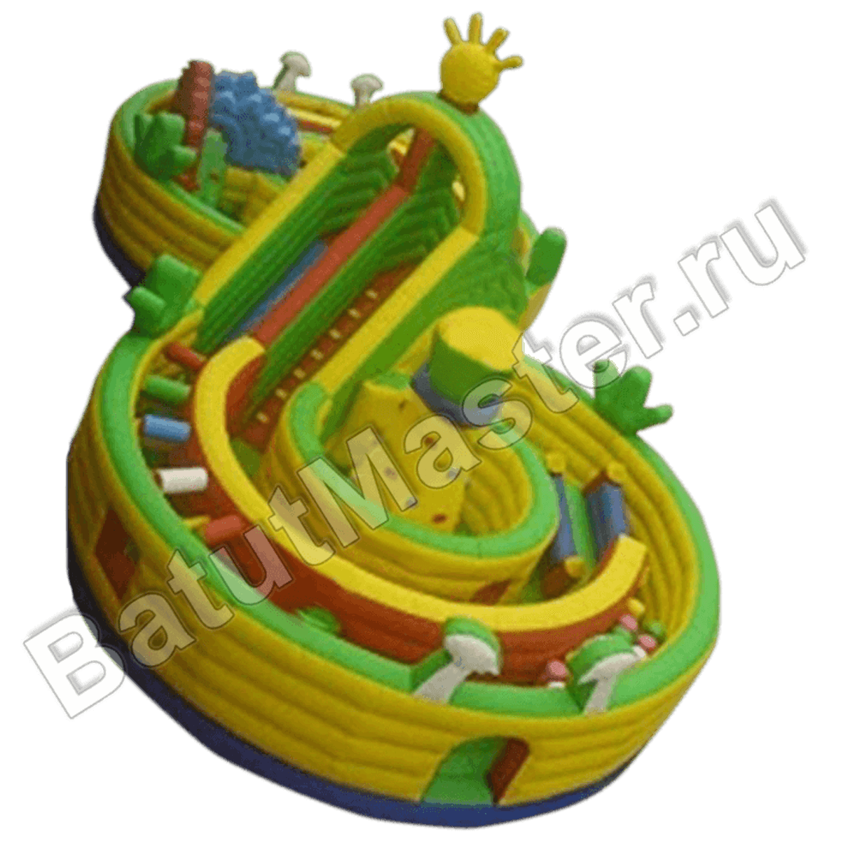 Здесь и правда можно заблудиться! Полоса препятствий в больше мере имеет зеленый окрас, начинается с горки в центре. Дальше она переходит в туннель или открытый перекат (она разделена перегородкой с красной полосой). Продвигаясь дальше, можно наткнуться на множество цветных валиков, которые будут тормозить продвижение. Внутри лабиринта стены имеют желтый или красный окрас, но внешняя стена по верхнему краю – зеленая, с внешней стороны батут желтый.