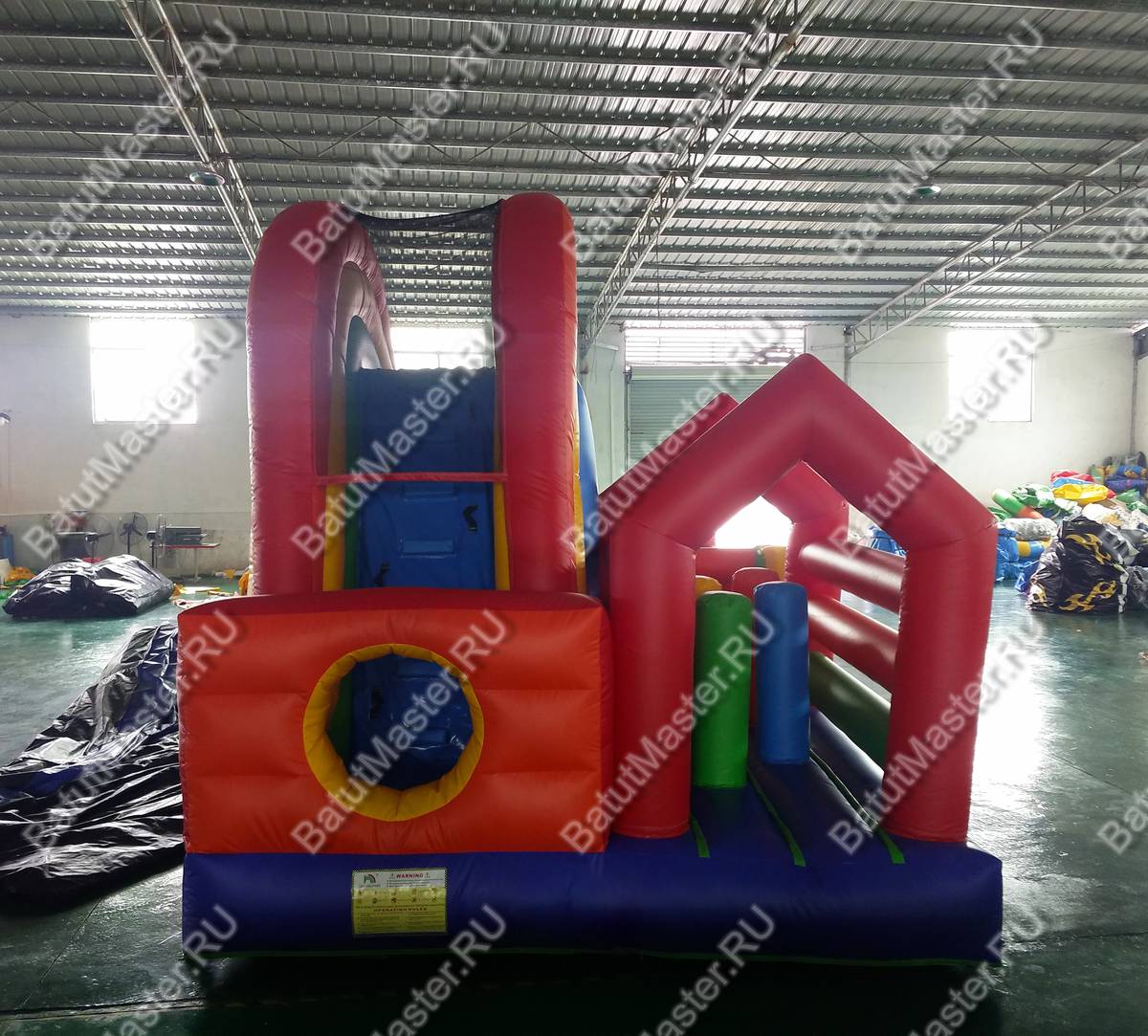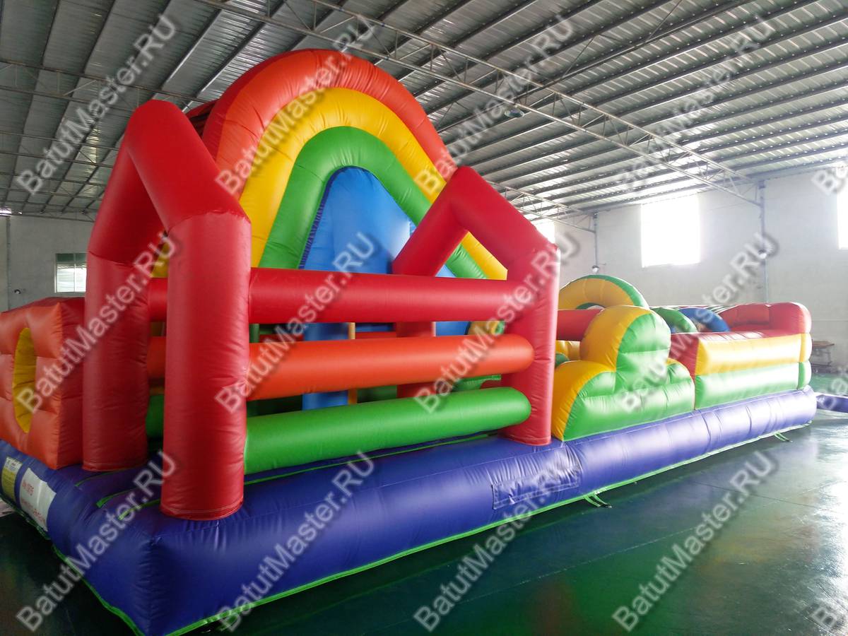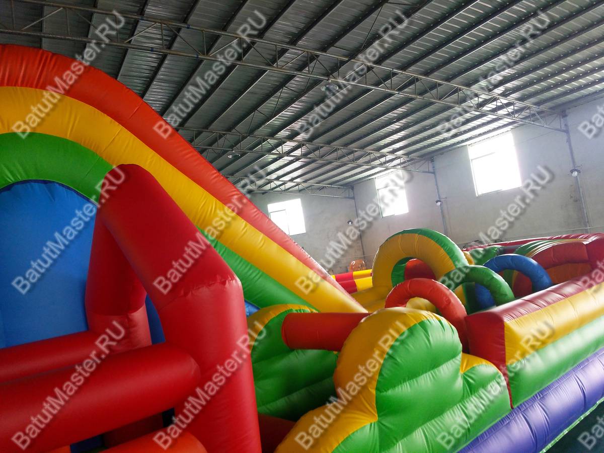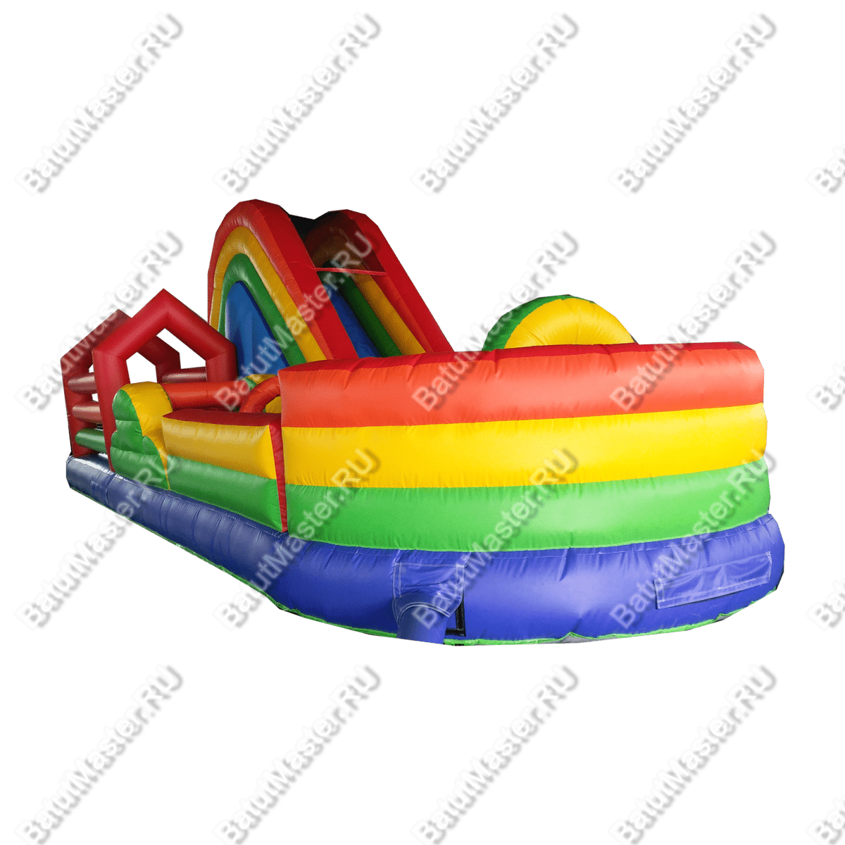 Комплекс необычен тем, что выполнен в ярких цветах радуги и необычной форме. С самого начала полосы маленьким первооткрывателям следует пролезть через надувное кольцо и забраться по мягким ступеням на горку, после чего скатиться с нее с ветерком и снова преодолевать вертикальные столбцы, надувные перекладины и многое другое. Батут функциональный и интересный еще за счет того, что грамотно разделен на несколько локаций, каждая из которых представляет собой отдельное поле для состязаний.