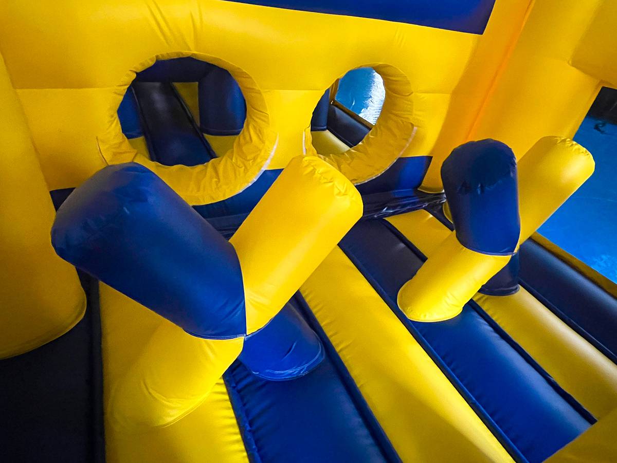 Прочная оболочка из армированного ПВХ делает батут устойчивым к износу, резким перепадам температур и активной эксплуатации. Его привлекательный сине-жёлтый дизайн бросается в глаза и формирует зону притяжения на любых праздниках, фестивалях или корпоративных мероприятиях.