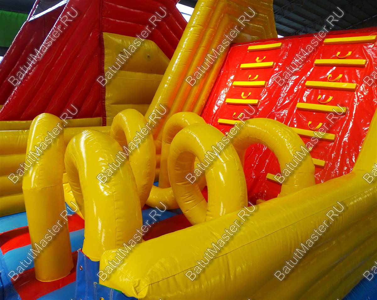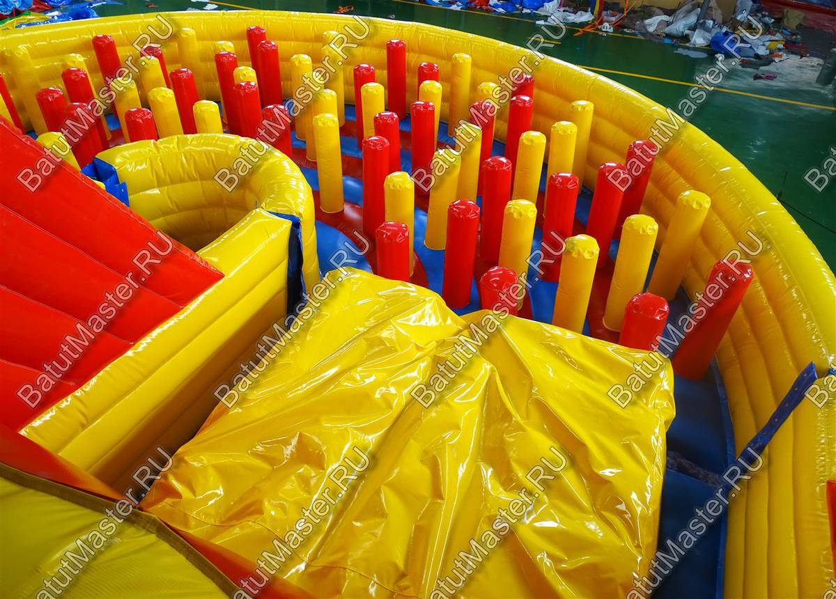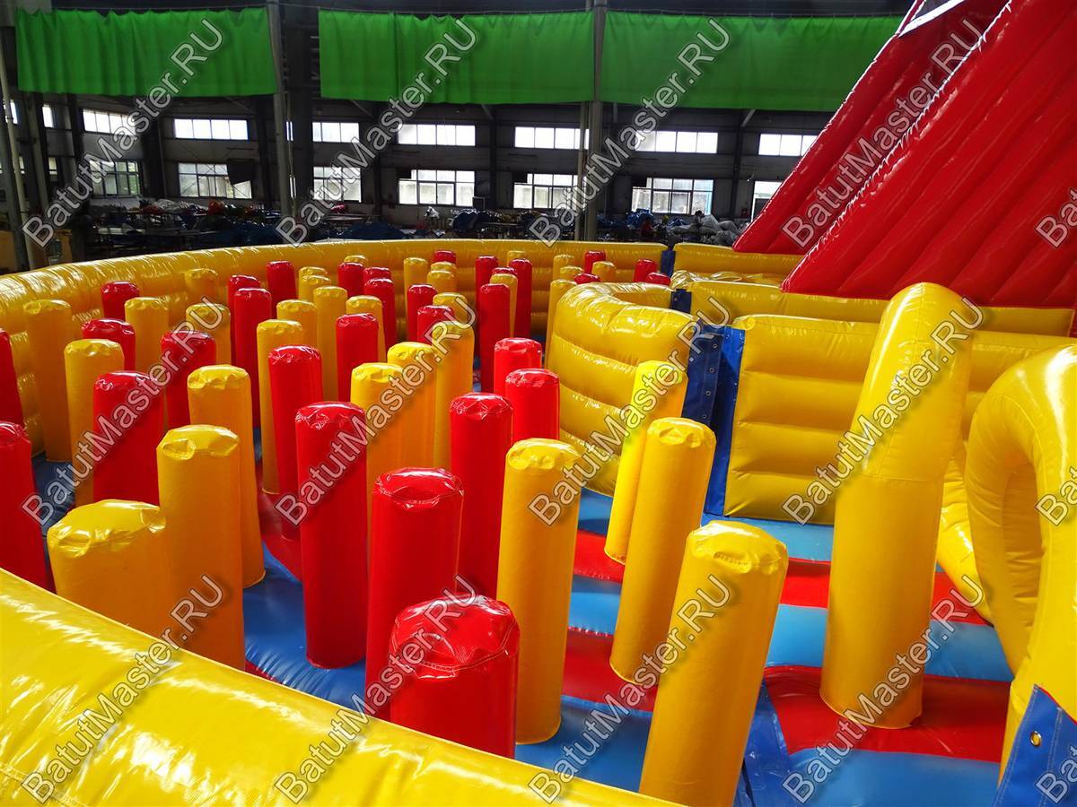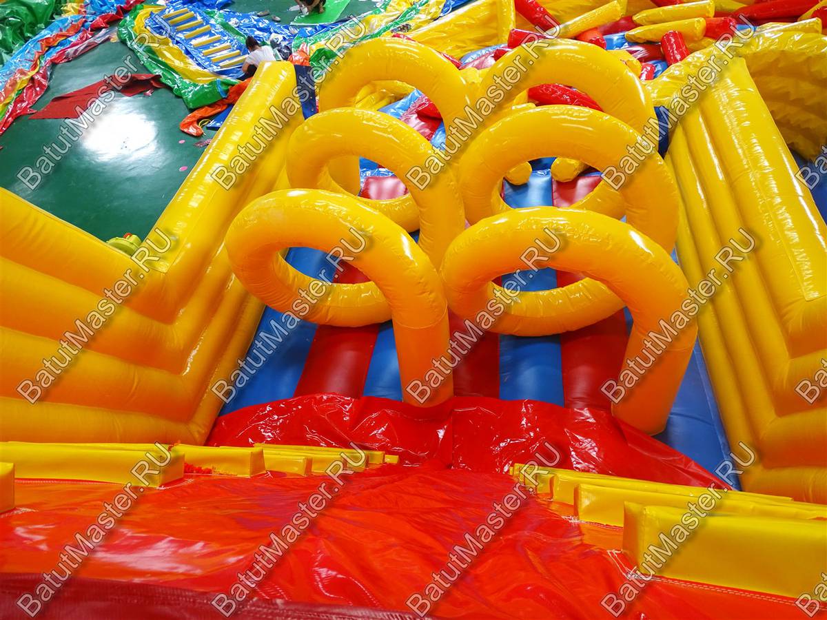 Игровой комплекс с препятствиями в виде эллипса с разными игровыми фигурамиНадувной батут в виде круглой полосы препятствий с игровыми фигурами, горками и скаламиБастионЭтот батут представляет собой целый игровой развлекательный комплекс в спортивном стиле с множеством препятствий и высокой скалой желтого цвета. По геометрической форме аттракцион напоминает сжатый эллипс, внутри которого пустота, поэтому он сможет подойти и для размещения на воде. Задняя и передняя крайние части изготовлены в виде двух полос для бега с препятствиями в виде надувных горизонтальных валиков самого разного цвета. За ними идут высокие треугольные турники и сама скала, превращающаяся в горку.Можно сказать, что вся территория батута – это сплошное место для прыжков и для бега с огромным набором игровых фигур разной модификации. Детям придется пролазить, перепрыгивать, обходить и т. д. Но в качестве вознаграждения с обеих сторон установлены горки, они обязательно ускорят процесс продвижения и дадут каждому ребенку получить свою долю удовольствия. Комплекс подойдет для проведения масштабных соревнований, его можно использовать на спортивных полях, пляжах. Он обладает максимальной проходимостью.