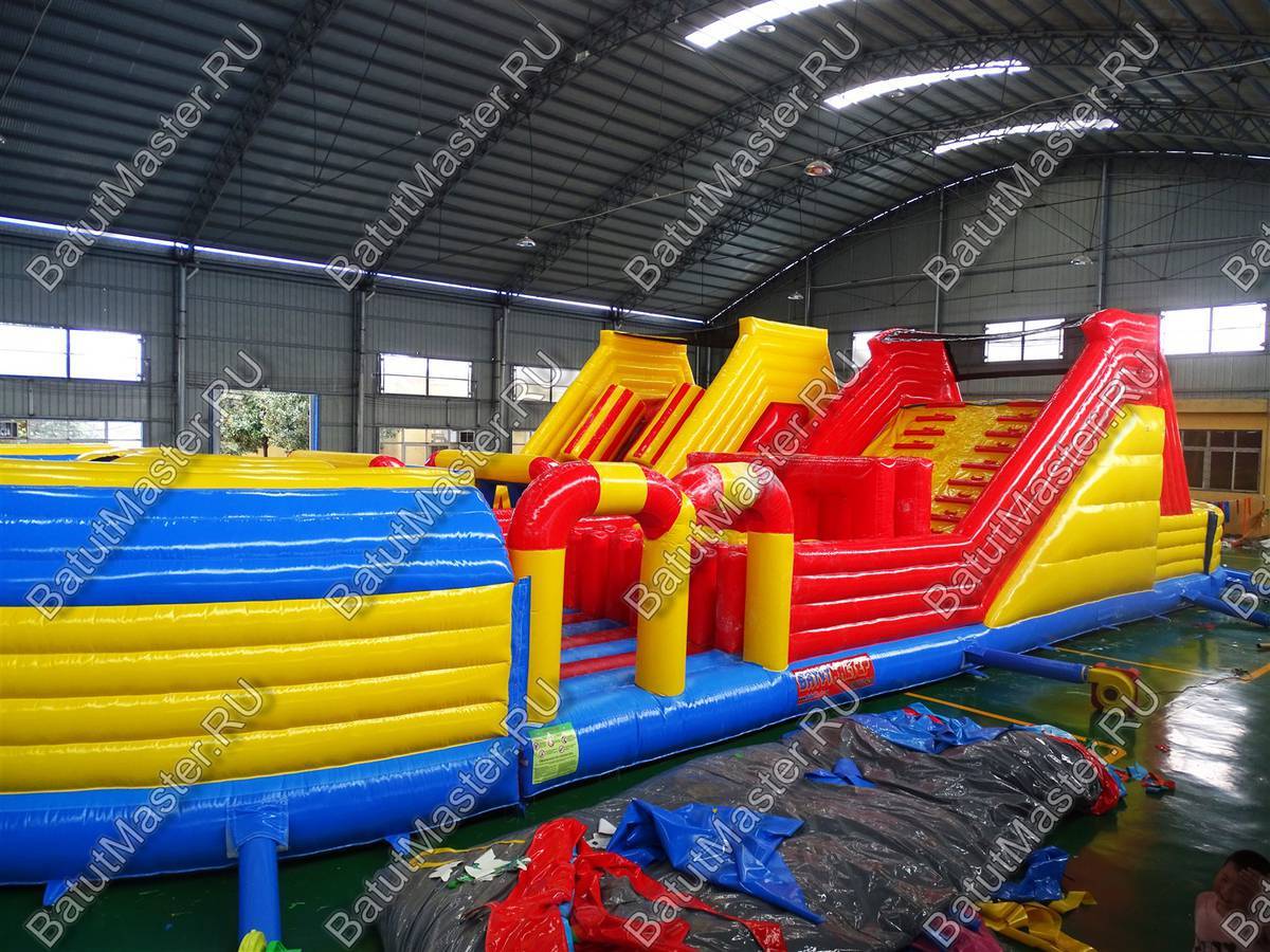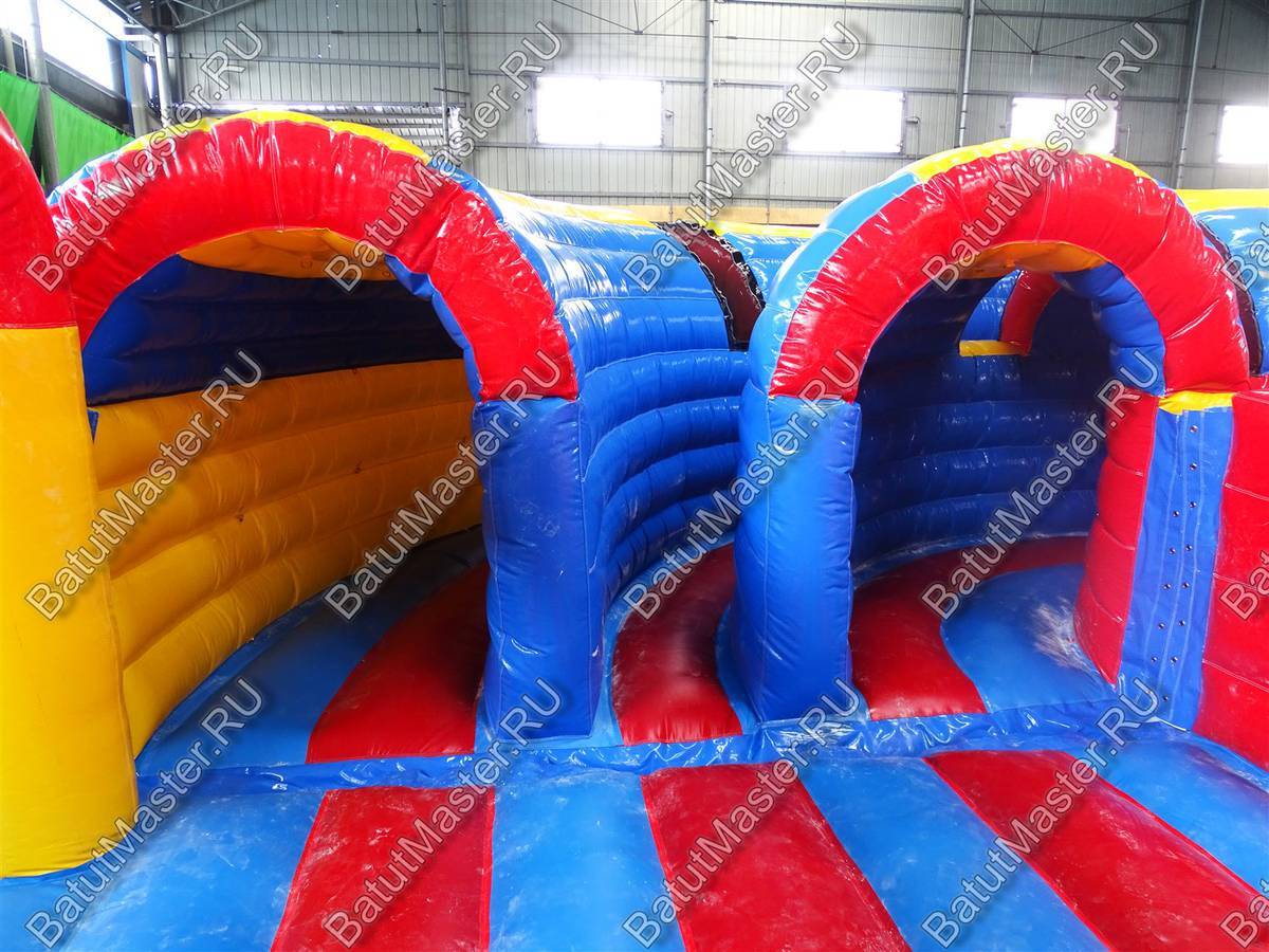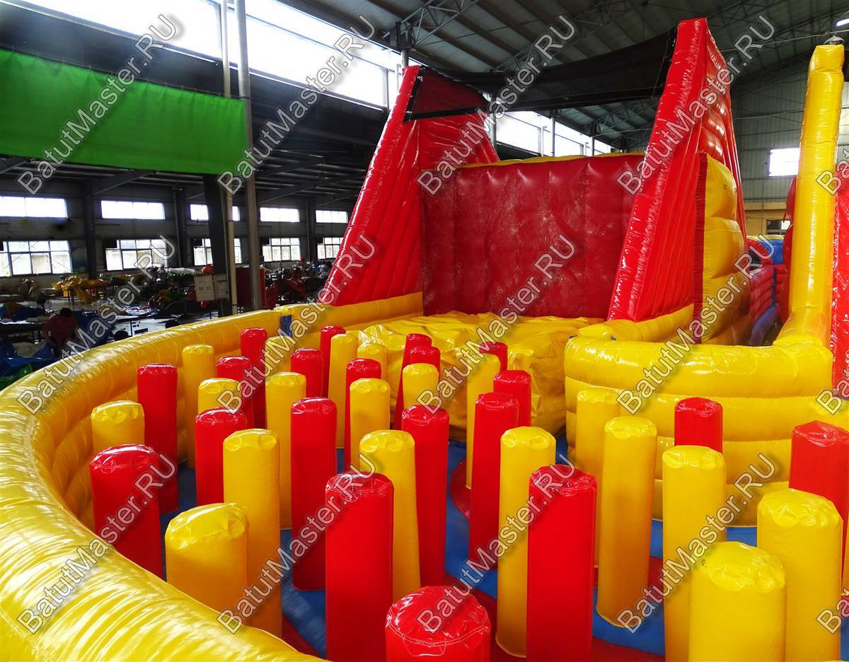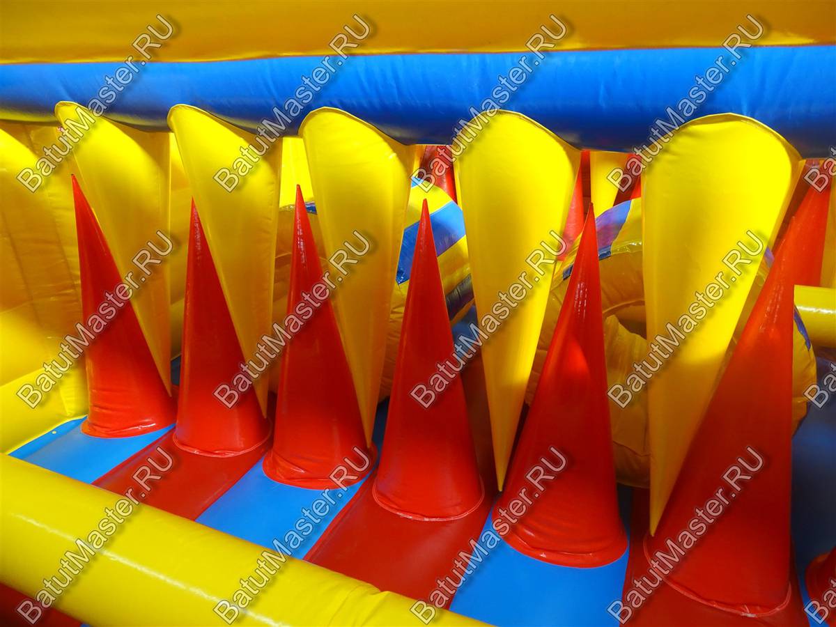 Игровой комплекс с препятствиями в виде эллипса с разными игровыми фигурамиНадувной батут в виде круглой полосы препятствий с игровыми фигурами, горками и скаламиБастионЭтот батут представляет собой целый игровой развлекательный комплекс в спортивном стиле с множеством препятствий и высокой скалой желтого цвета. По геометрической форме аттракцион напоминает сжатый эллипс, внутри которого пустота, поэтому он сможет подойти и для размещения на воде. Задняя и передняя крайние части изготовлены в виде двух полос для бега с препятствиями в виде надувных горизонтальных валиков самого разного цвета. За ними идут высокие треугольные турники и сама скала, превращающаяся в горку.Можно сказать, что вся территория батута – это сплошное место для прыжков и для бега с огромным набором игровых фигур разной модификации. Детям придется пролазить, перепрыгивать, обходить и т. д. Но в качестве вознаграждения с обеих сторон установлены горки, они обязательно ускорят процесс продвижения и дадут каждому ребенку получить свою долю удовольствия. Комплекс подойдет для проведения масштабных соревнований, его можно использовать на спортивных полях, пляжах. Он обладает максимальной проходимостью.