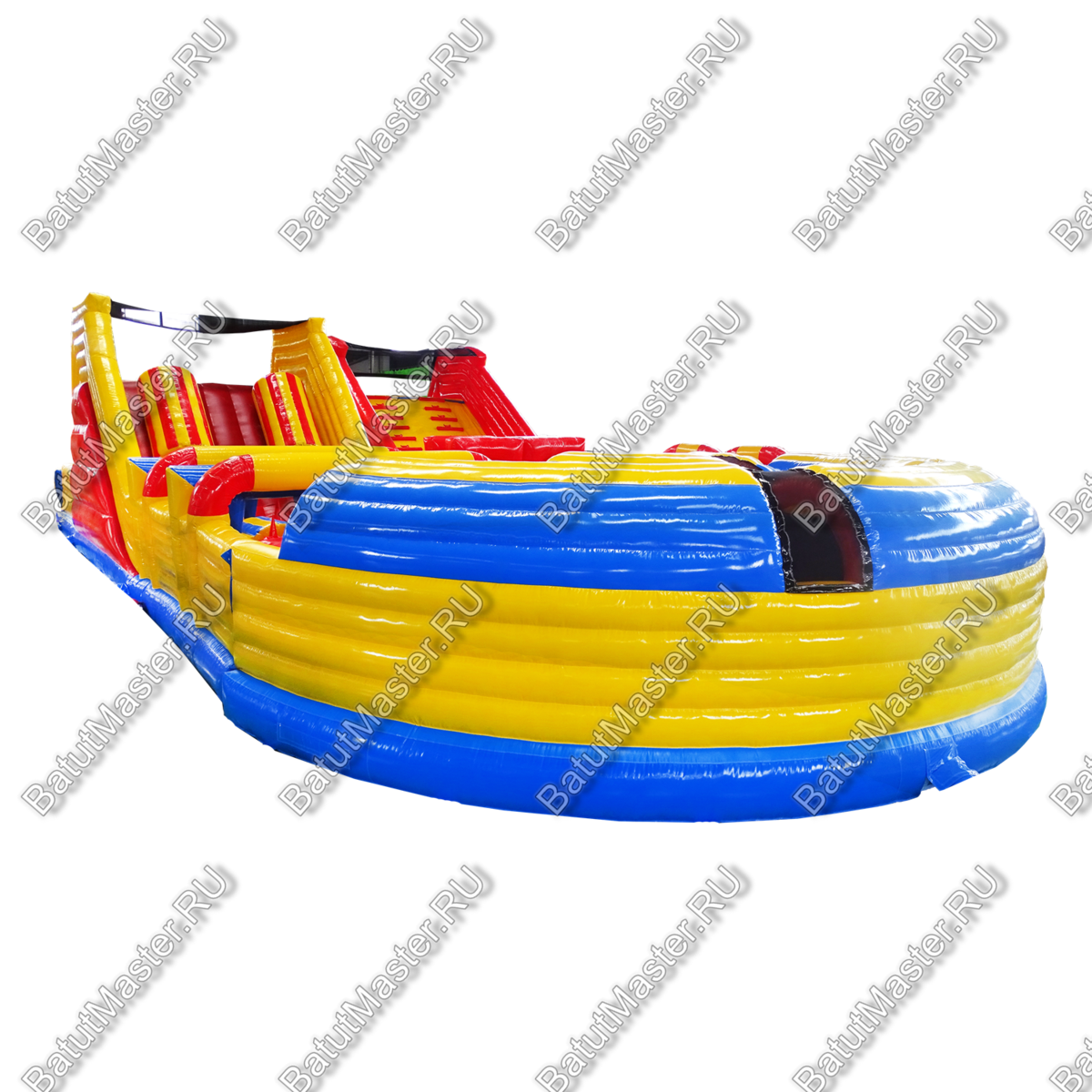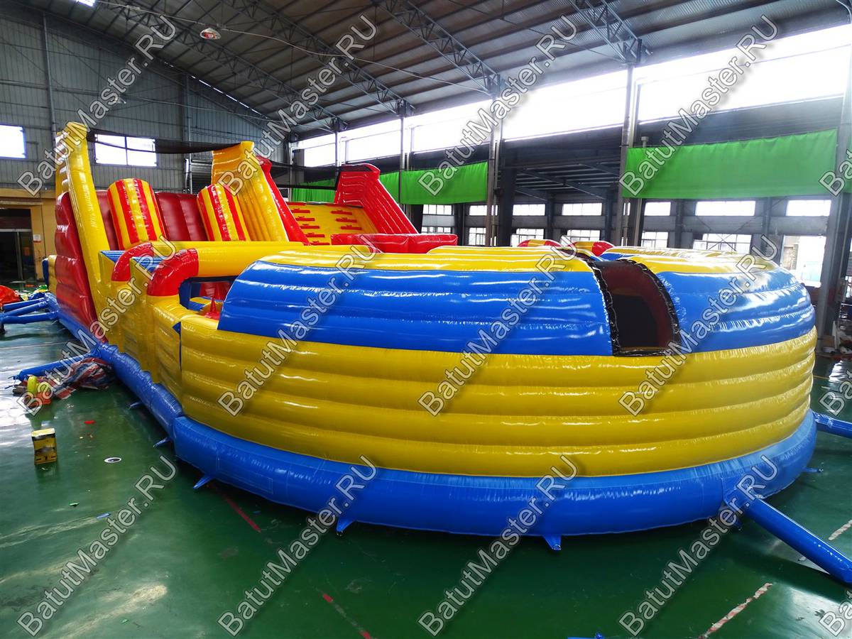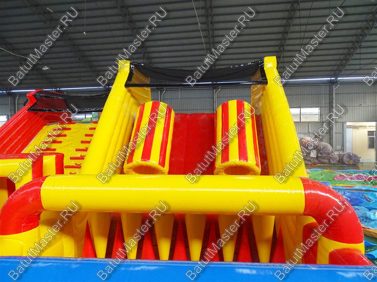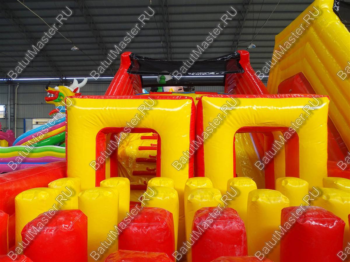 Игровой комплекс с препятствиями в виде эллипса с разными игровыми фигурамиНадувной батут в виде круглой полосы препятствий с игровыми фигурами, горками и скаламиБастионЭтот батут представляет собой целый игровой развлекательный комплекс в спортивном стиле с множеством препятствий и высокой скалой желтого цвета. По геометрической форме аттракцион напоминает сжатый эллипс, внутри которого пустота, поэтому он сможет подойти и для размещения на воде. Задняя и передняя крайние части изготовлены в виде двух полос для бега с препятствиями в виде надувных горизонтальных валиков самого разного цвета. За ними идут высокие треугольные турники и сама скала, превращающаяся в горку.Можно сказать, что вся территория батута – это сплошное место для прыжков и для бега с огромным набором игровых фигур разной модификации. Детям придется пролазить, перепрыгивать, обходить и т. д. Но в качестве вознаграждения с обеих сторон установлены горки, они обязательно ускорят процесс продвижения и дадут каждому ребенку получить свою долю удовольствия. Комплекс подойдет для проведения масштабных соревнований, его можно использовать на спортивных полях, пляжах. Он обладает максимальной проходимостью.