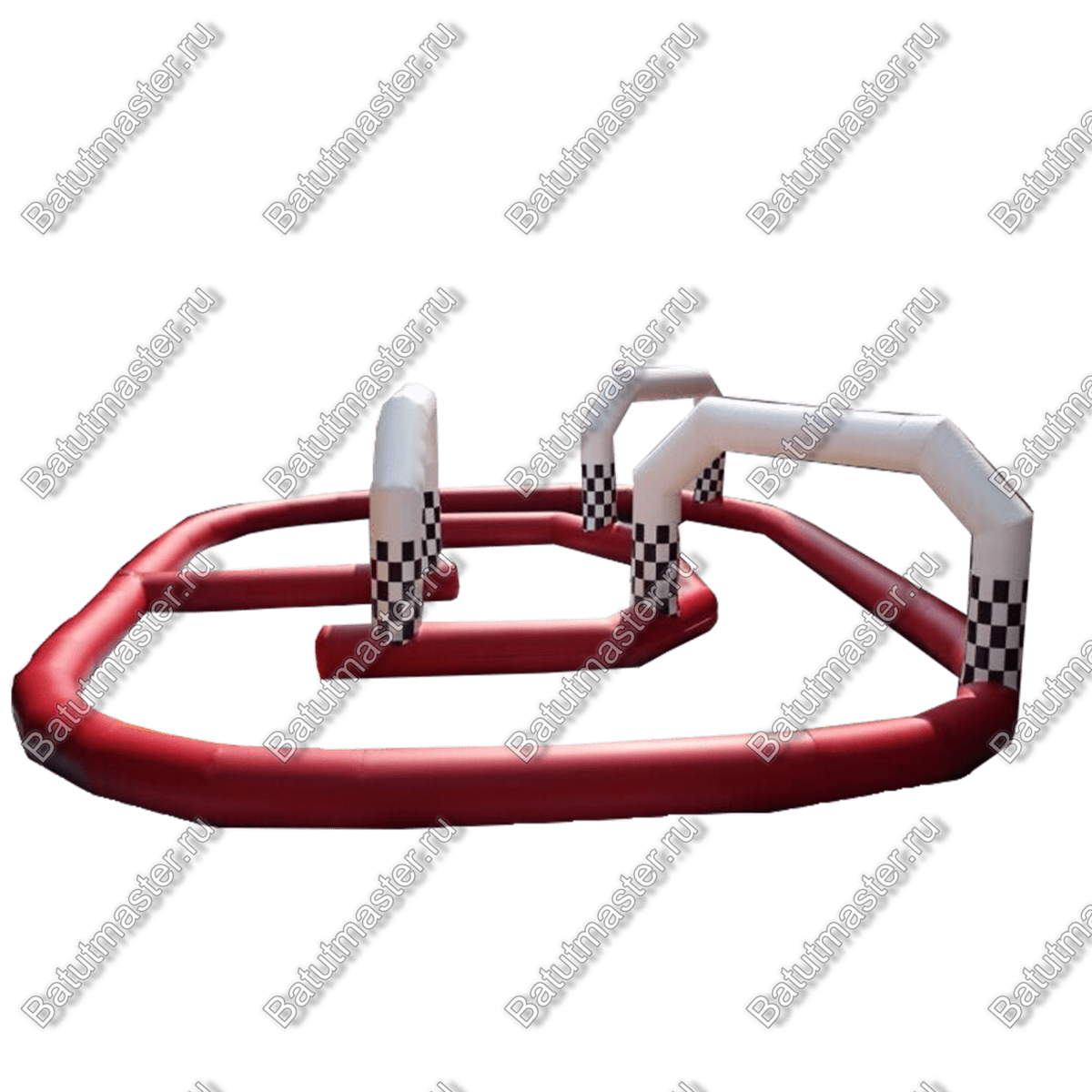 Надувная трасса «Гонка» сделана из пвх высокого качества и отличается высокими эксплуатационными свойствами. Держит форму она благодаря постоянной подкачке воздухом. Изделие дополнено высокими арками белого цвета с черными кубиками, в то время как сама конструкция сделана в красном цвете.
