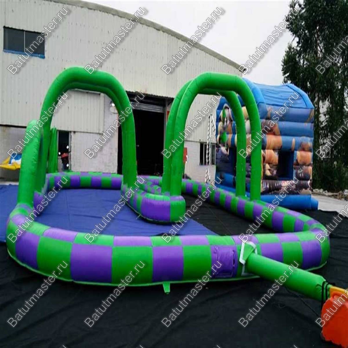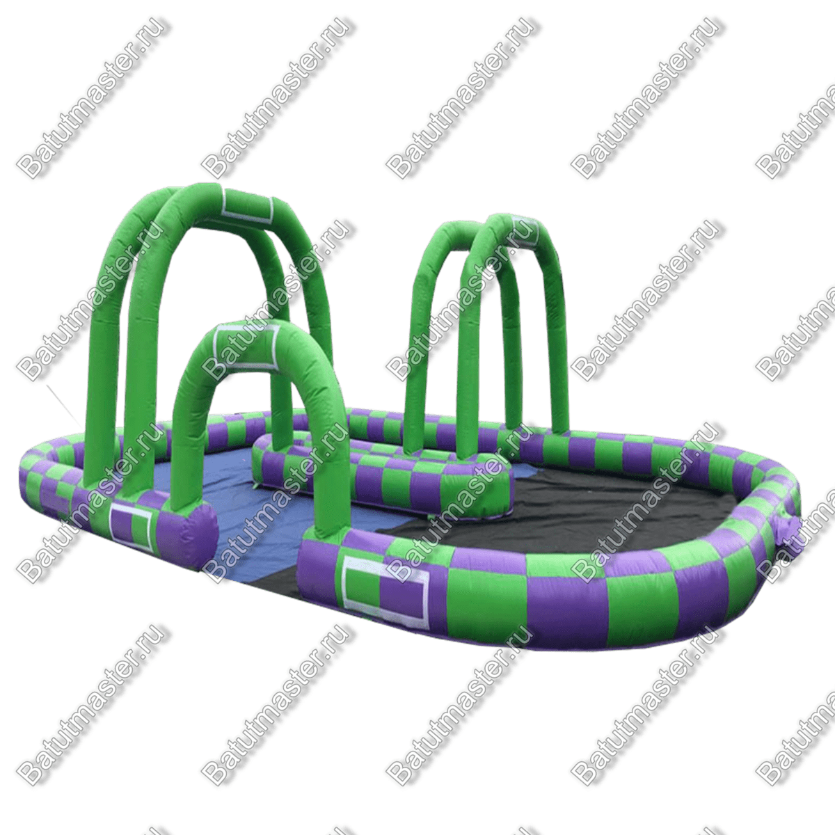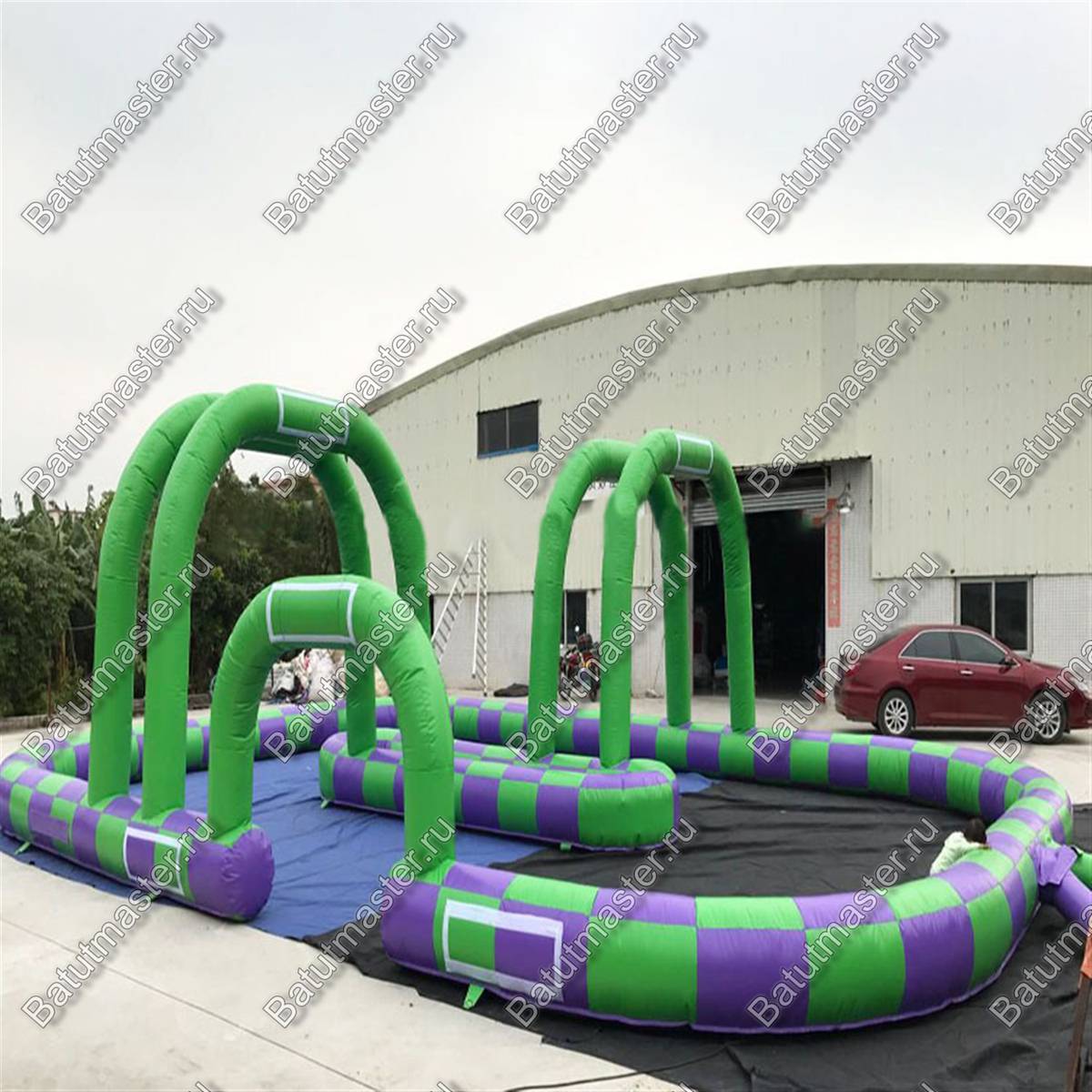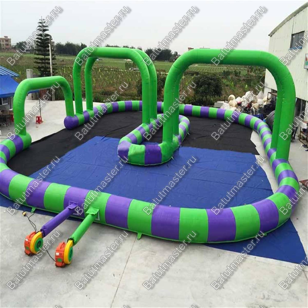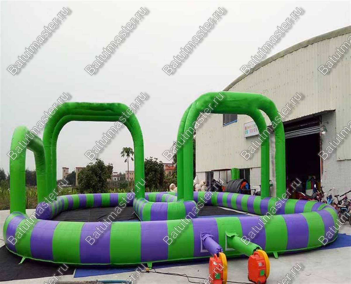 Надувная трасса «Мини» имеет высокие арки, что обозначает зоны заезда и поворотов. Работает она от постоянной подкачки воздухом и для нее достаточно одного мощного компрессора.
