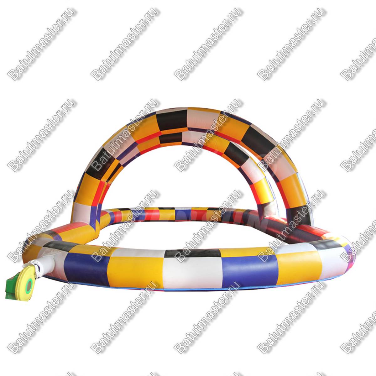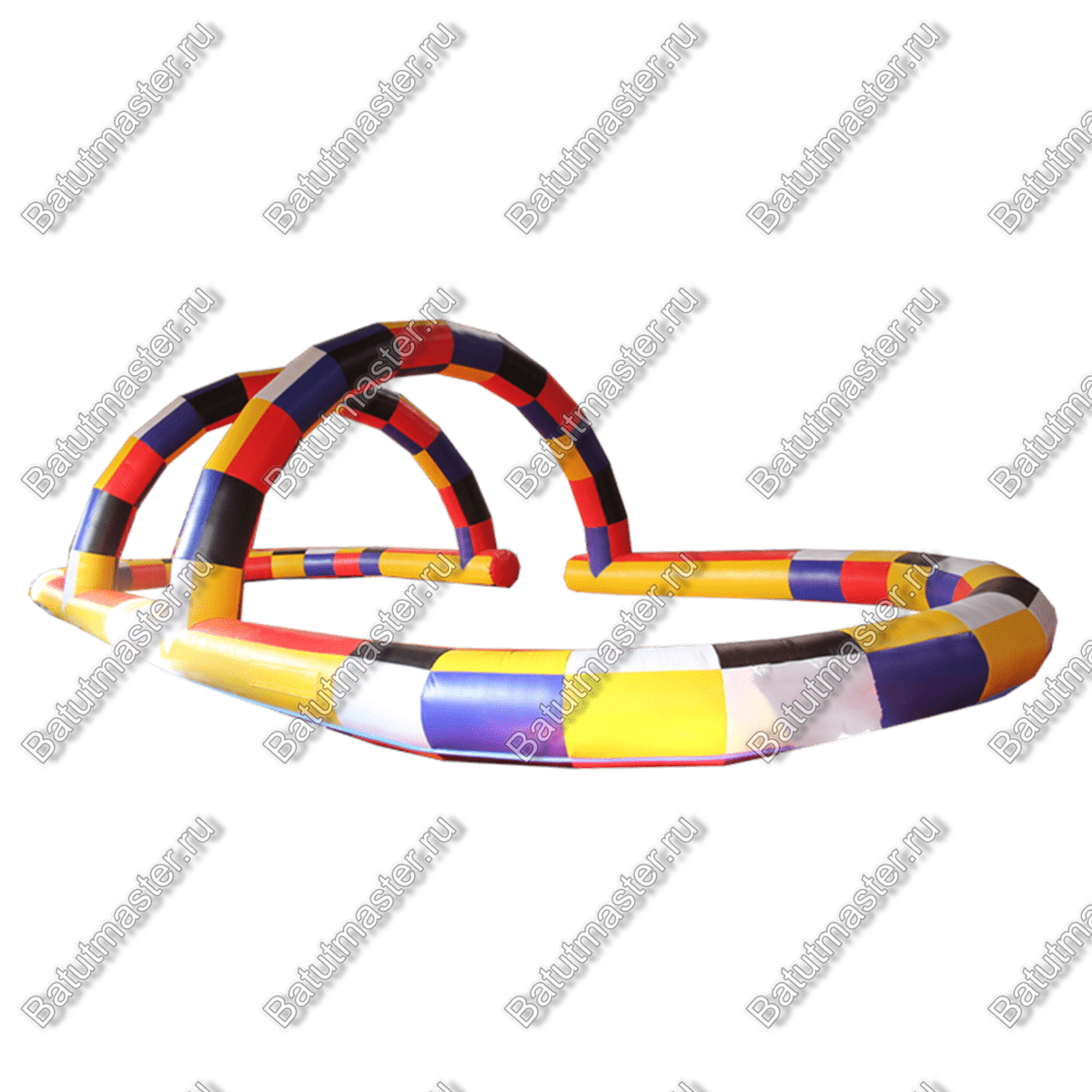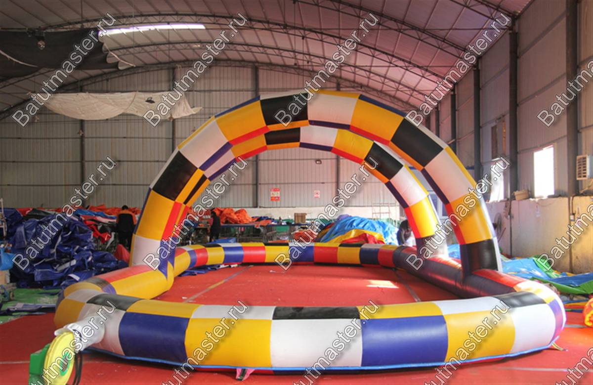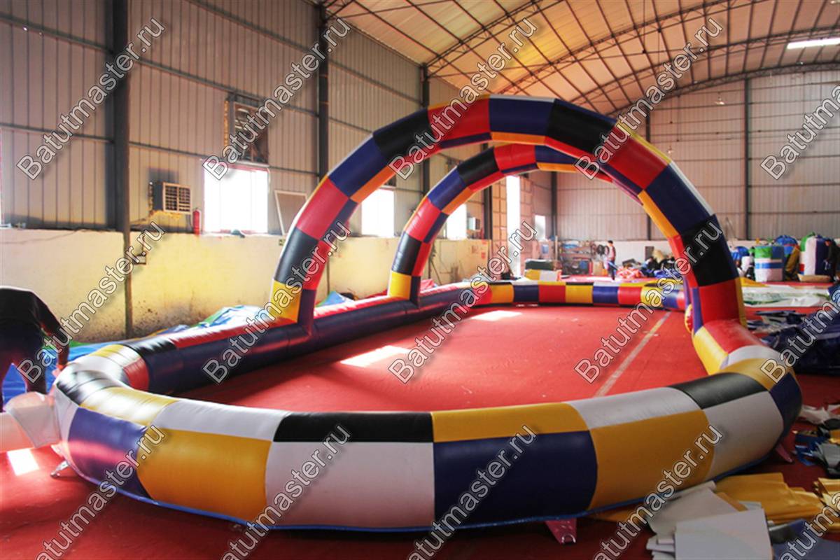 Надувная трасса в данной модификации играет буйством красок и сразу бросается в глаза. Она имеет декоративные воздушные арки, выполненные в том же стиле. Так, массивные плотные борта не дадут выехать за пределы конструкции или испортить транспорт. Получить травму в таком пространстве также невозможно, для этого и предусмотрены заграждения, которые заполняются воздухом.