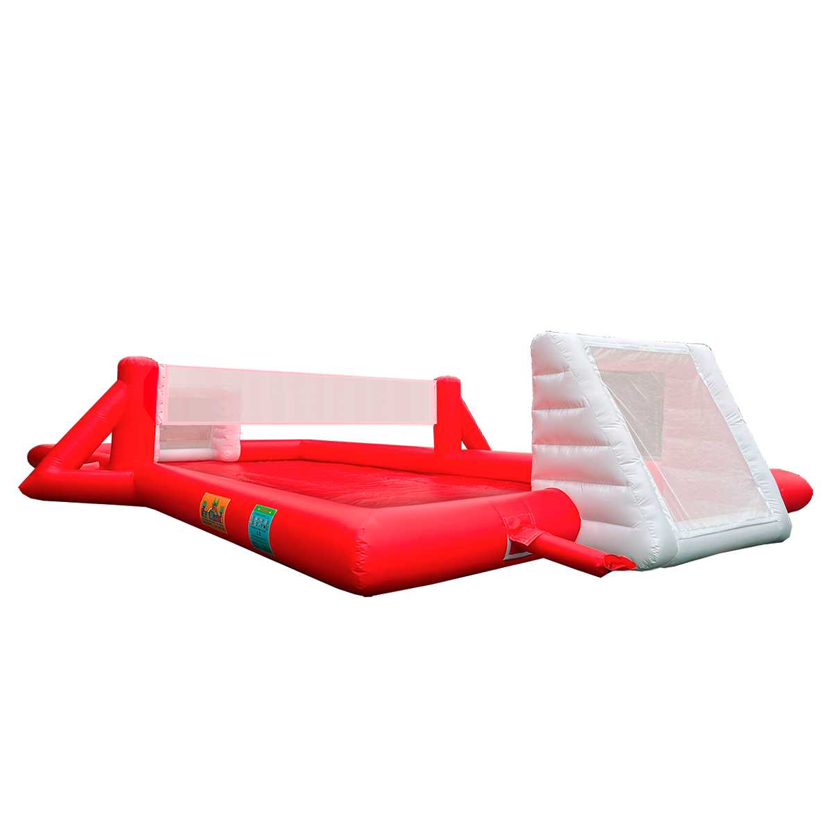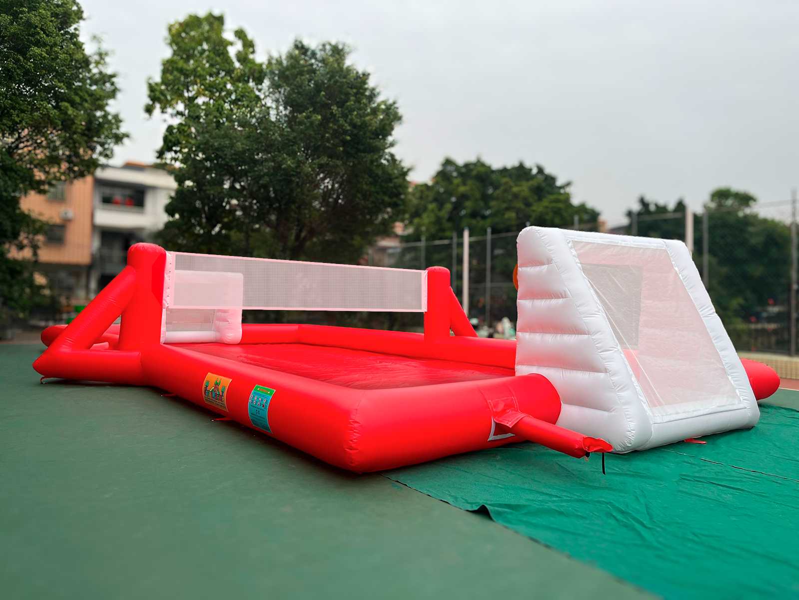 Безопасность игроков обеспечивается мягкими надувными бортами, которые защищают от ударов и падений. Все швы сварены внахлест шириной 2,5 см, что предотвращает утечку воздуха и обеспечивает долгосрочную герметичность. Материал устойчив к ультрафиолету, температурным перепадам и механическим воздействиям, сохраняя свою прочность даже при активной эксплуатации на открытом воздухе.
