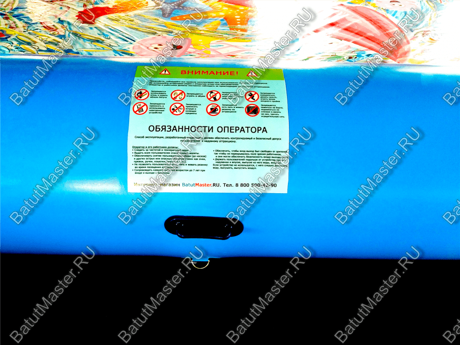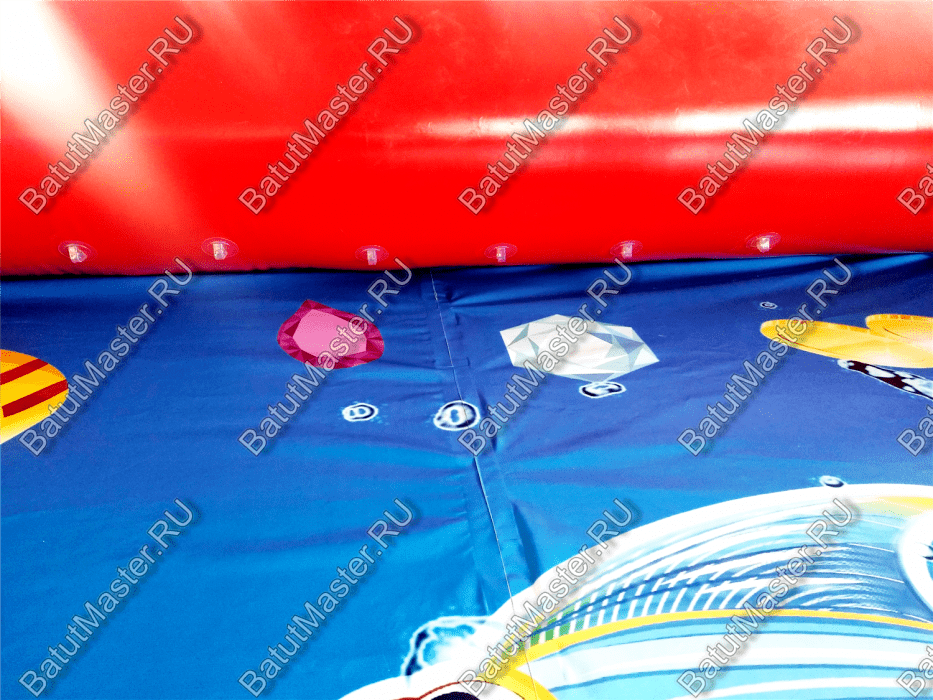 Этот бассейн выполнен из армированного непрозрачного ПВХ толщиной 0,9 мм и плотностью 1100 г/м² — один из самых прочных и надёжных материалов в индустрии надувных аттракционов. Все швы выполнены с использованием технологии сварки внахлёст (2,5 см), что обеспечивает максимальную герметичность и устойчивость к разрывам.