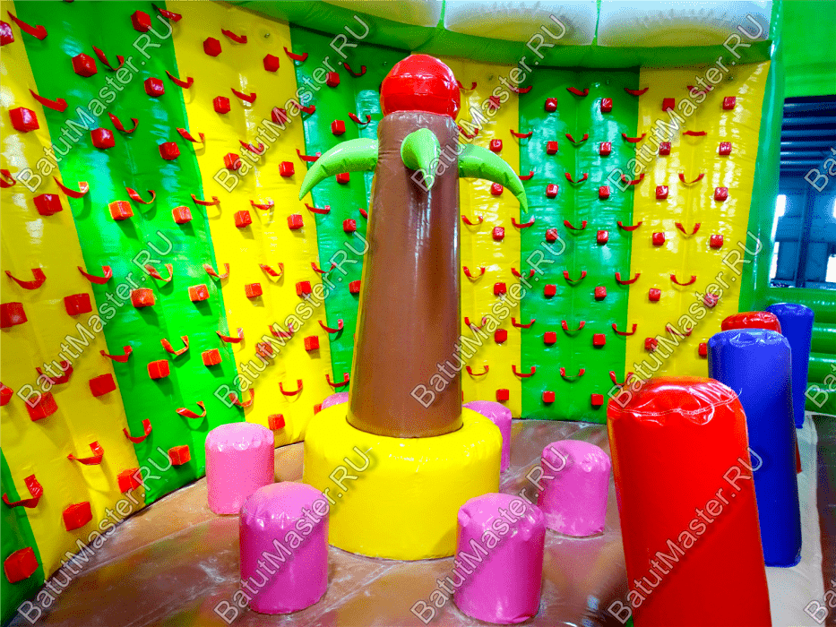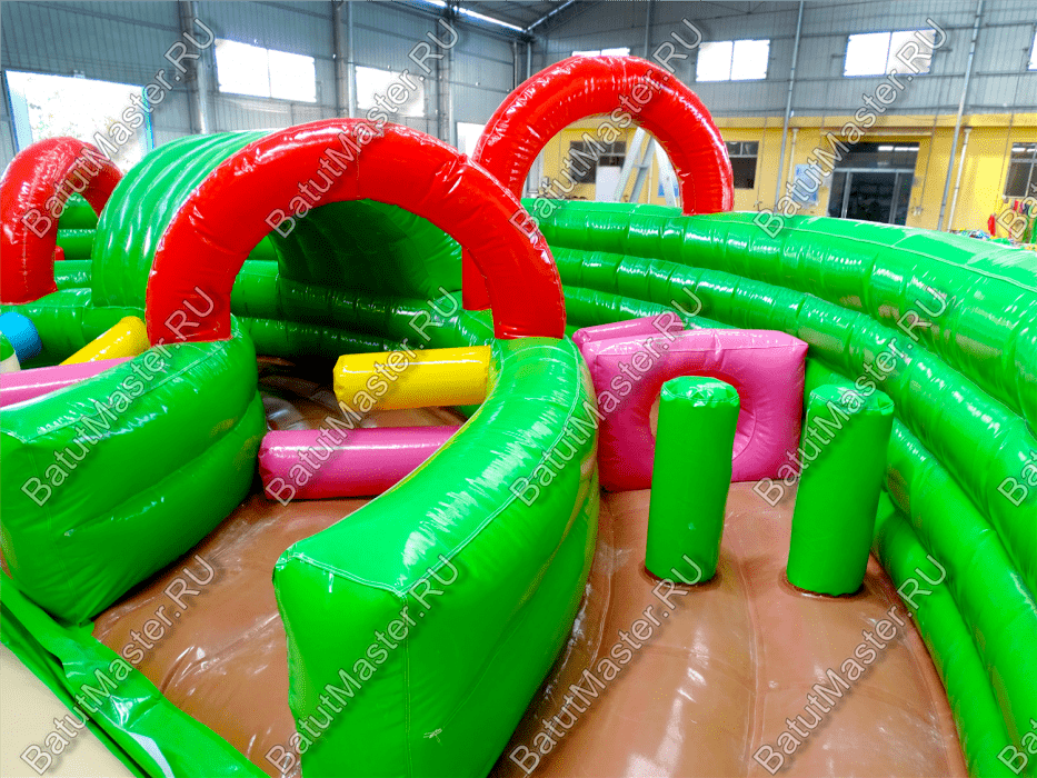 Он состоит из одного большого места для прыжков и для бега, на котором установлены самые разнообразные препятствия. Персонажи из мультфильмов сменяются пальмами, горками, арками, тоннелями. Также есть отдельные участки, которые больше напоминают спортивные уголки. Учитывая размеры площадки, можно сказать, что на ней могут вместиться сразу все желающие и для каждого здесь найдется свое индивидуальное место. Задняя стенка более высокая, чем все остальные, она подойдет для игр более взрослых детей, а на переднем плане расположены более простые элементы, которые обязательно покажутся интересными для малышей.