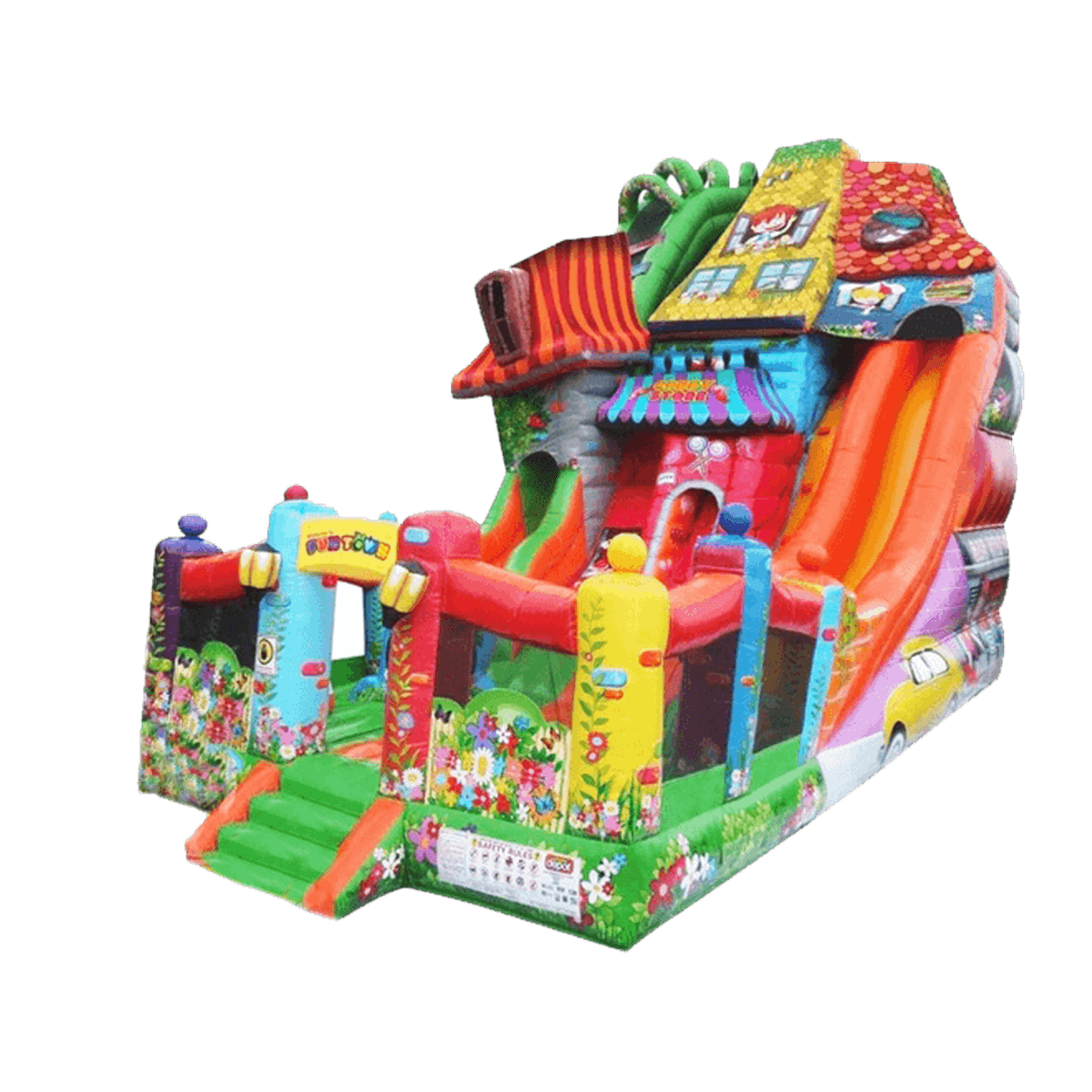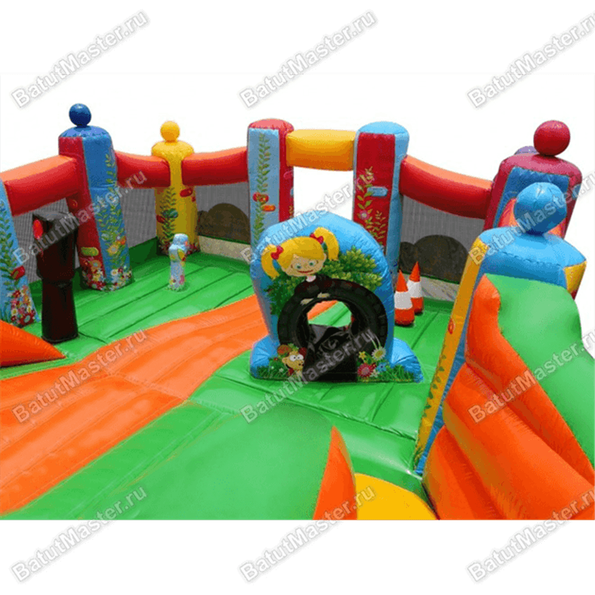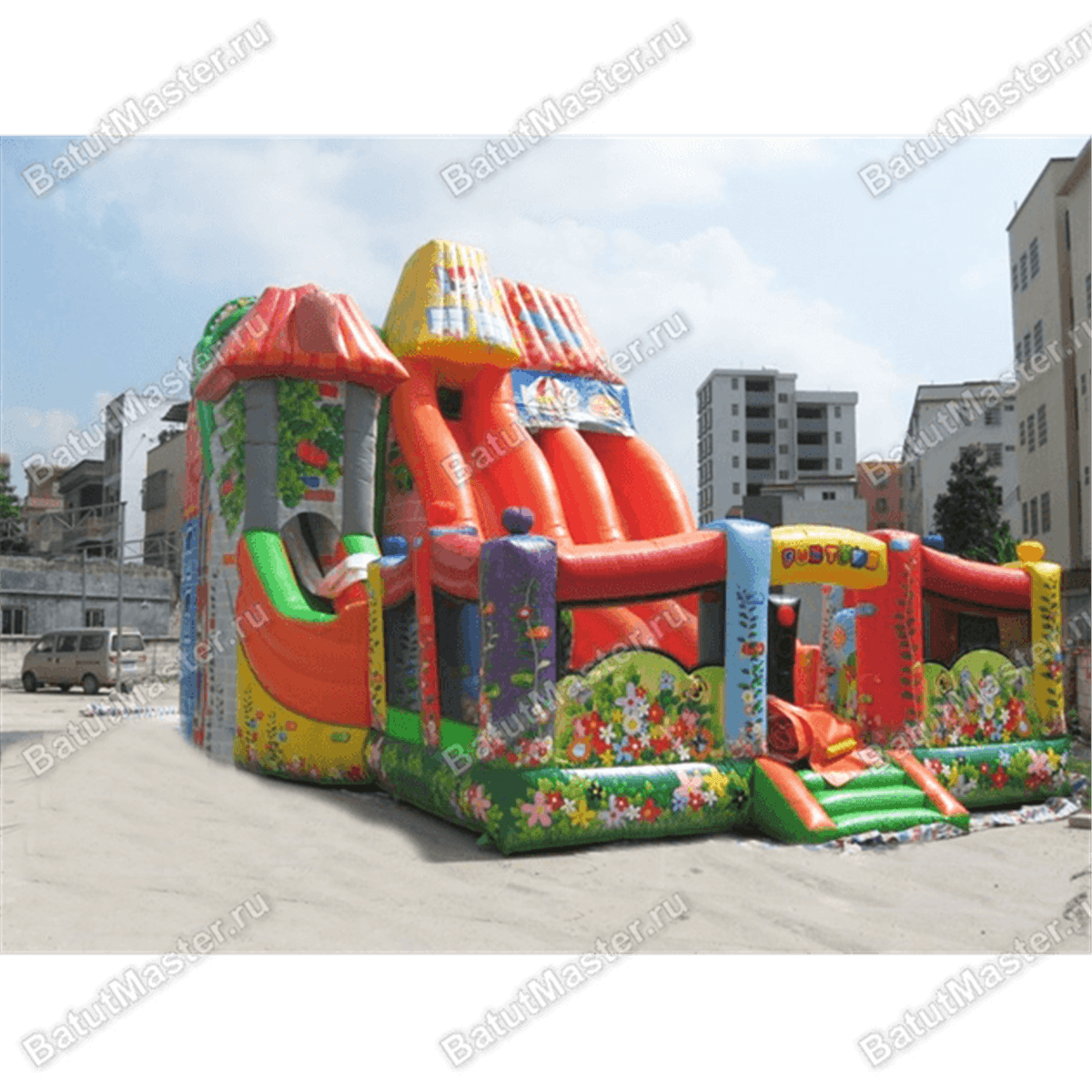 Если заднюю стенку создают стороны конструкций, то боковые и передняя стены состоят из вертикальных опор-колонн, между которыми натянута прозрачная сетка для создания максимально безопасной атмосферы своим посетителям. Нижний слой яркого батута, то есть подушка, на которой установлены все конструкции, может быть желтым или зеленым цветом, но она обязательно будет украшена изображением цветов. Всю конструкцию, в целом, можно назвать одной огромной батут-горкой из нескольких надувных коттеджей. Необычный дизайн обязательно привлечет маленьких любителей приключений.
