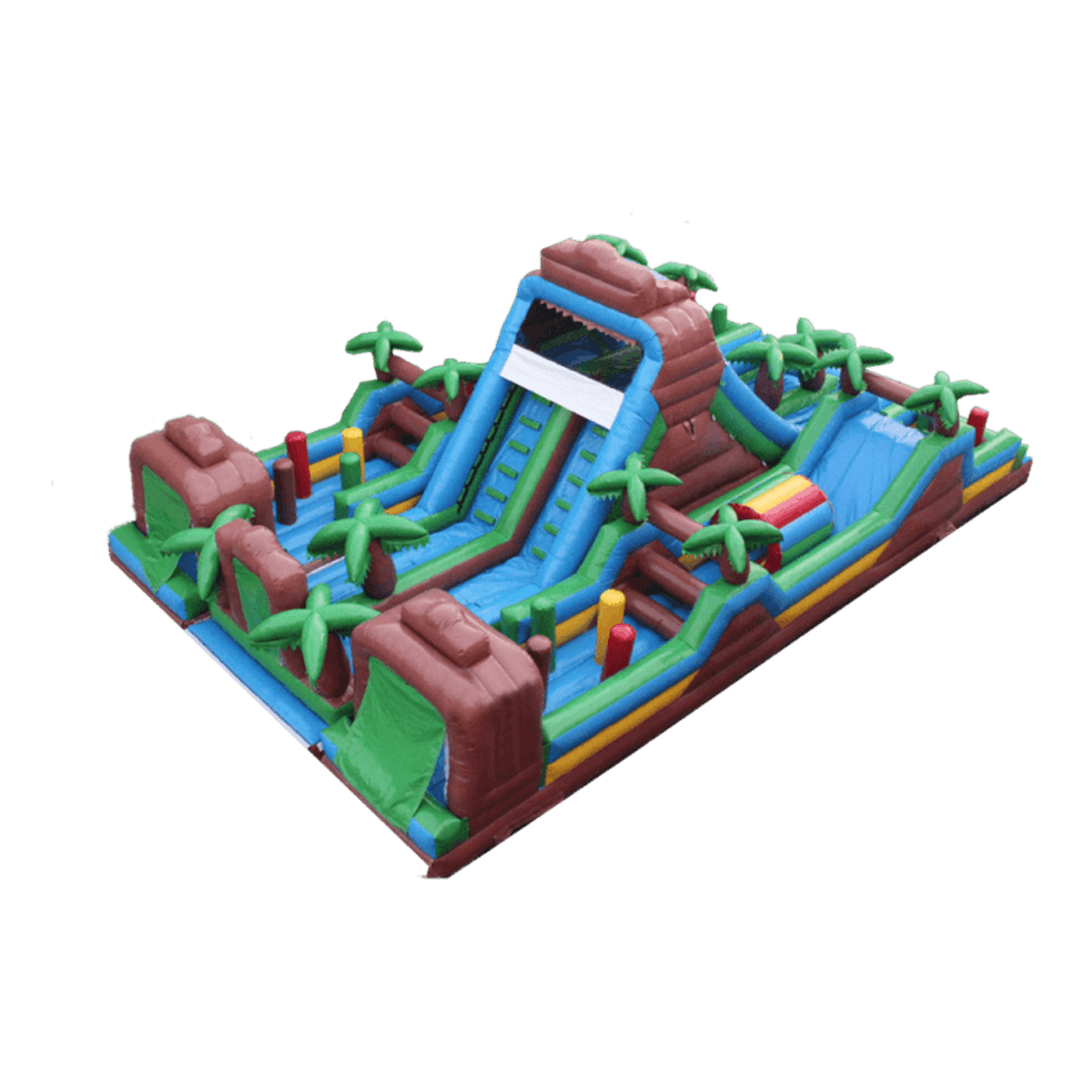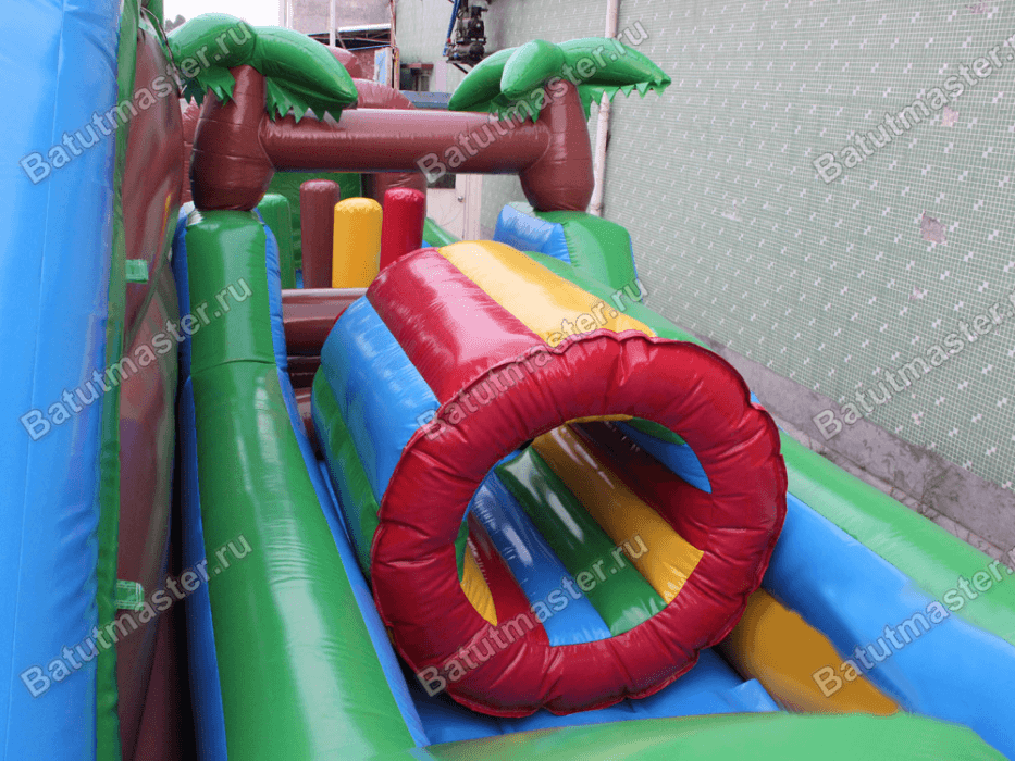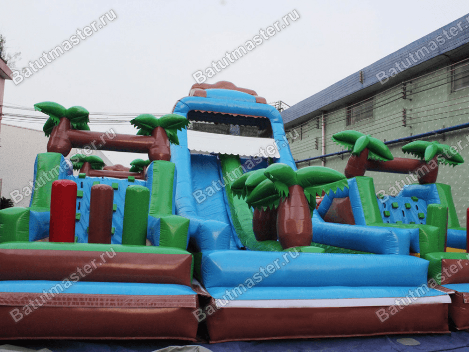 Ни что не привлекает детей с такой силой, как экзотическая природа и животный мир. Познакомиться и побывать внутри такой атмосферы – настоящее наслаждение для каждого ребенка. Яркий батут продуман до мелочей: в любой зоне найдутся надувные коричнево-зеленые пальмы, яркие вертикальные валики разного цвета, мягкие барабаны, сквозь которые можно пролазить. Но основное внимание ребенка будет приковывать высокая двойная горка посреди надувного батута с небольшой площадкой сверху. Хотя вокруг установлены и другие спуски, но этот из них самый высокий и широкий.
