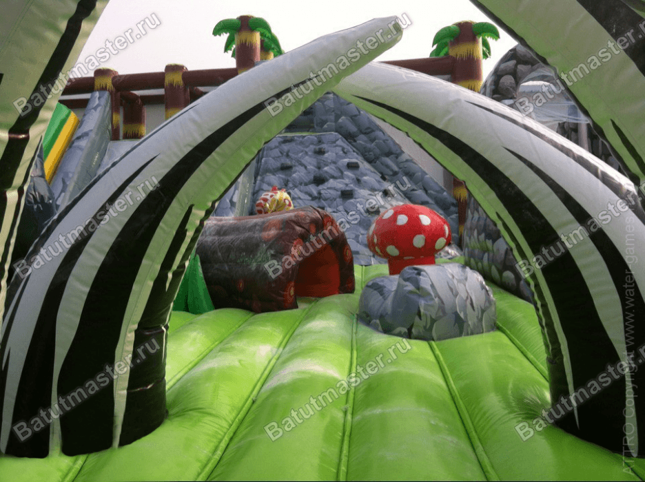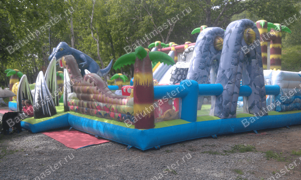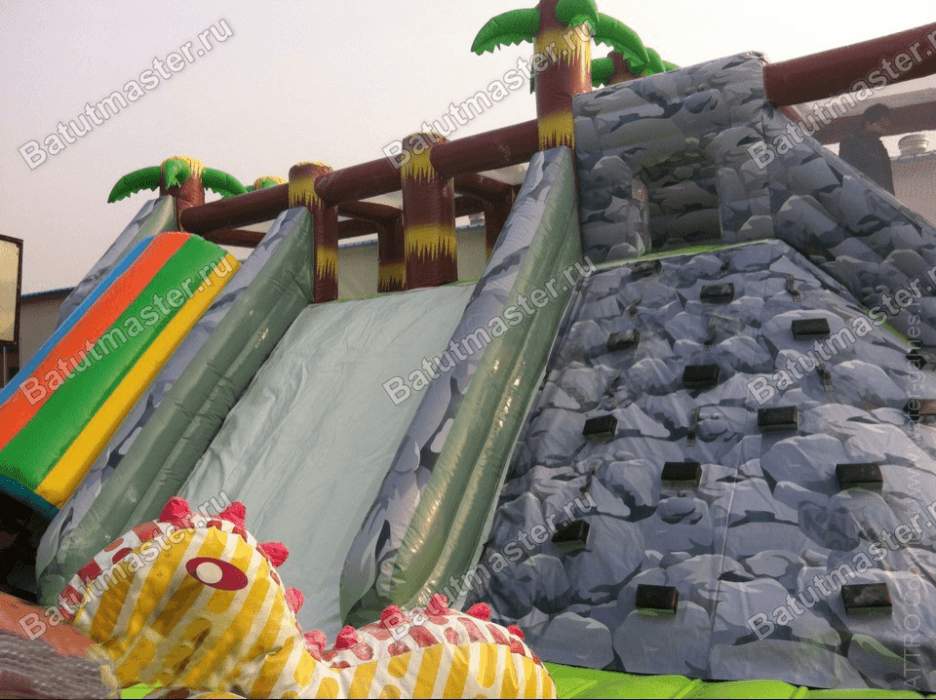 Что может быть интересней для детей, чем динозавры, которые вымерли множество тысячелетий назад? Несложно представить какой интерес вызывает надувной батут из ПВХ, сшитый как раз в этой тематике. Огромные фигуры исторических животных в нескольких местах украшают уличный батут, а вход обрамляют высокие клыки доисторических животных. Правая часть задней стенки занята двумя спусками: один в виде разноцветного туннеля, а второй выполнен просто из белого полотна ПВХ, еще правее установлен высокий скалодром серого цвета, который имитирует настоящий природный камень.