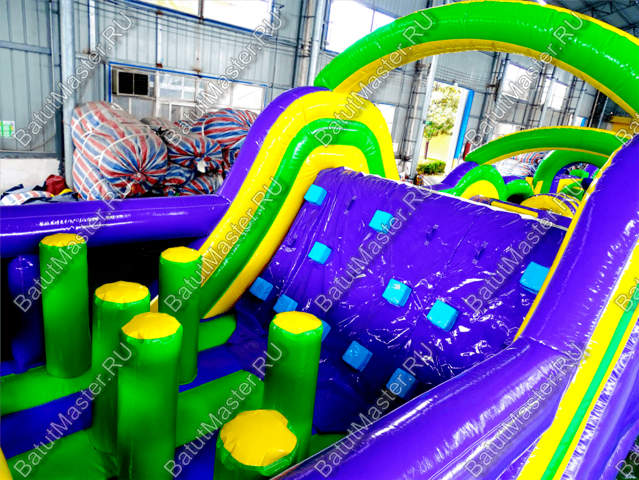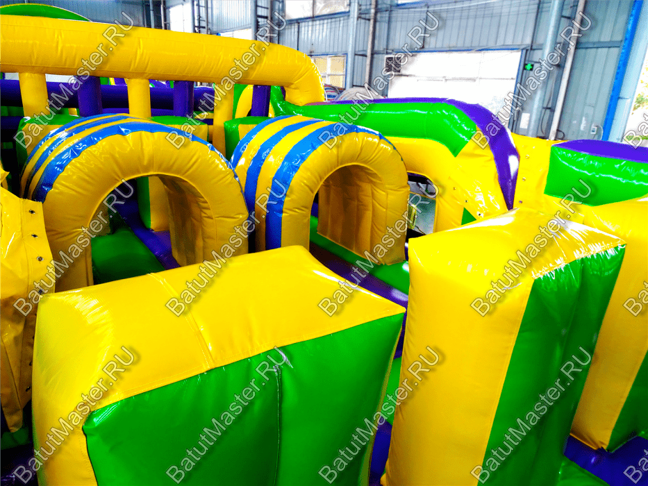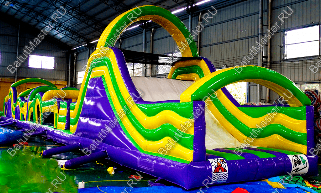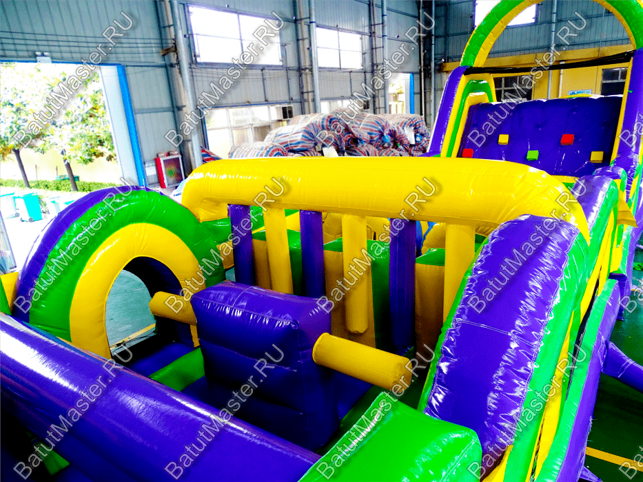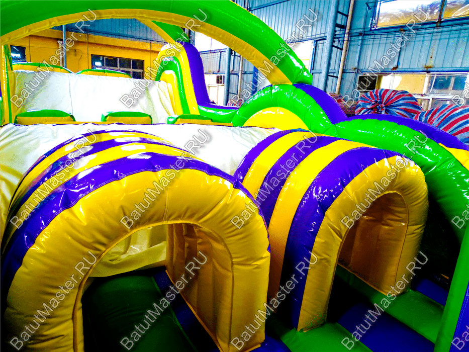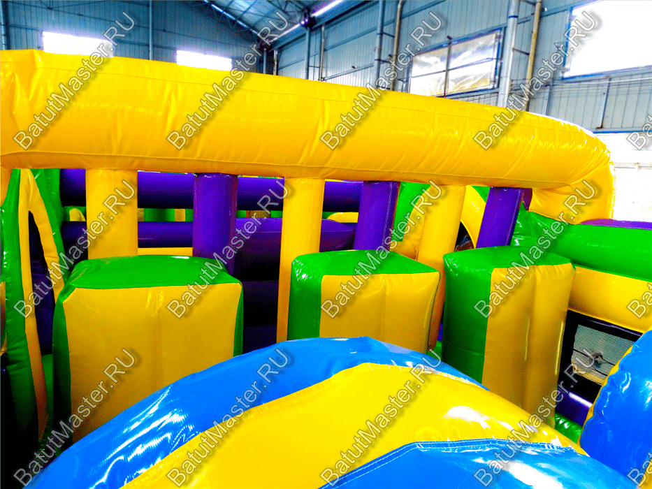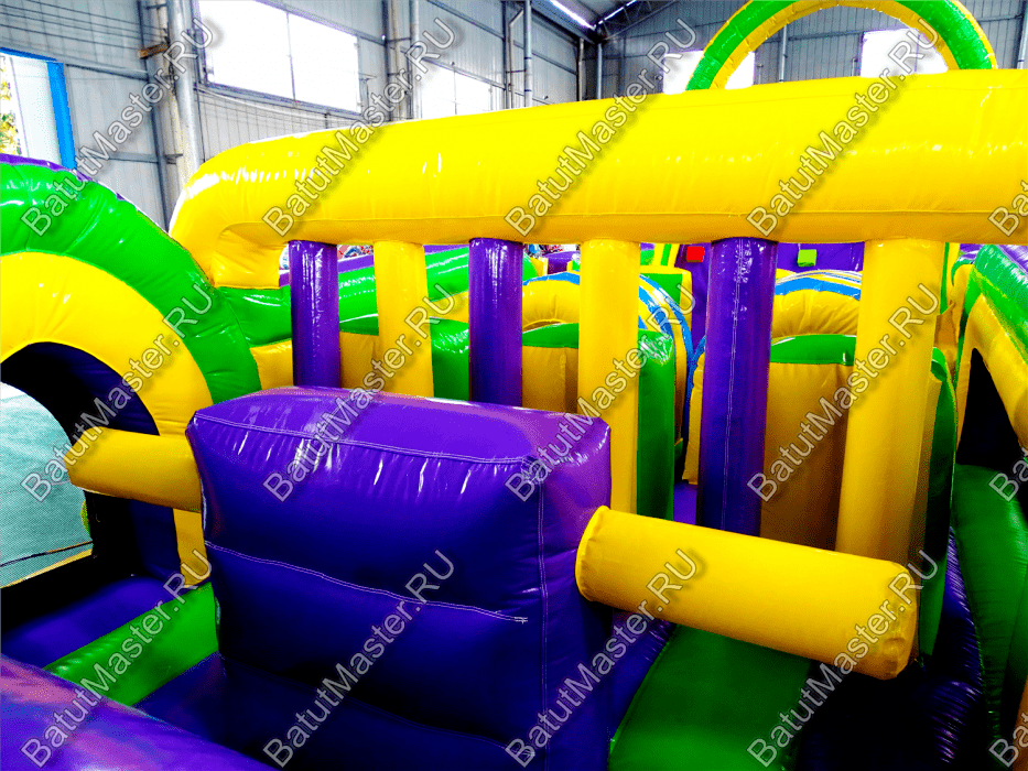 Длинная полоса препятствий на самом деле является надувным батутом с размерами 29 на 4 м. На территории площадки собрано более 15 зон, где каждая отделена друг от друга территориально и представлена надувным препятствием из ПВХ. Самое интересное, что почти в обоих концах коммерческого аттракциона установлены горки с дугообразными арками, а их лестницы представлены скалодромами. Но начинается полоса с самого забавного препятствия на площадке – проема в виде человеческой фигуры, которую можно преодолеть только в определенной позе. Дальше зона со столбиками сменится первой горкой, а за ней начнется чреда настоящих препятствий: параллелепипеды, холм с лестницей, 2 тоннеля, арки, столбики, горизонтальные планки, турники, еще раз арки и в завершение - горка, но уже более высокая, чем первая. Спустившись с нее, ребенок может сойти с батута и вернуться на исходную точку. Также можно постараться побороть полосу препятствий, двигаясь в обратном направлении.