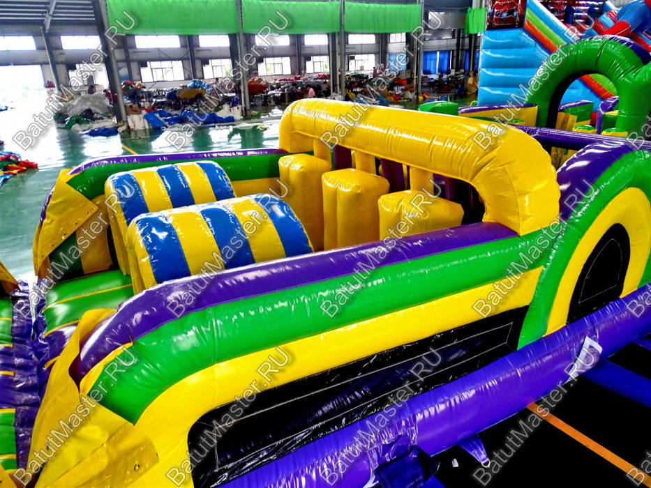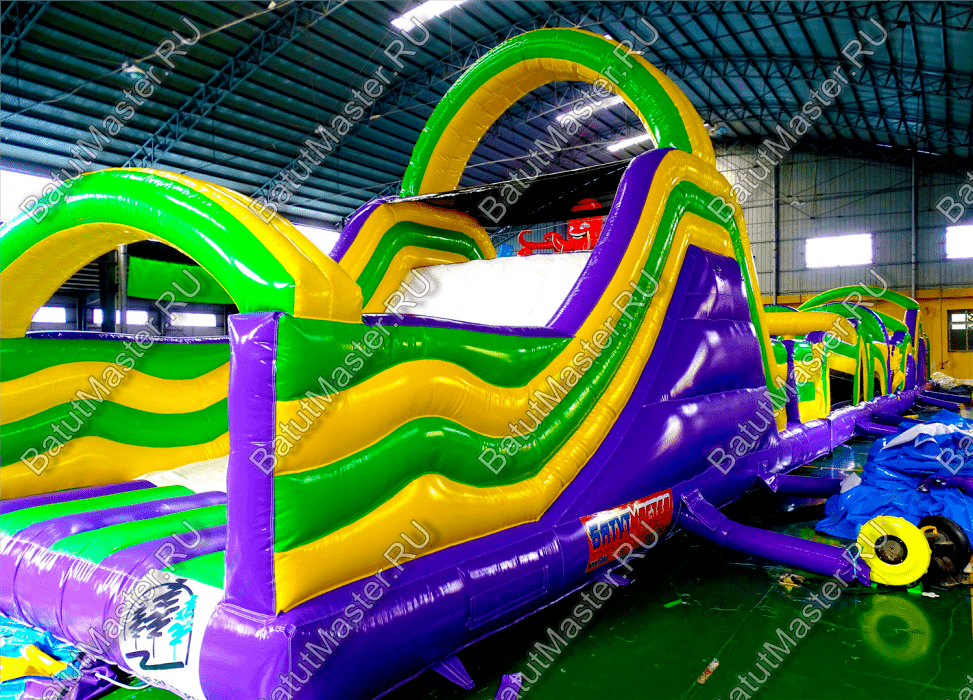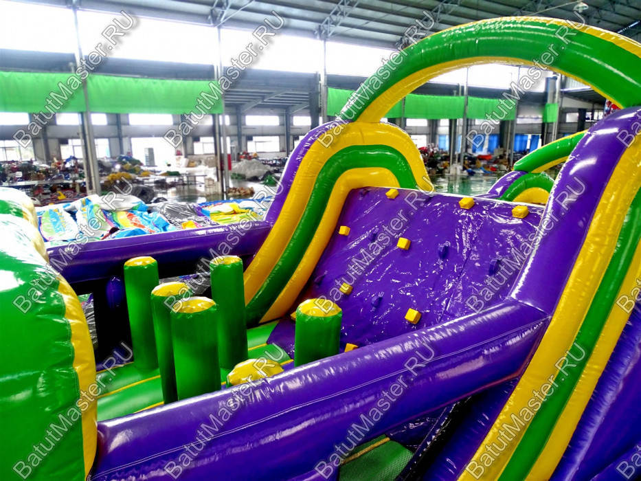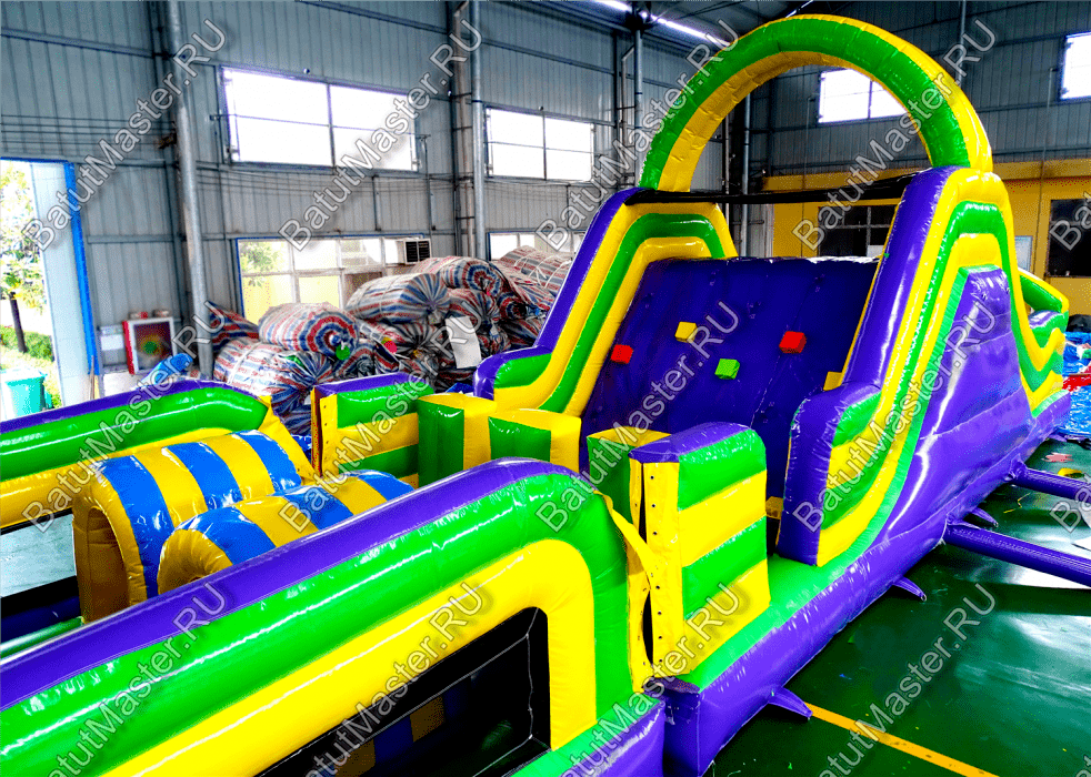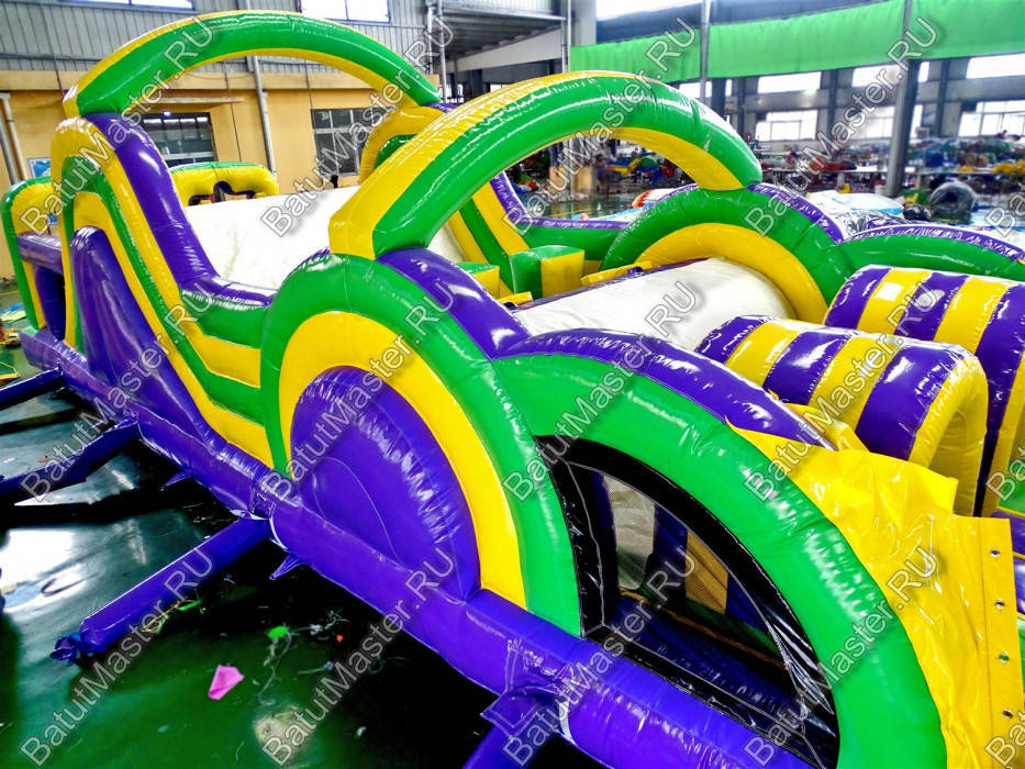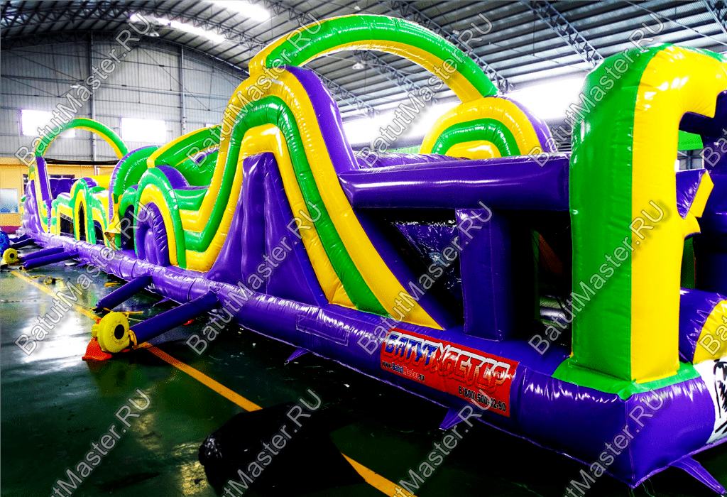 Длинная полоса препятствий на самом деле является надувным батутом с размерами 29 на 4 м. На территории площадки собрано более 15 зон, где каждая отделена друг от друга территориально и представлена надувным препятствием из ПВХ. Самое интересное, что почти в обоих концах коммерческого аттракциона установлены горки с дугообразными арками, а их лестницы представлены скалодромами. Но начинается полоса с самого забавного препятствия на площадке – проема в виде человеческой фигуры, которую можно преодолеть только в определенной позе. Дальше зона со столбиками сменится первой горкой, а за ней начнется чреда настоящих препятствий: параллелепипеды, холм с лестницей, 2 тоннеля, арки, столбики, горизонтальные планки, турники, еще раз арки и в завершение - горка, но уже более высокая, чем первая. Спустившись с нее, ребенок может сойти с батута и вернуться на исходную точку. Также можно постараться побороть полосу препятствий, двигаясь в обратном направлении.