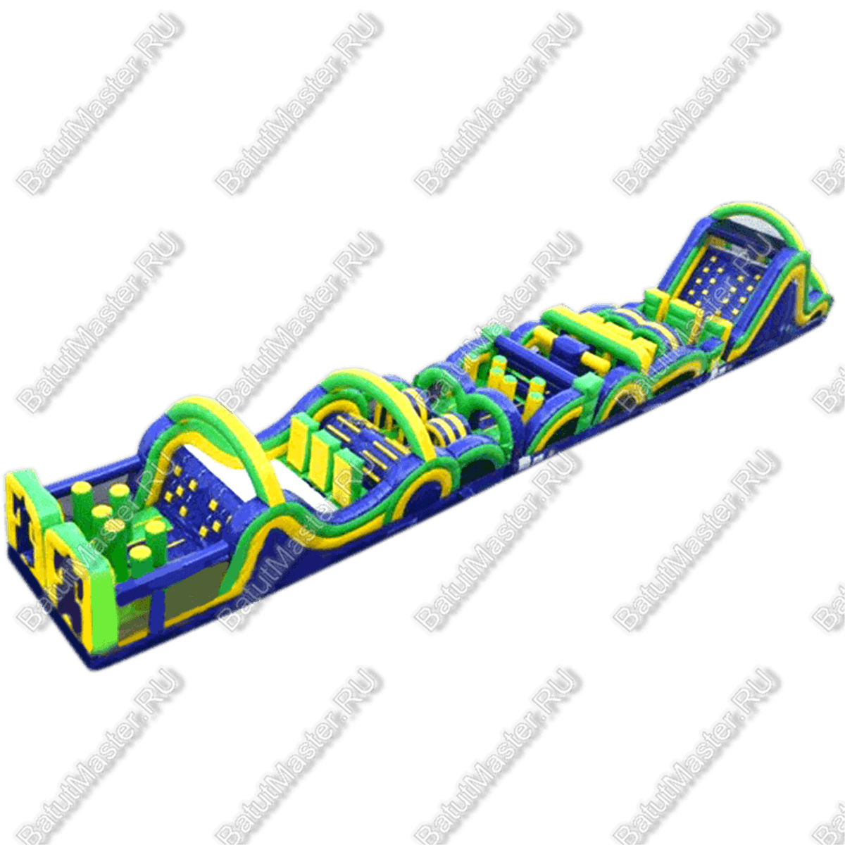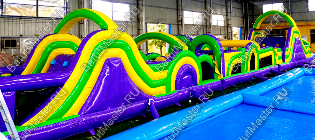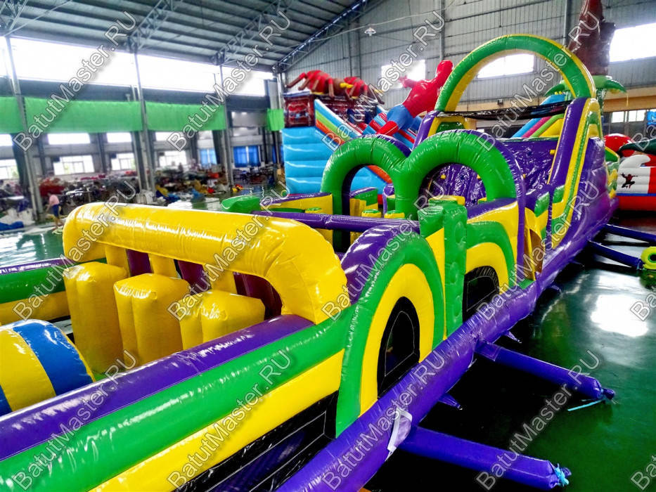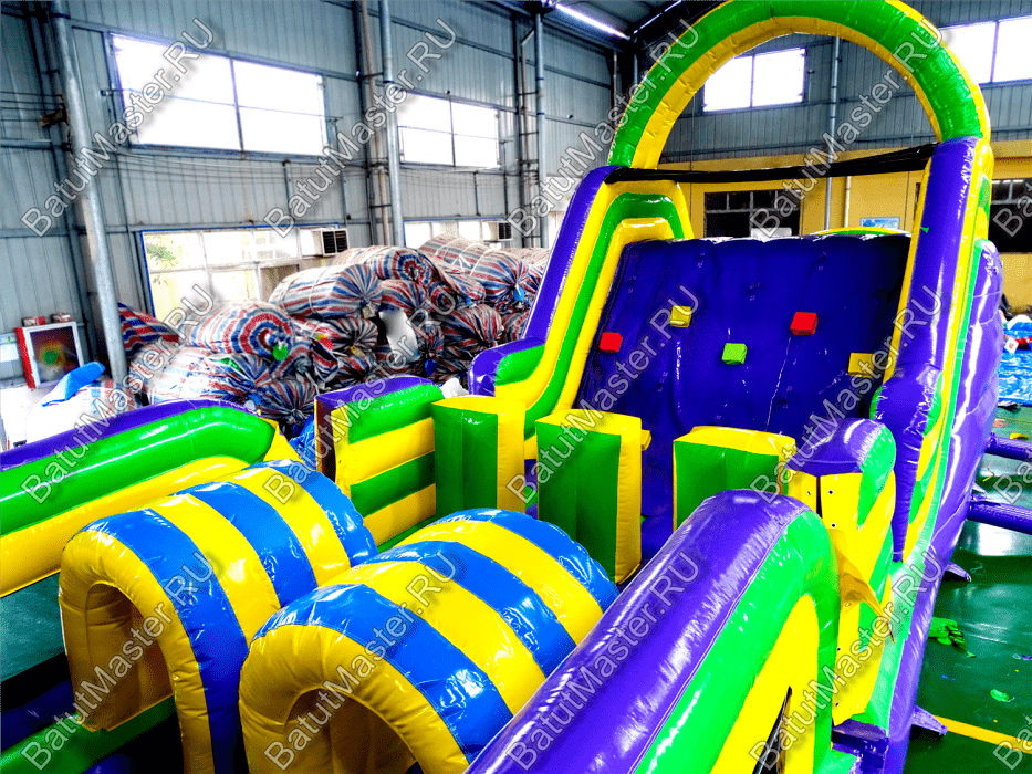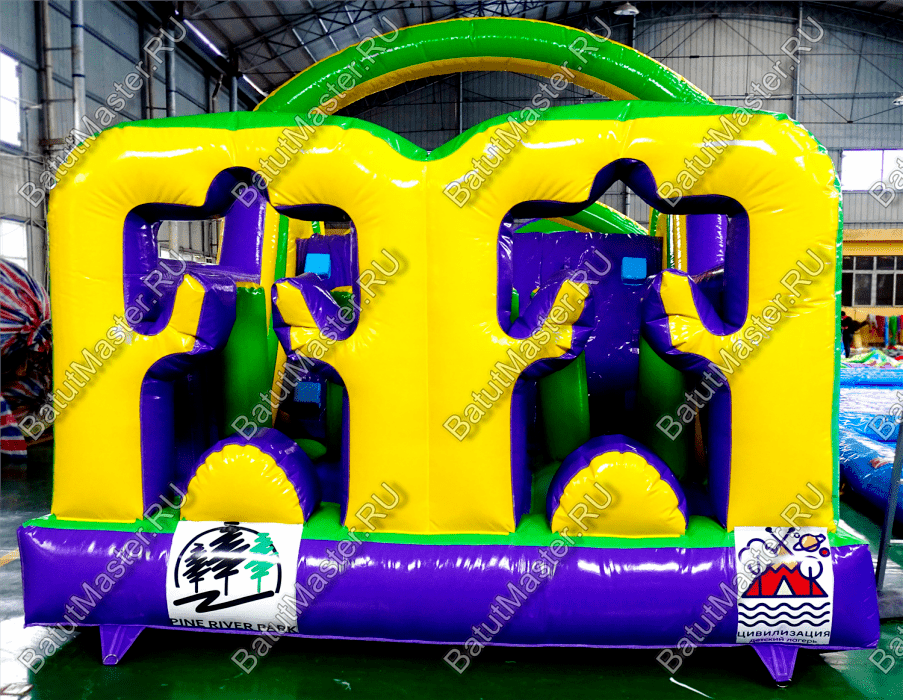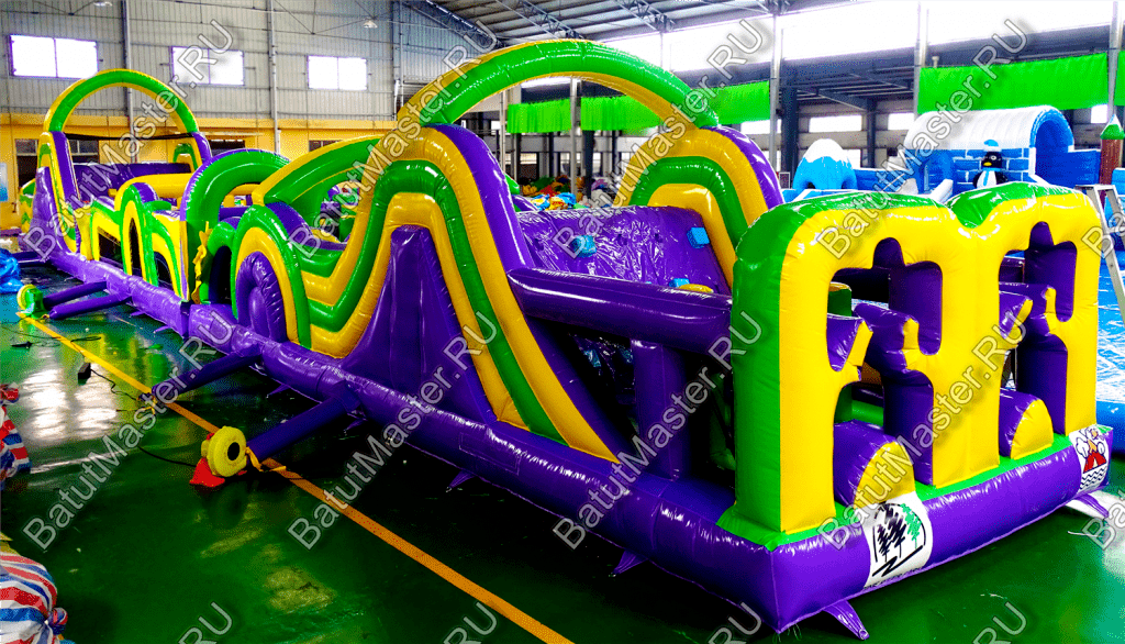 Длинная полоса препятствий на самом деле является надувным батутом с размерами 29 на 4 м. На территории площадки собрано более 15 зон, где каждая отделена друг от друга территориально и представлена надувным препятствием из ПВХ. Самое интересное, что почти в обоих концах коммерческого аттракциона установлены горки с дугообразными арками, а их лестницы представлены скалодромами. Но начинается полоса с самого забавного препятствия на площадке – проема в виде человеческой фигуры, которую можно преодолеть только в определенной позе. Дальше зона со столбиками сменится первой горкой, а за ней начнется чреда настоящих препятствий: параллелепипеды, холм с лестницей, 2 тоннеля, арки, столбики, горизонтальные планки, турники, еще раз арки и в завершение - горка, но уже более высокая, чем первая. Спустившись с нее, ребенок может сойти с батута и вернуться на исходную точку. Также можно постараться побороть полосу препятствий, двигаясь в обратном направлении.