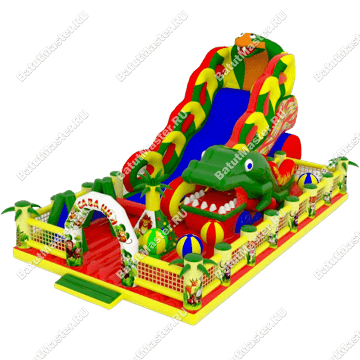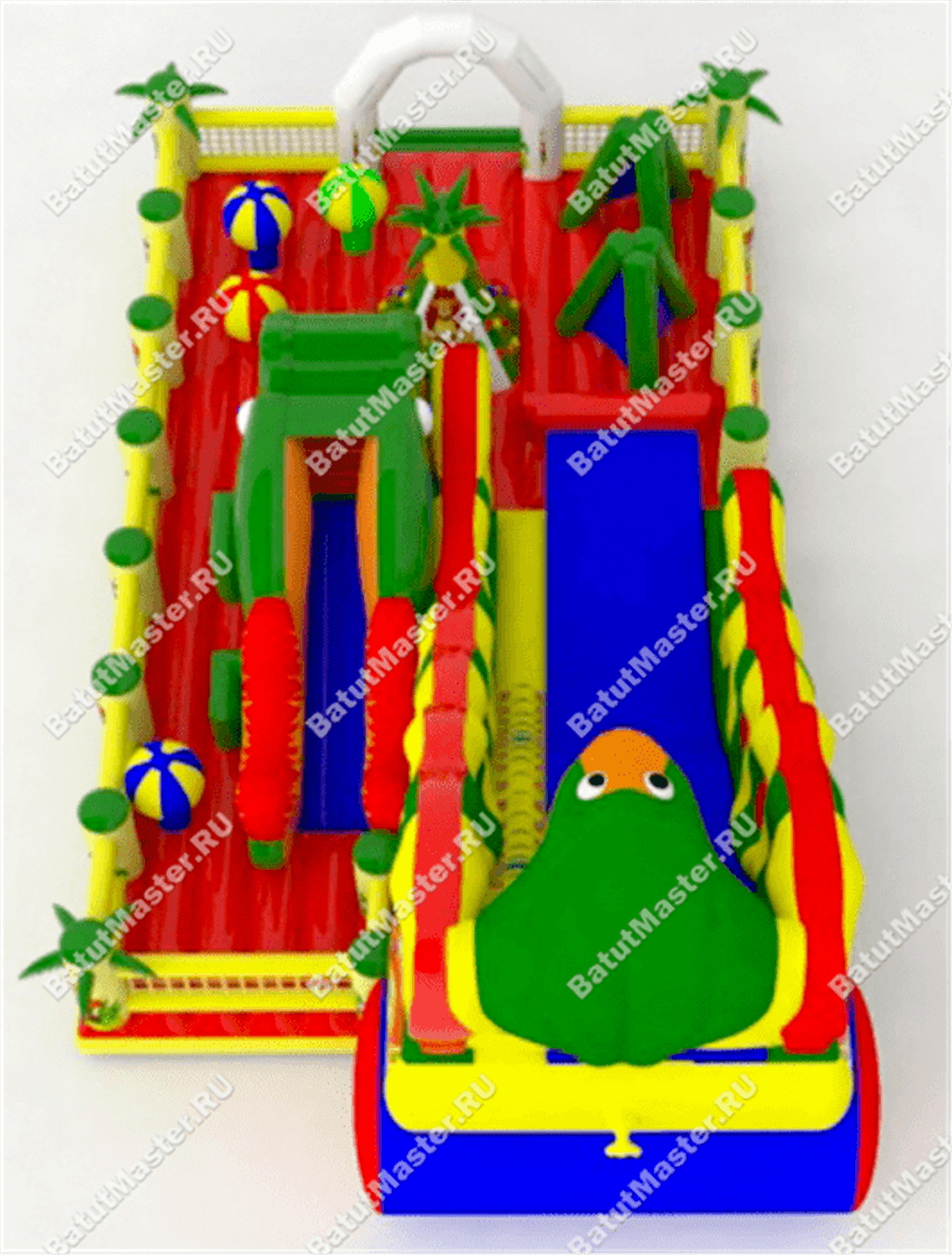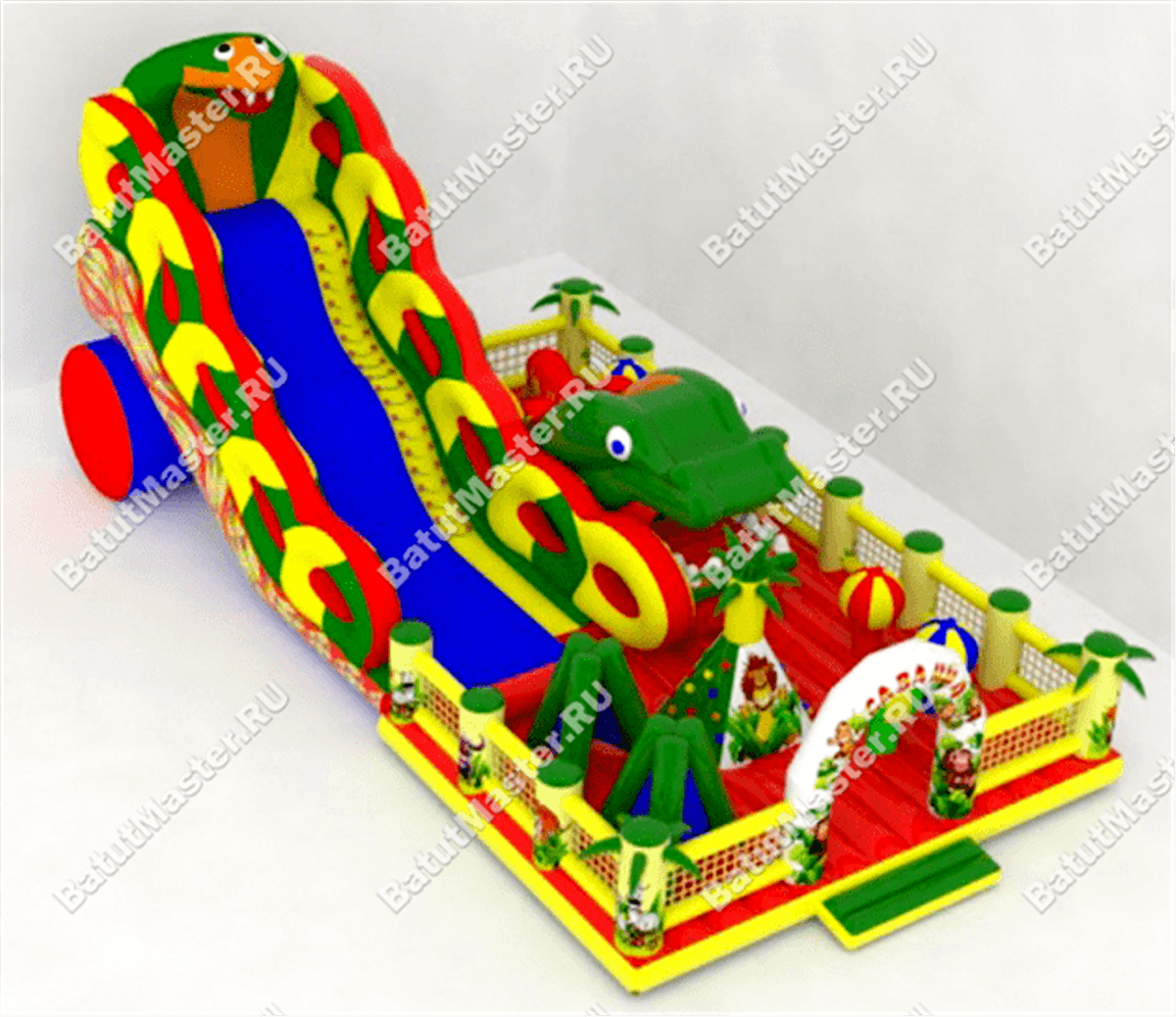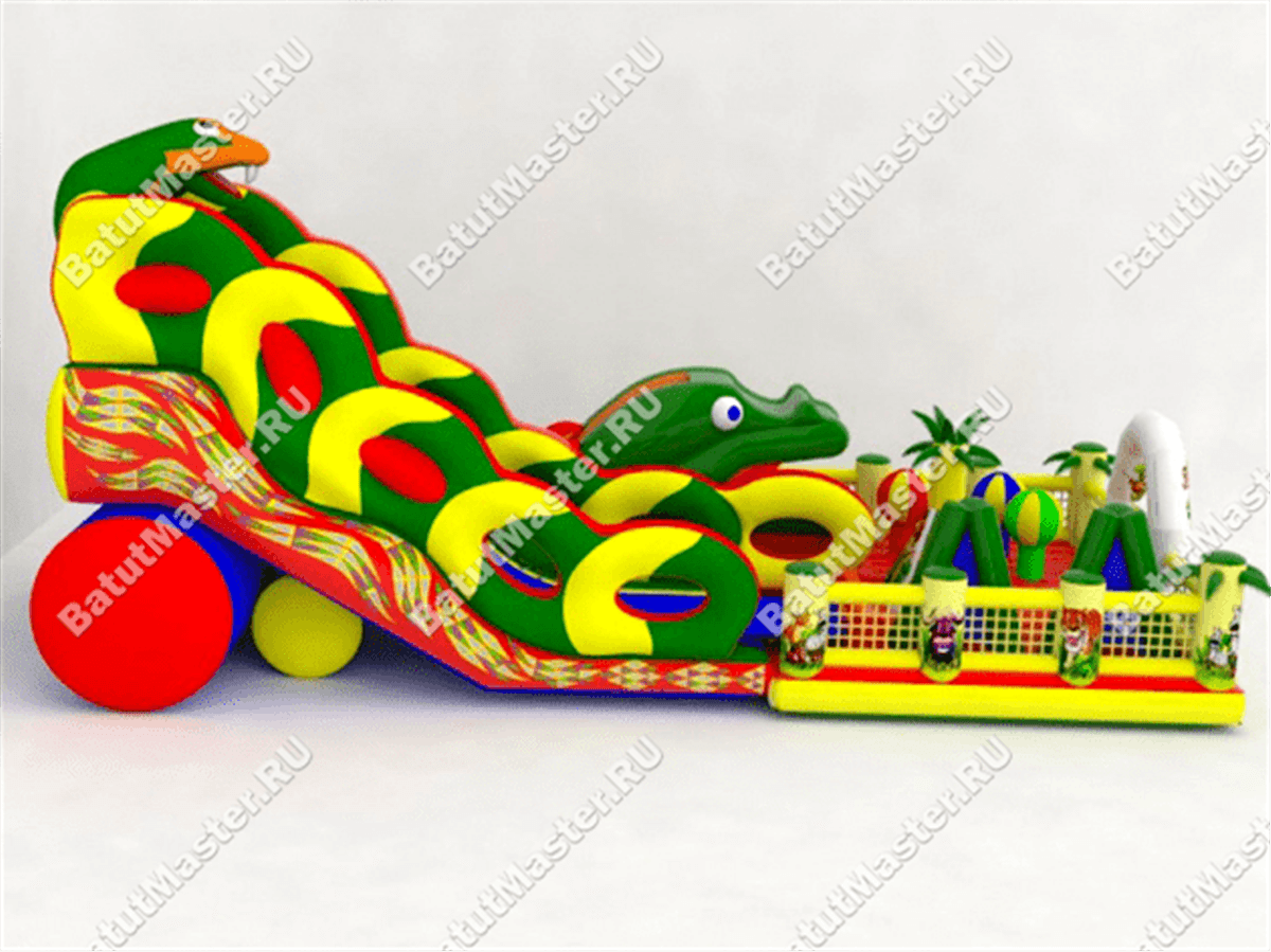 В левой части батута для бизнеса расположилась робот-пасть в виде зеленой головы рептилии, которая продолжается к задней стенке площадки длинной горкой.