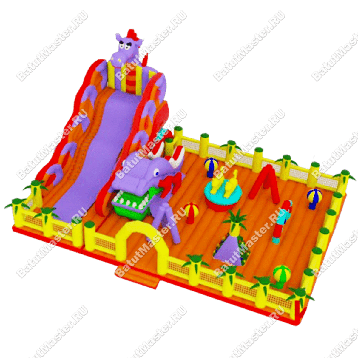 Третья зона – высокая горка со стартовой площадкой на высоте 5 м. Изготовлена из фиолетового и оранжевого ПВХ, а вверху украшена головой дракона. Внешние стороны этой зоны защищены надувным барьером в виде огромных колец, которые напоминают завитки хвоста чудовища.