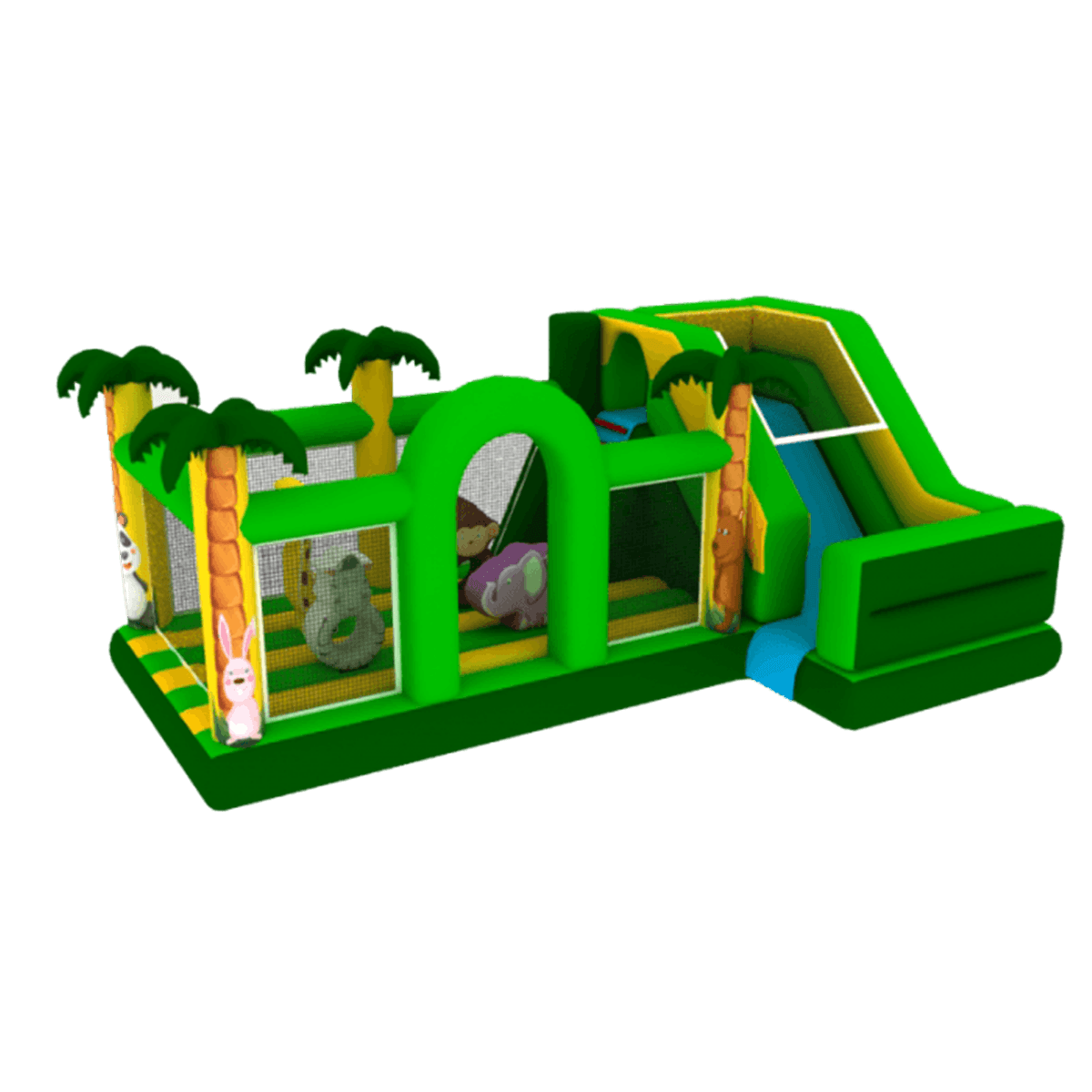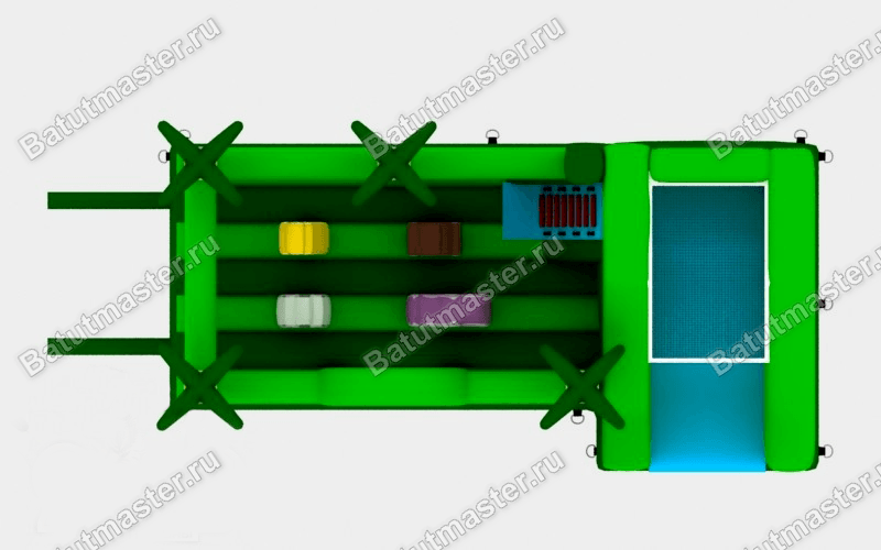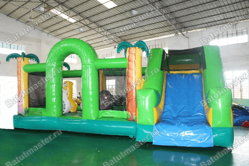 Надувной батут разработан не только для самых маленьких посетителей, но поиграть в нем смогут даже малыши и те, кто только учится развлекаться на надувной ПВХ поверхности. Яркий батут настолько вместительный, что даже целой компании детей разного возраста покажется просторно. Вместо мягкого ограждения по периметру с трех сторон установлены высокие пальмы-опоры, а между ними натянута нейлоновая сетка, позволяющая наблюдать за происходящим внутри. На одной из сторон ограждение прерывается зеленой аркой.