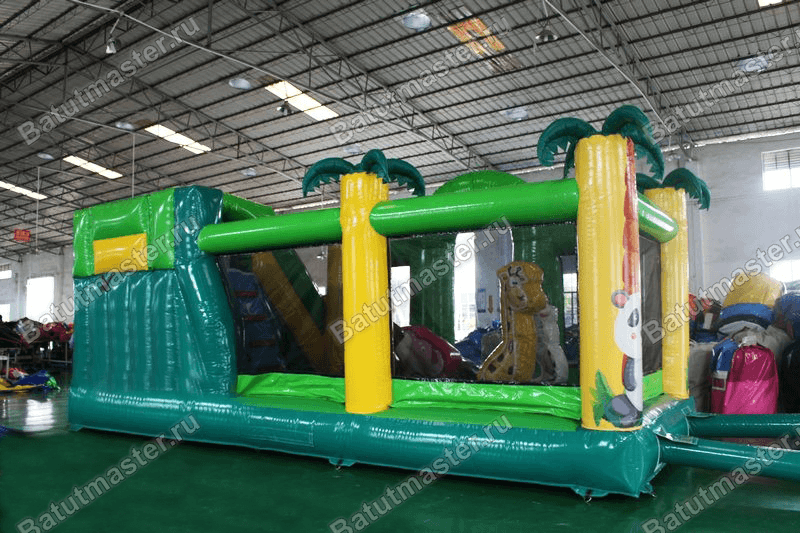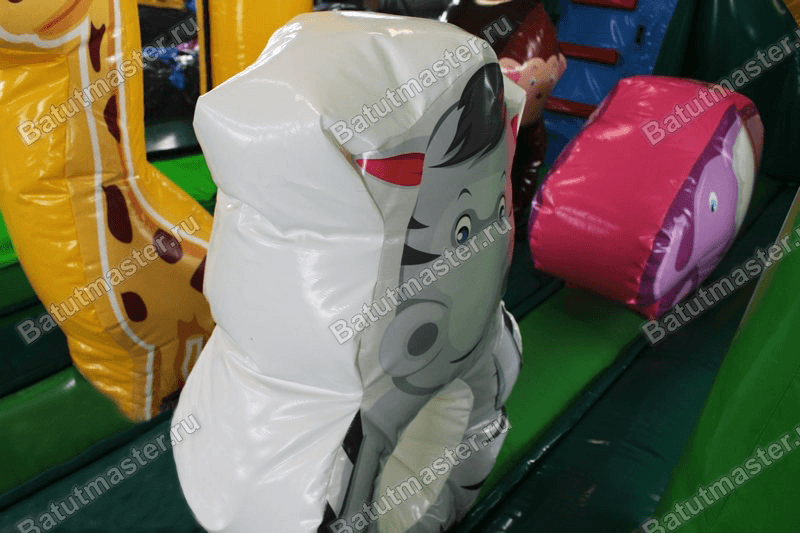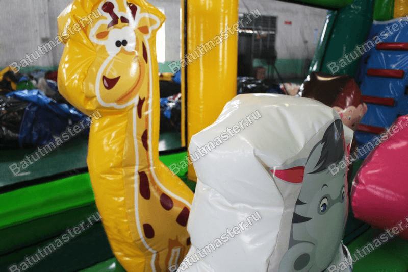 Внутри закрытой площадки имеется 4 игровые фигуры в виде африканских животных. А прямо из площадки начинается лестница, которая ведет вверх, на самую высокую точку батута. Уже здесь есть небольшая площадка, с которой и начинается увлекательный съезд вниз. Чтобы ребенок не смог выпасть по инерции движения, путь ему перекрывает небольшой мягкий бордюр зеленого цвета. Учитывая то, что высота аттракциона составляет 3 м, можно сказать, что это уличный батут, но при желании им можно украсить любое учебное помещение или спортивный зал.