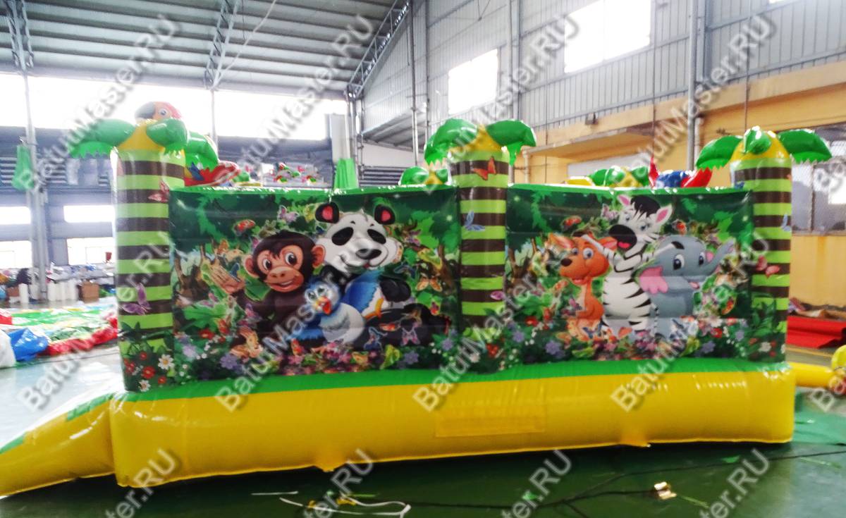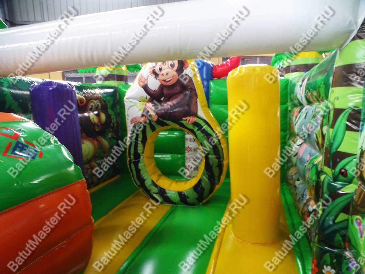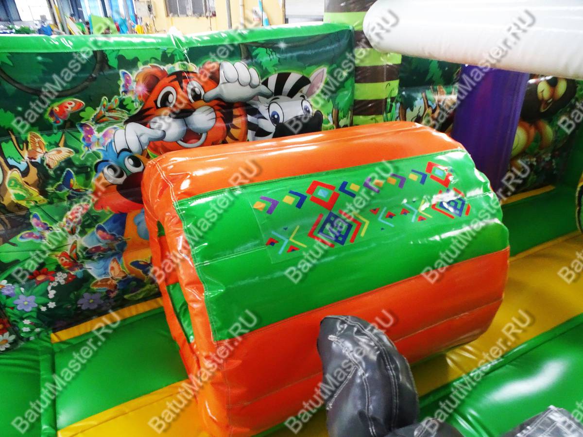 Маленький батут в виде полосатой площадки закрытой со всех боковых сторон такими же полосатыми стенами, но в другой цветовой окраске. Если большая часть аттракциона – это желто-зеленое поле, то боковые стенки сшиты из бело-зеленого ПВХ и на них изображены популярные африканские животные. Главной изюминкой яркого батута стала фигура языческого божества у индейцев, которая расположилась прямо на входе с огромными красными рогами и попугаями по бокам.