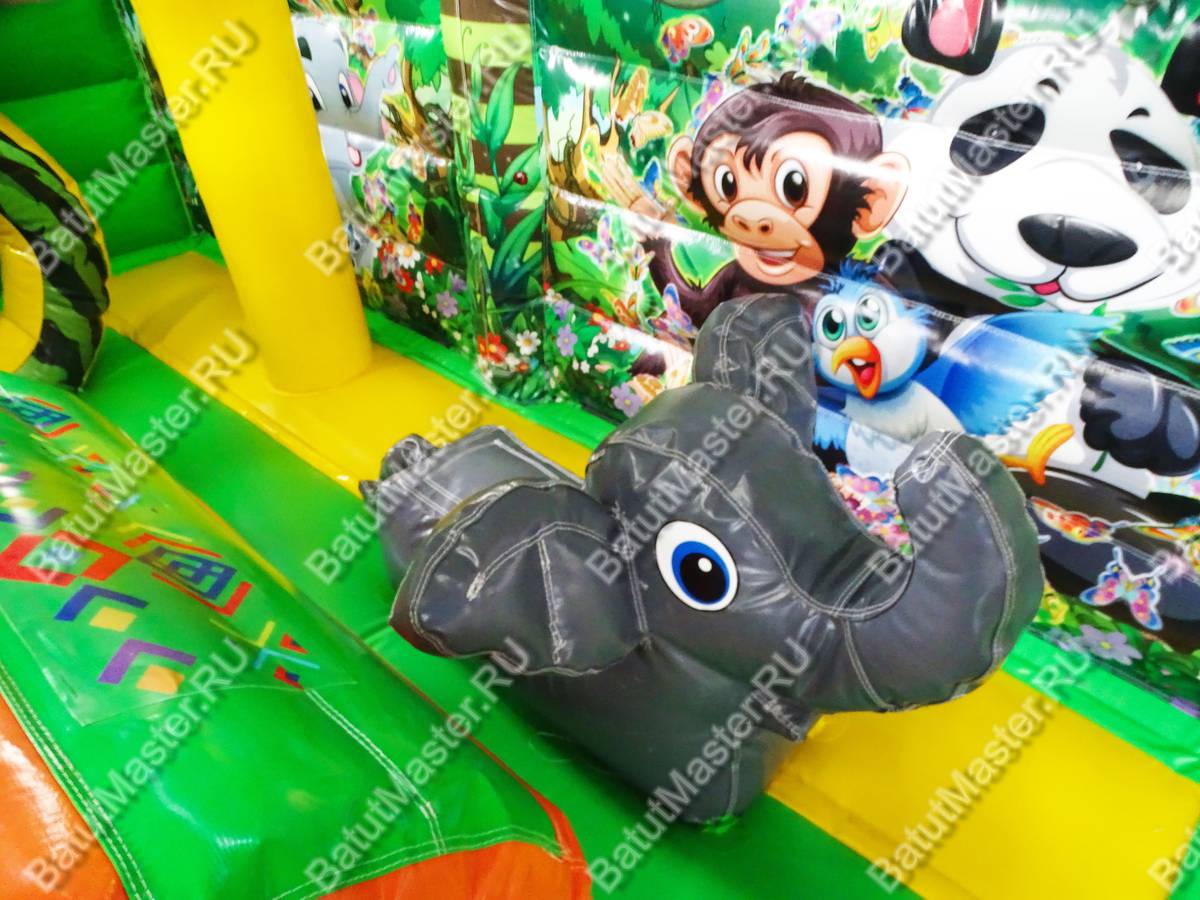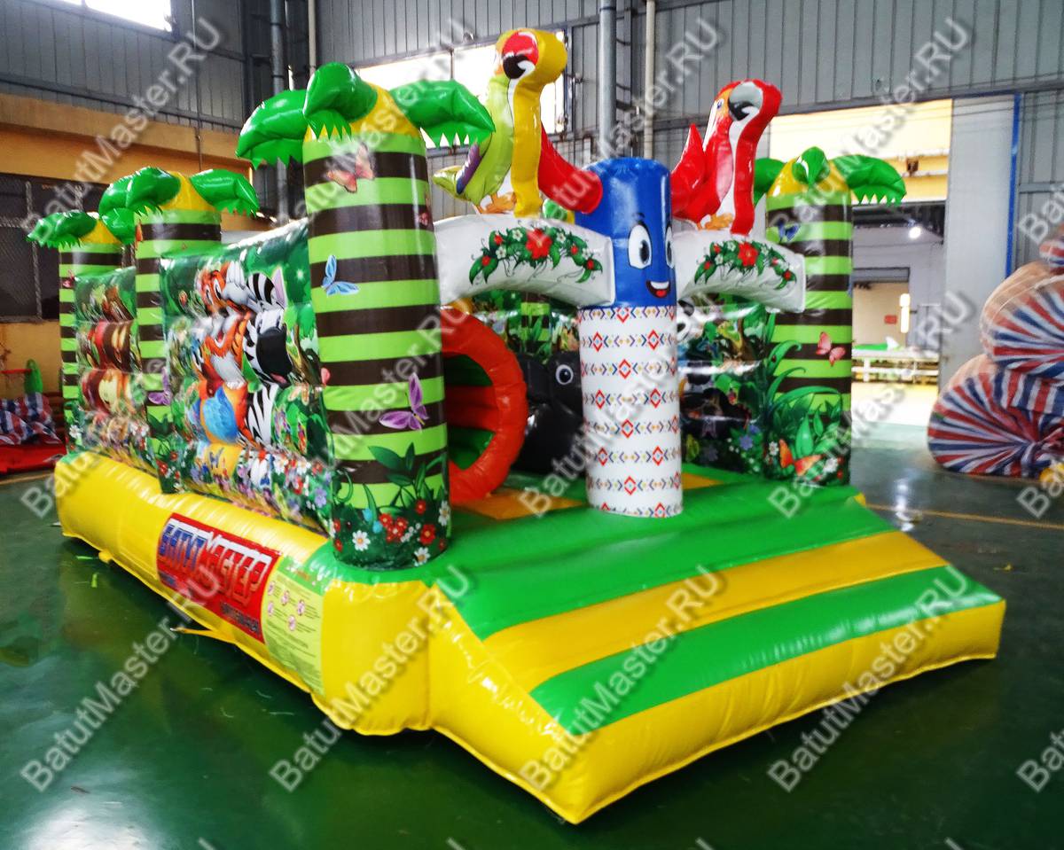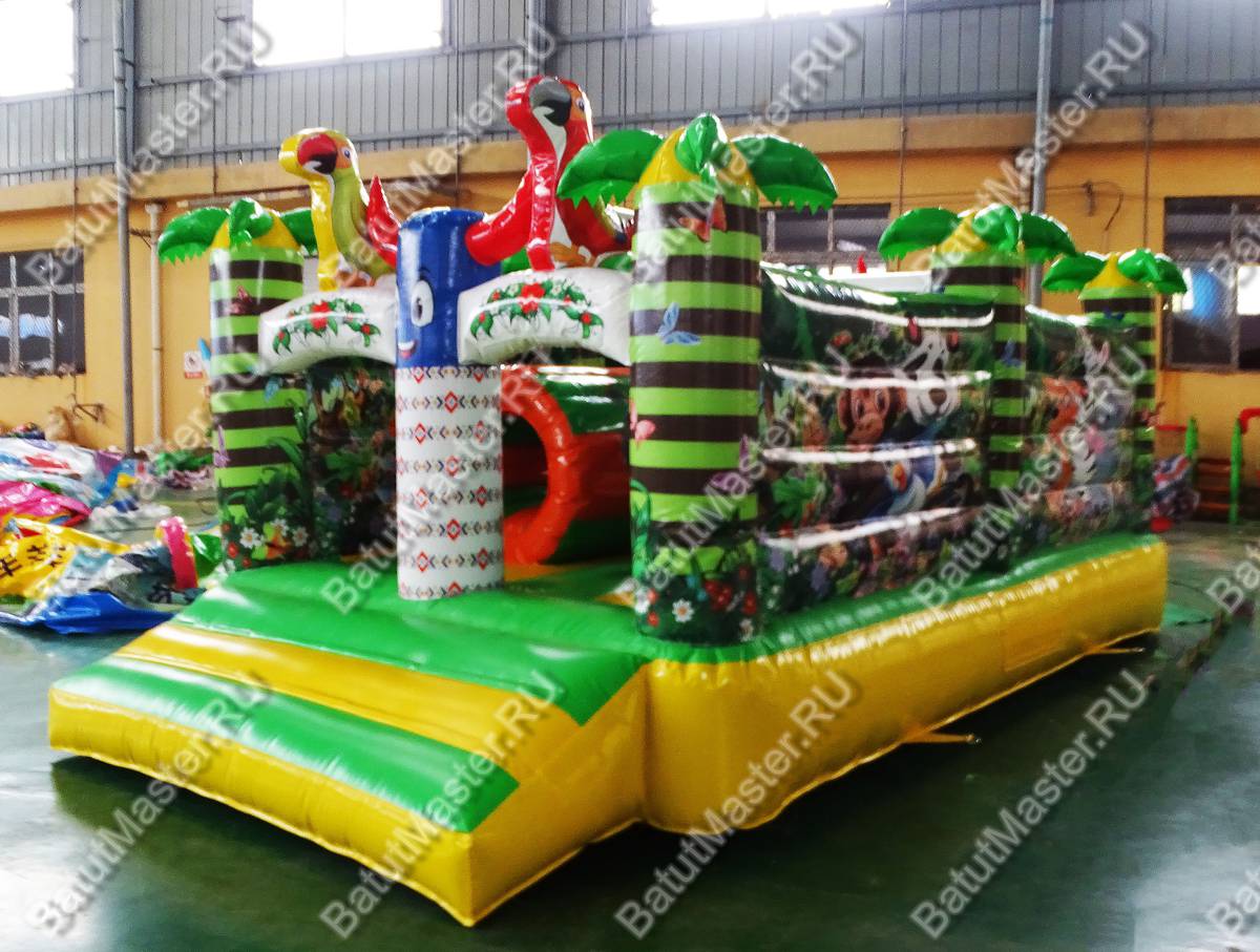 Маленький батут в виде полосатой площадки закрытой со всех боковых сторон такими же полосатыми стенами, но в другой цветовой окраске. Если большая часть аттракциона – это желто-зеленое поле, то боковые стенки сшиты из бело-зеленого ПВХ и на них изображены популярные африканские животные. Главной изюминкой яркого батута стала фигура языческого божества у индейцев, которая расположилась прямо на входе с огромными красными рогами и попугаями по бокам.