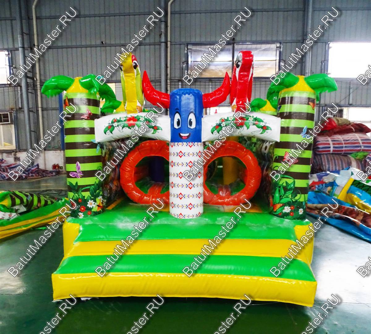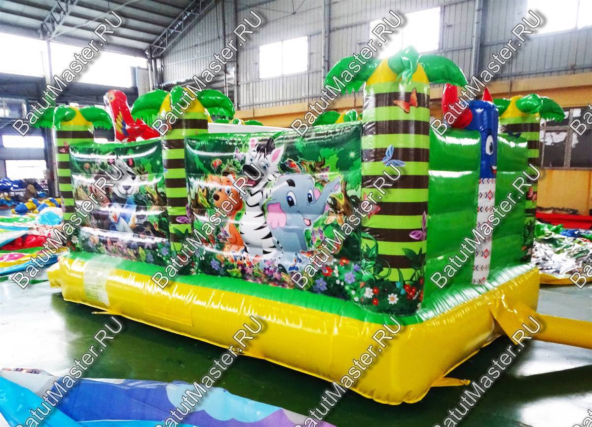 Прямо на входе установлены два надувных тоннеля, а далее надувные забавные животные, на которых можно также забираться. Здесь игровые зоны отличаются не только наполнением, но и цветовым оформлением. На батут нанесены рисунки тропического леса с обезьянками, птицами, водопадами и пальмами.
