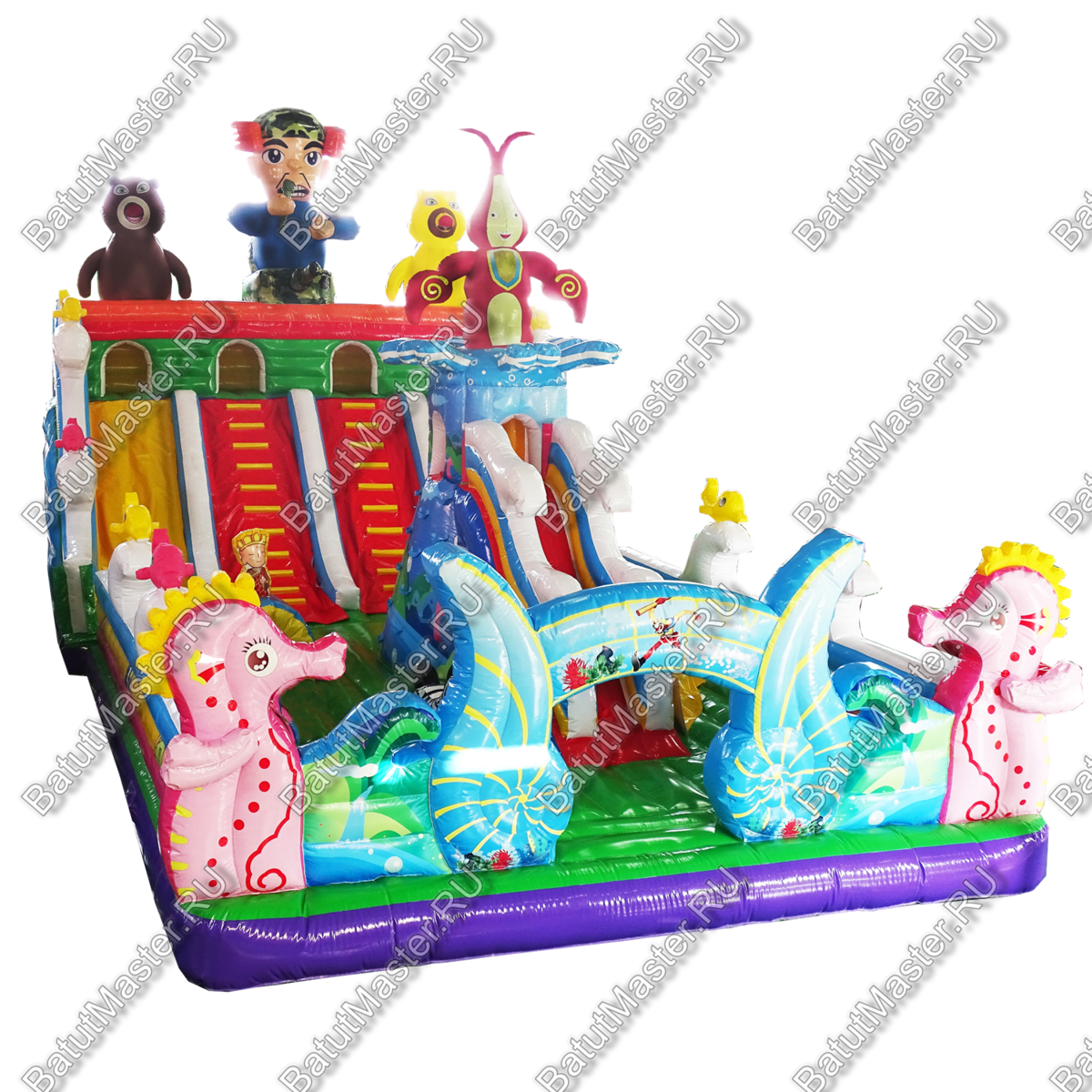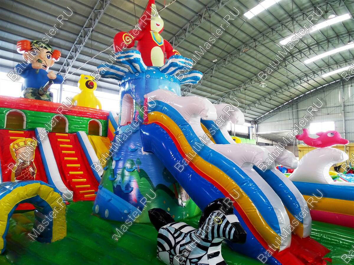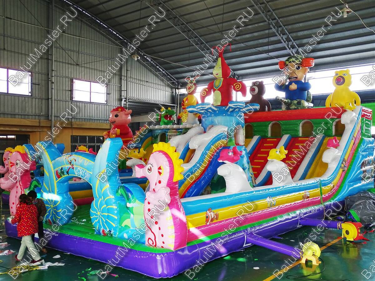 Всё вместе это создаёт гармоничный комплекс надувных развлечений для детей. Они смогут попрыгать, побегать, покататься и даже поползать. Настоящий детский рай с огромным выбором развлечений и с множеством надувных персонажей, что украшают батут.
