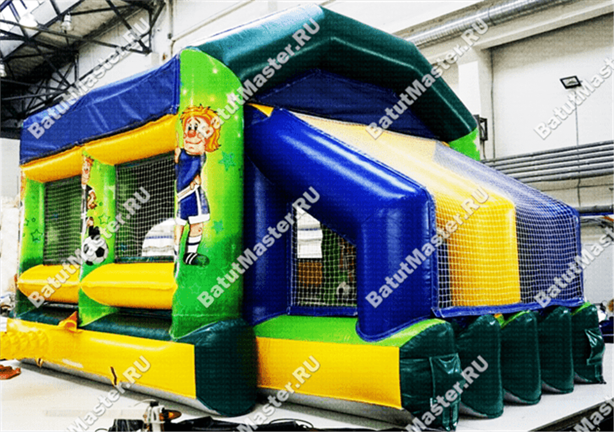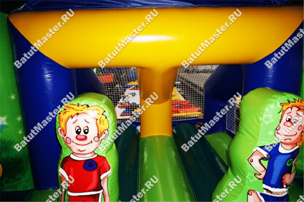 Для увлекательности внутри аттракциона установлены высокие надувные столбы с изображениями футболистов, которые будто стоят на воротах и отбивают мяч юных озорников.