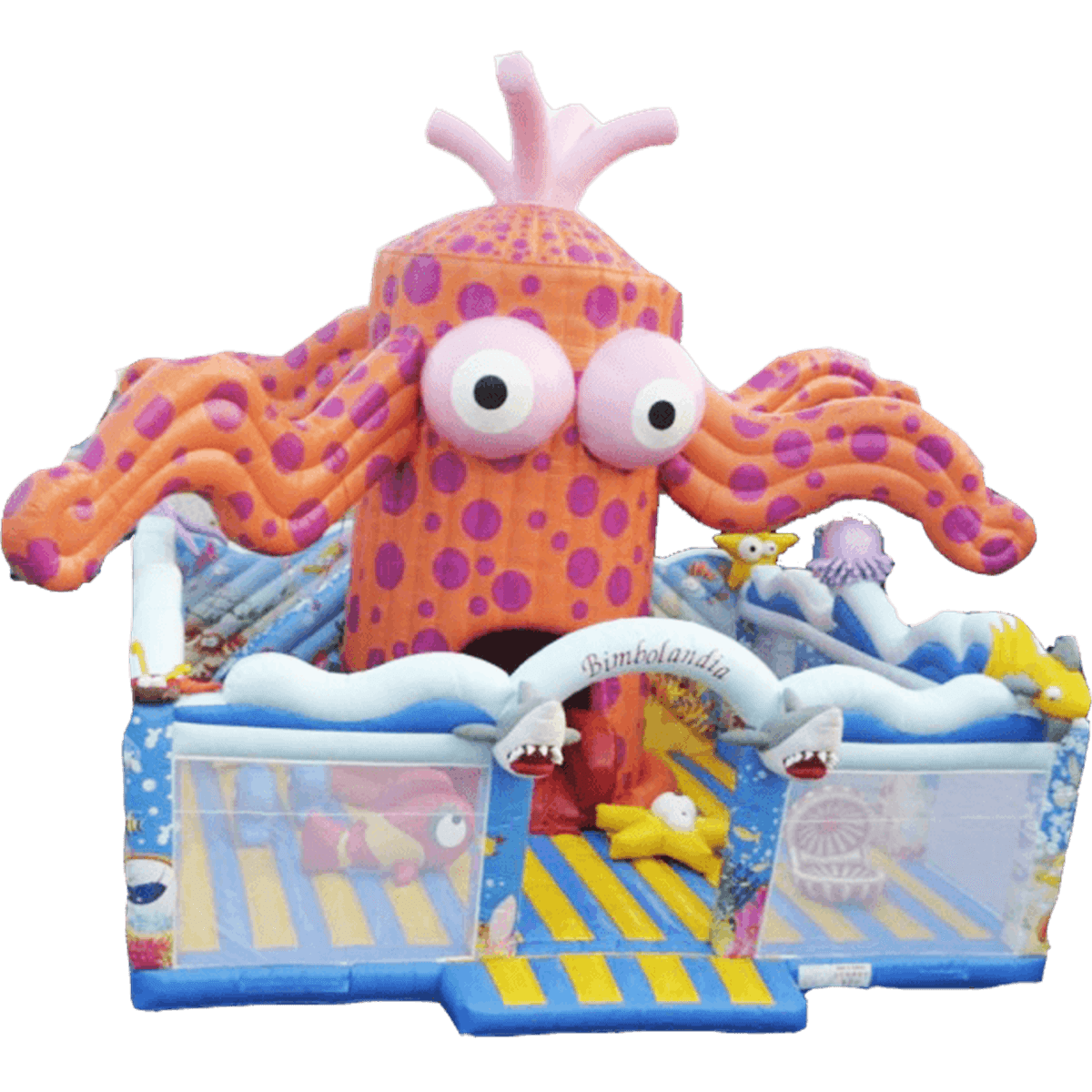 Высокий батут выделяется из всех остальных огромным туловищем кораллового осьминога с розовыми пятнами, внутри которого есть огромное отверстие. Нижняя платформа напоминает море – из синих и желтых полос, подобно песку и воде. Привлекательный батут еще больше захватывает своими морскими непривычными жителями – медузы, звезды, ракушки, рыбы, эти чудные создания так редко встречаются в обычной жизни. Необычный батут привлекает своими свежими красками, не заезженным дизайном. Возможно, малыши не всегда будут понимать, какое существо перед ними находится, но от этого игры станут еще радостнее и веселее.