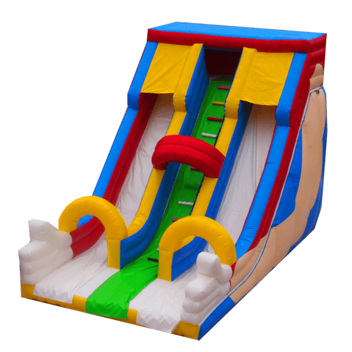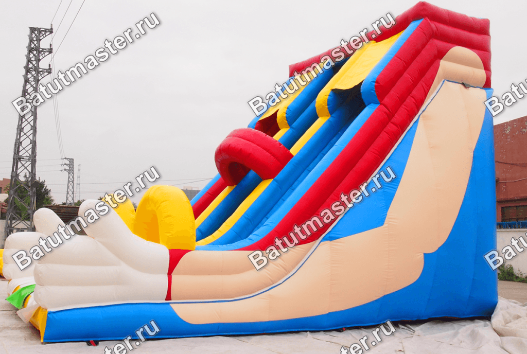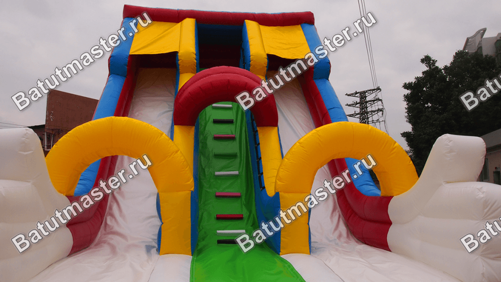 Надувной батут делится на 3 основные части: по центру проходит подъем сочно зеленого цвета с разноцветными ступеньками, а по бокам – белые спуски из белых склизов ПВХ. Обе горки вверху оборудованы желтыми навесами, которые частично и на некоторое время защищают посетителей от солнца или дождя. Но немного выше располагается целая площадка закрытой конструкции, на которой дети могут резвиться и развлекаться, скрывая себя от непогоды или жары. Самым забавным моментом на аттракционе является окончание боковых бортиков, ведь уже внизу они превращаются в две кисти рук, показывающих «класс».