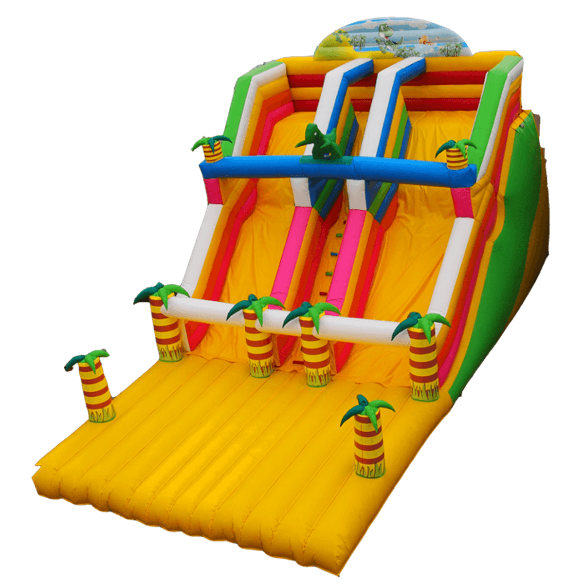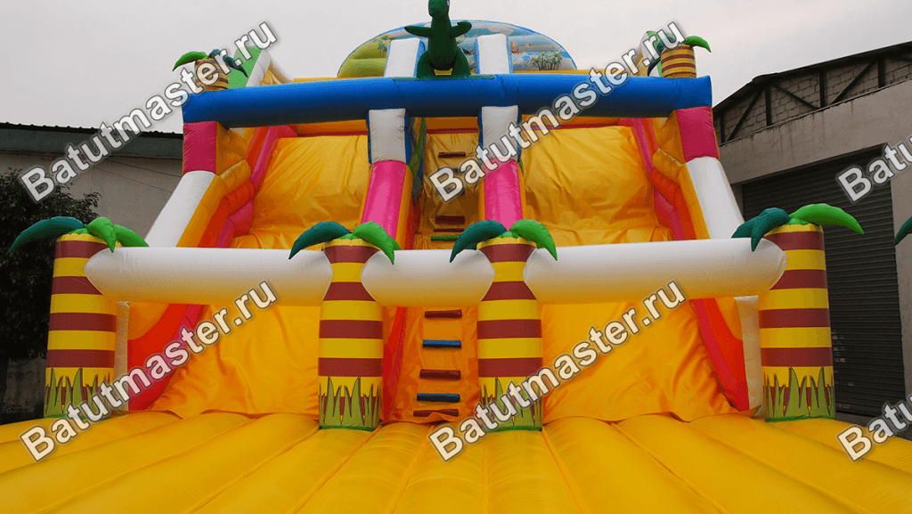 Основной цвет яркого батута – желтый, но в конструкции применяются и другие тона, которые удачно контрастируют с основным. Весь спуск поперек 2 раза перекрывают надувные брусья, украшенные небольшими пальмами, они также существуют и на нижней платформе, где можно просто развлечься, побегать или попрыгать. Боковые стороны аттракциона – зеленые, а самый верх украшает небольшая полукруглая площадка с изображением животного мира Африки.
