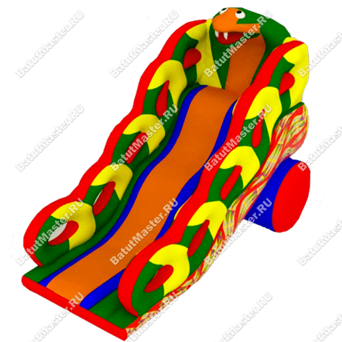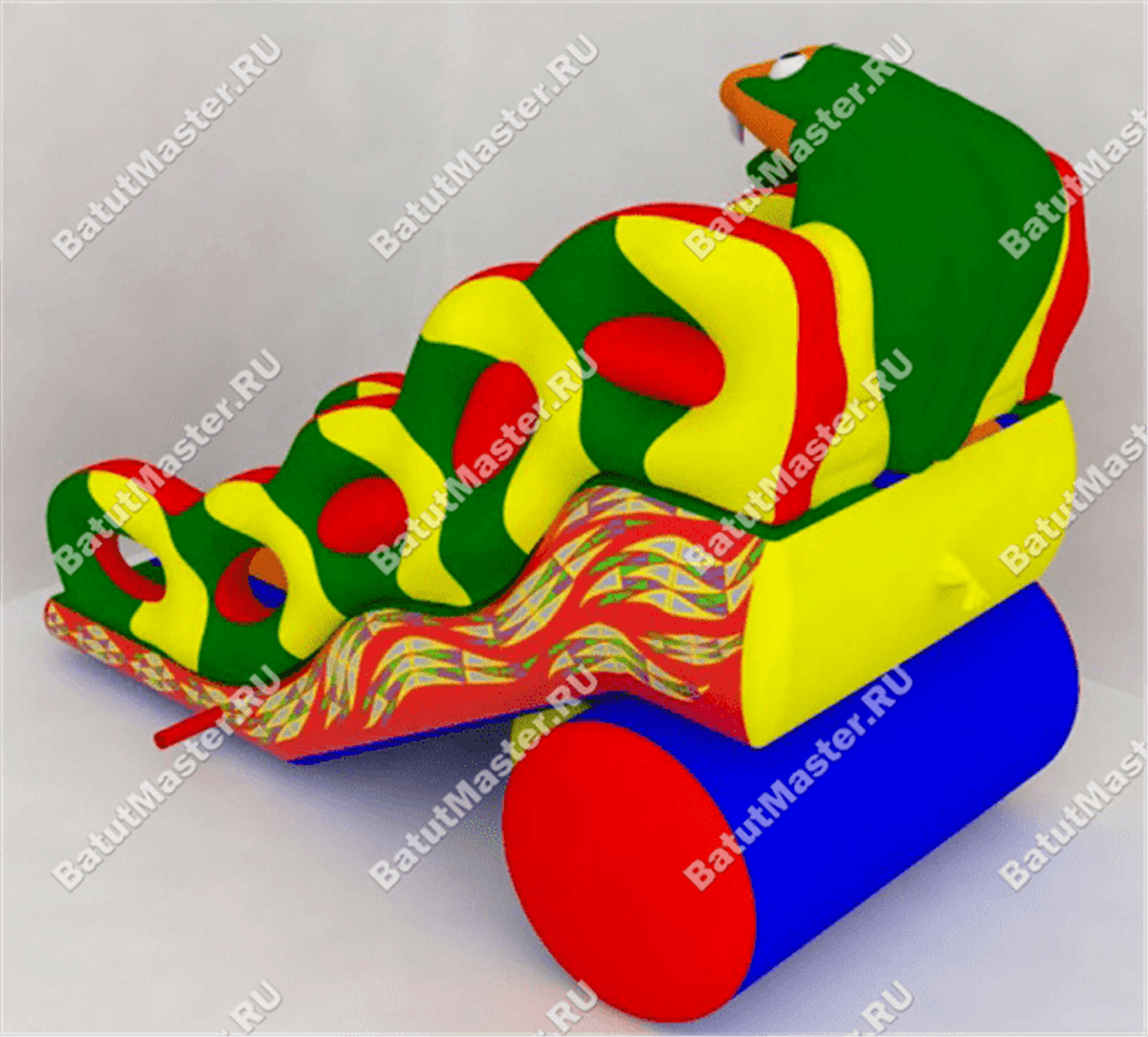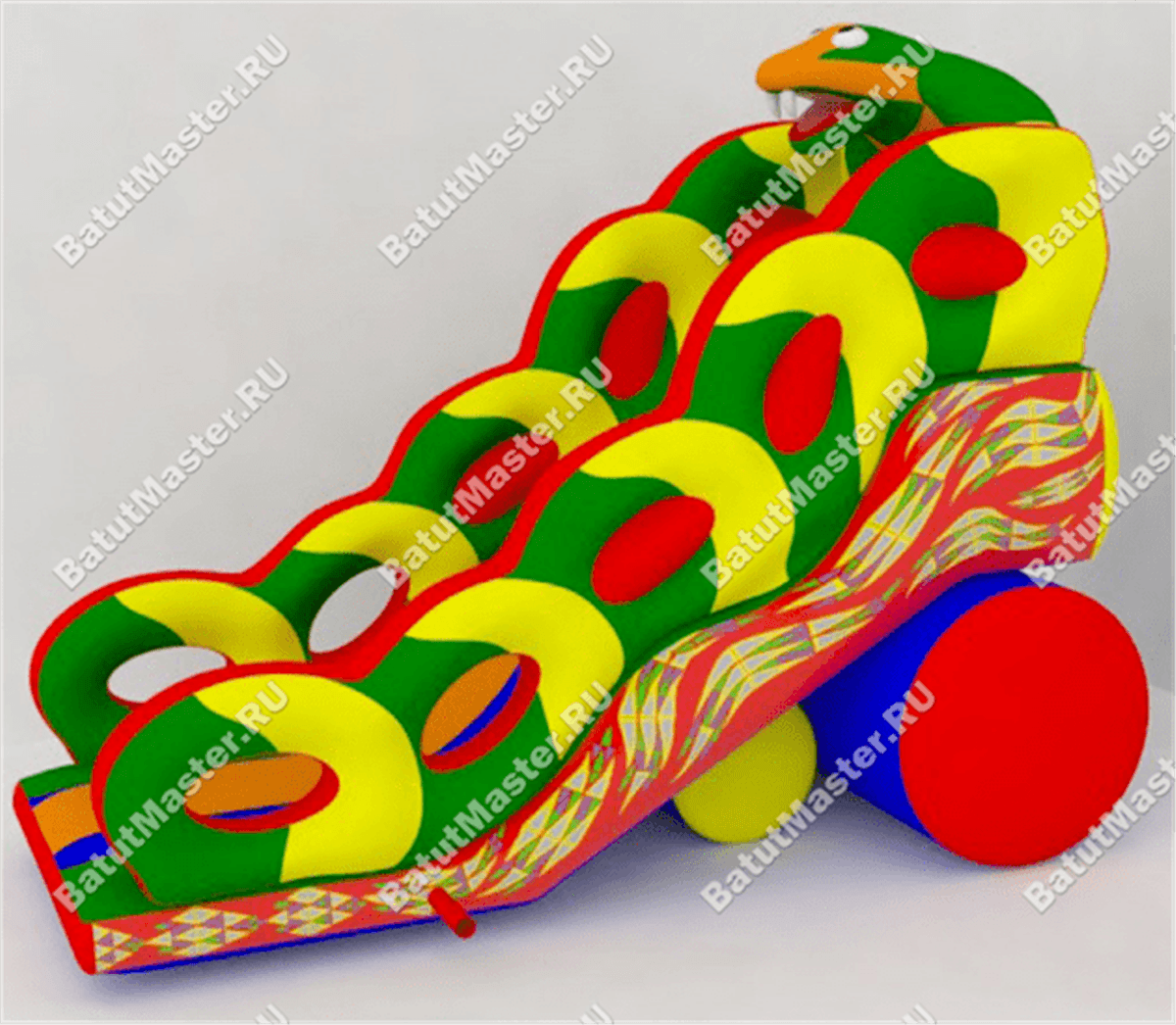 Необходимый угол наклона горки поддерживает толстый валик из синего и красного ПВХ. Боковые края окаймляет кольцевое ограждение из желто-зеленого ПВХ, которое напоминает изогнутое тело змеи. По завершению спуска внизу ничего не установлено, поэтому есть возможность побегать и попрыгать, а также подставить бассейн для мгновенного погружения в воду или шарики.