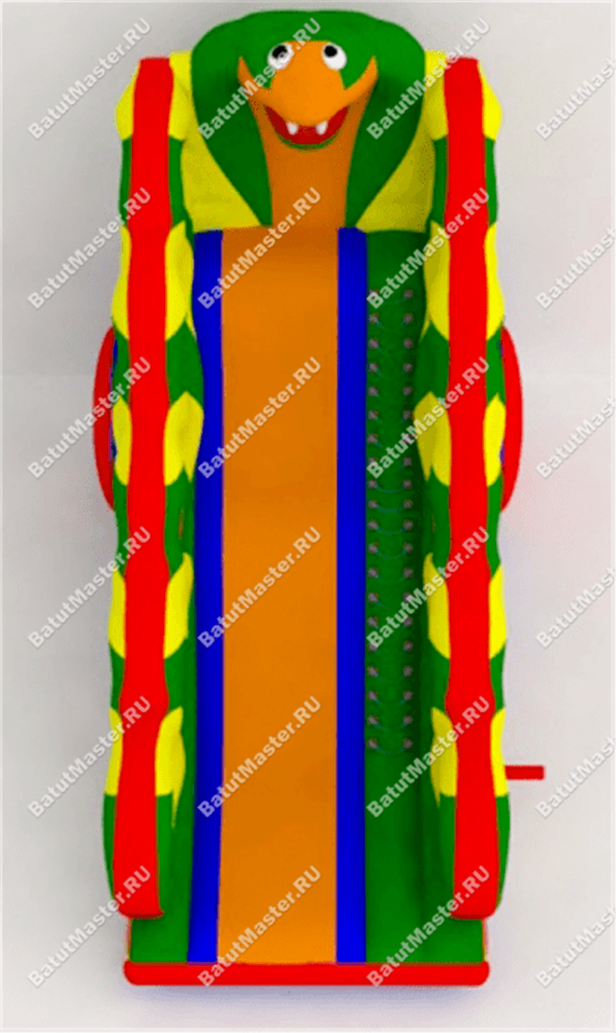 Если вы профессиональный батутчик или только собираетесь им стать, то без высокой надувной горки вы не сможете добиться быстрого успеха. Монтаж такого батута для бизнеса может проходить совместно с установкой водного или сухого бассейна на любой площадке с достаточными размерами. Сама же конструкция достаточно яркая и сочетает в себе основные цвета: желтый, зеленый, красный, синий и оранжевый. Но самая забавная часть для детей в этом аттракционе – большая голова змеи, которая кровожадно показывает свои зубы. Возможно, картинка немного пугает, но именно это раззадоривает малышей – сначала добраться до нее, победить ее и поспешить вниз.