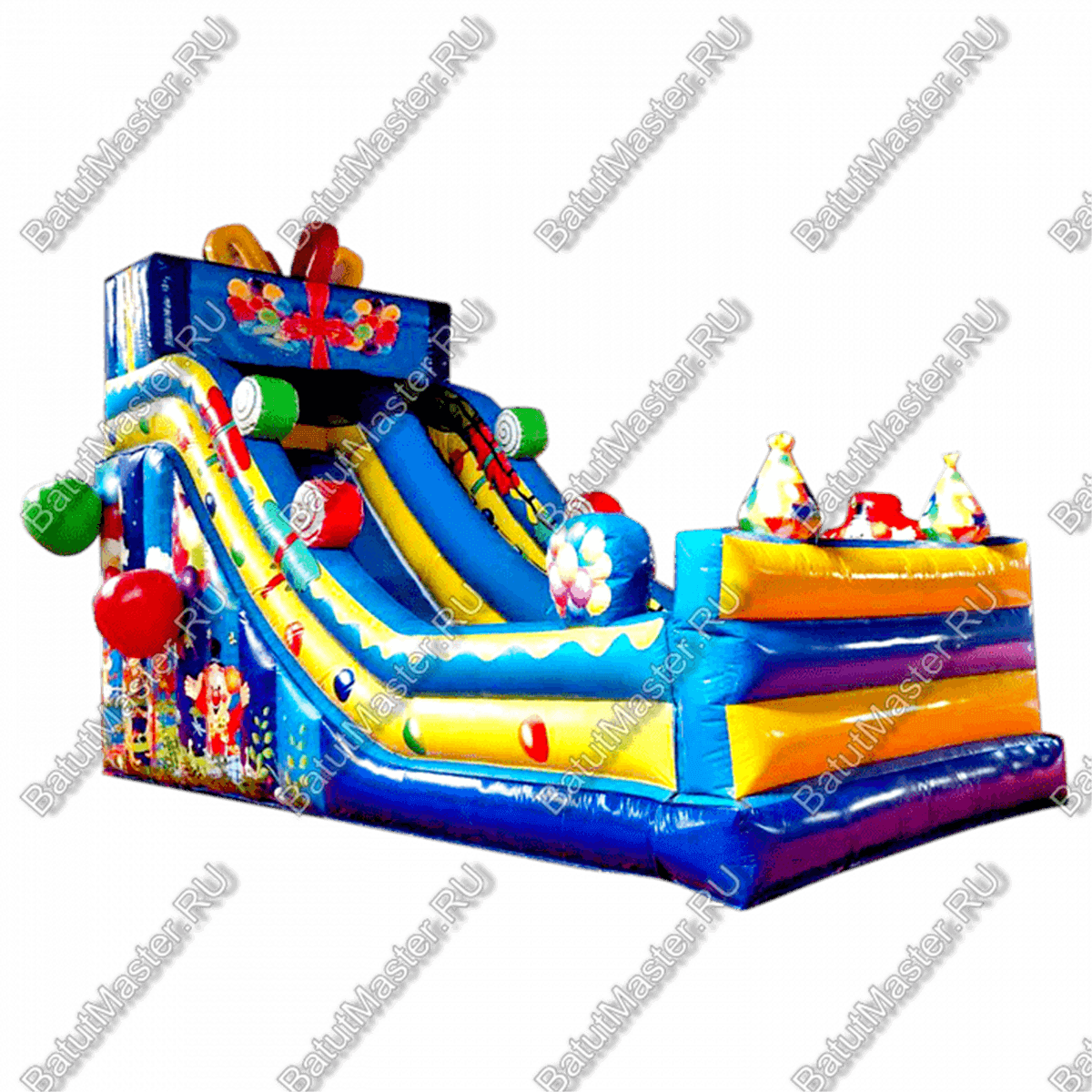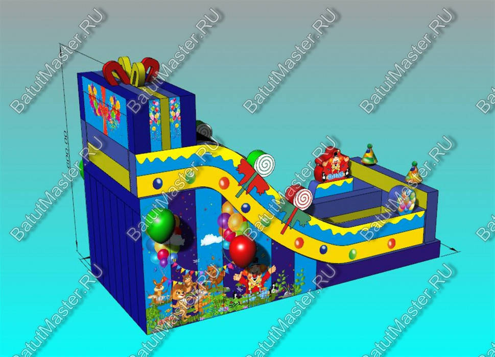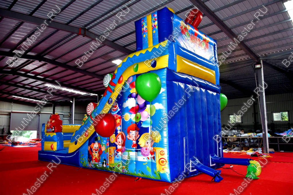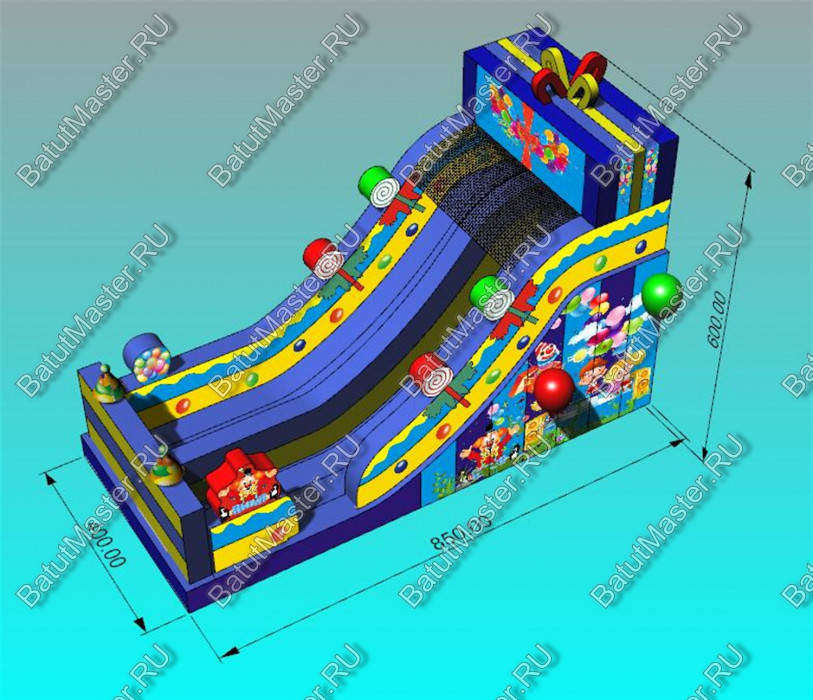 Представленный надувной батут выполнен в празднично-торжественном стиле, преобладающим цветом ПВХ в коммерческом аттракционе является синий. Конструкция площадки разделена на 2 части: небольшая прыгательная зона и высокая горка. Но самым интересным в батуте является его исполнение: поверхность конструкции раскрашена в яркие рисунки, которые дают понять детям, что на этой площадке проходит настоящий праздник. Боковые стороны изображают веселого клоуна, верхний козырек на горке украшен надувными и нарисованными лентами, а также рисунками шаров. Боковые стенки, проходящие вдоль горки и внутри нее, передают изображения настоящих сладостей и кондитерских мастик. По этим же стенкам, будто спускаются вниз, надувные конфеты, закрученные по спирали.