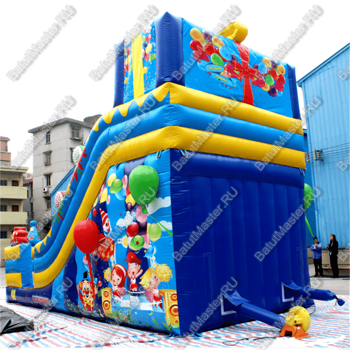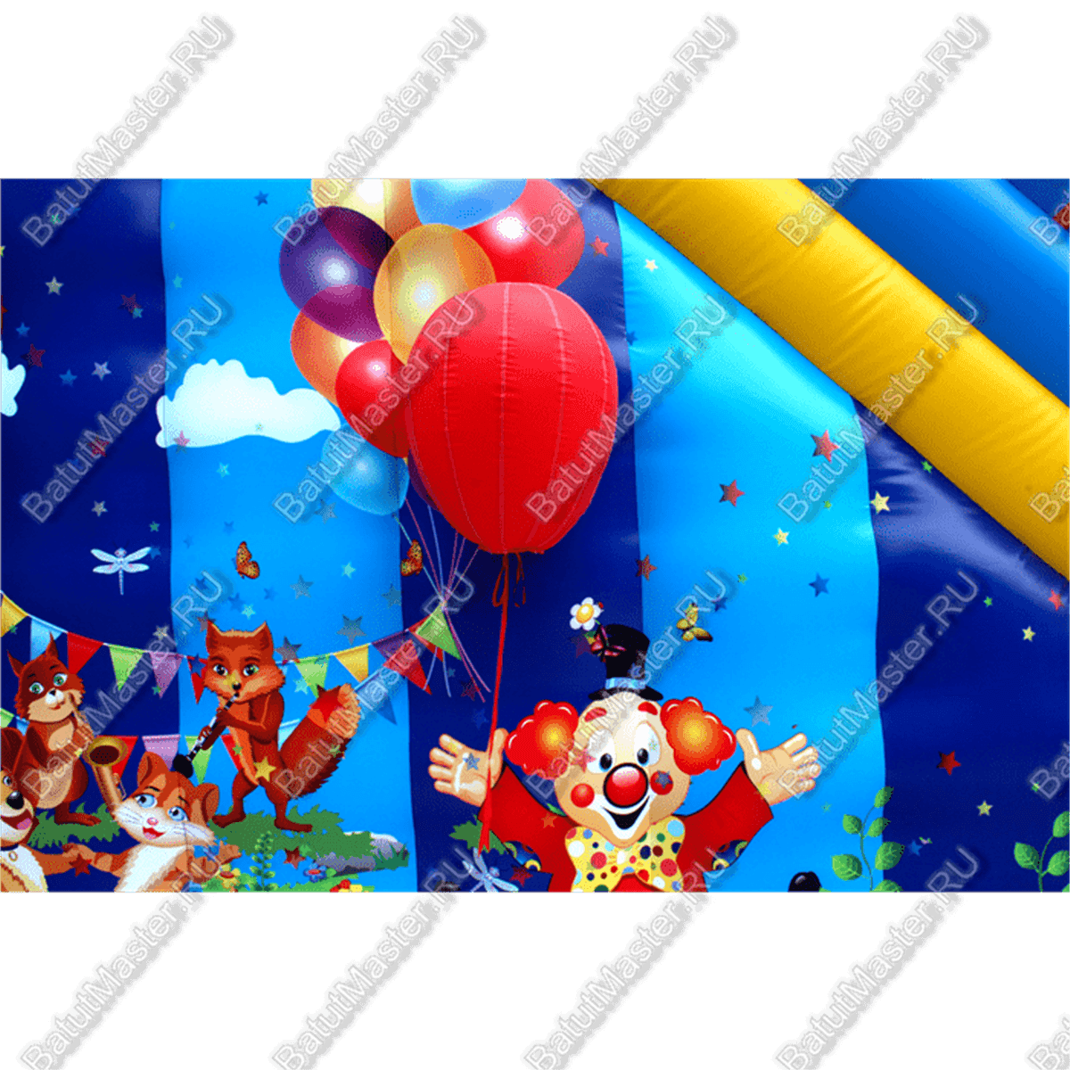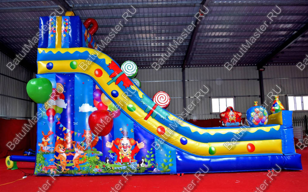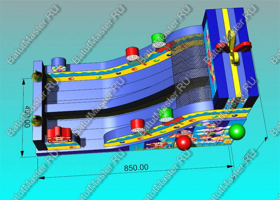 Представленный надувной батут выполнен в празднично-торжественном стиле, преобладающим цветом ПВХ в коммерческом аттракционе является синий. Конструкция площадки разделена на 2 части: небольшая прыгательная зона и высокая горка. Но самым интересным в батуте является его исполнение: поверхность конструкции раскрашена в яркие рисунки, которые дают понять детям, что на этой площадке проходит настоящий праздник. Боковые стороны изображают веселого клоуна, верхний козырек на горке украшен надувными и нарисованными лентами, а также рисунками шаров. Боковые стенки, проходящие вдоль горки и внутри нее, передают изображения настоящих сладостей и кондитерских мастик. По этим же стенкам, будто спускаются вниз, надувные конфеты, закрученные по спирали.