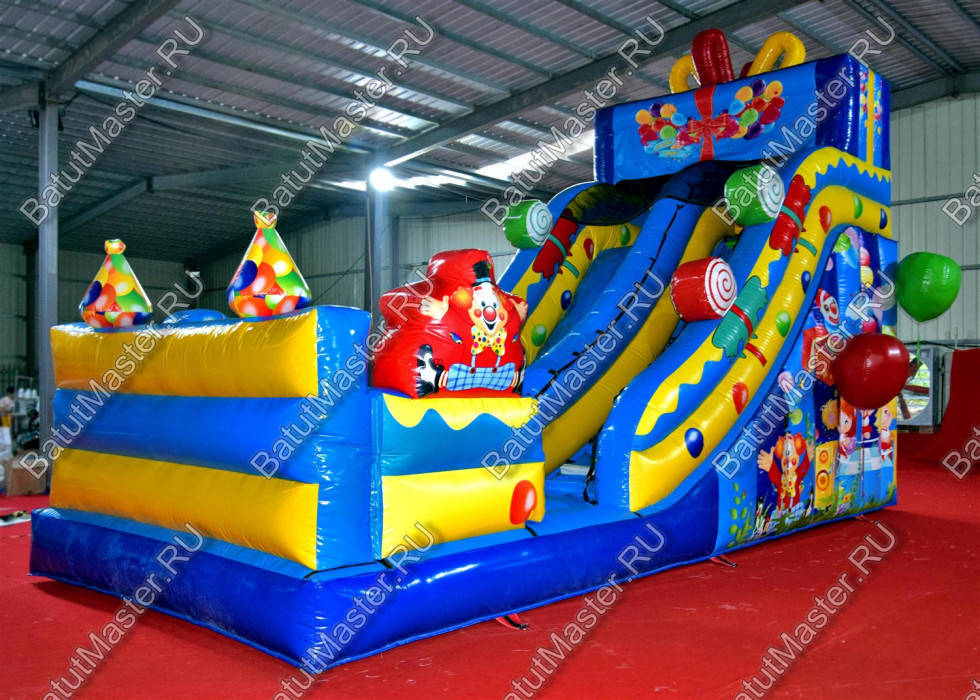 Изображения надувных шаров и клоунов здесь можно встретить повсюду. Но главной развлекательной зоной батута для бизнеса все же остается высокая горка с высотой стартовой площадки 4 м. Правая часть этого элемента принадлежит лестнице выполненной и в виде разноцветных мягких ступенек и в виде ленточных перил. Левая часть – широкий спуск, спуститься с которого можно целой компанией. Стартовая площадка – полностью закрытая часть батута, имеющая собственные навес, продолжающийся сеткой даже над самим полотном горки.