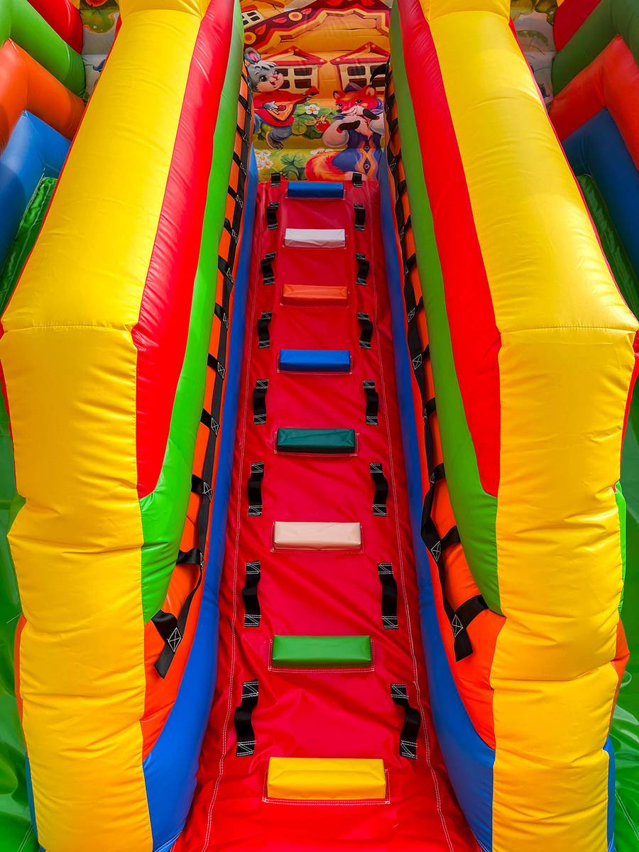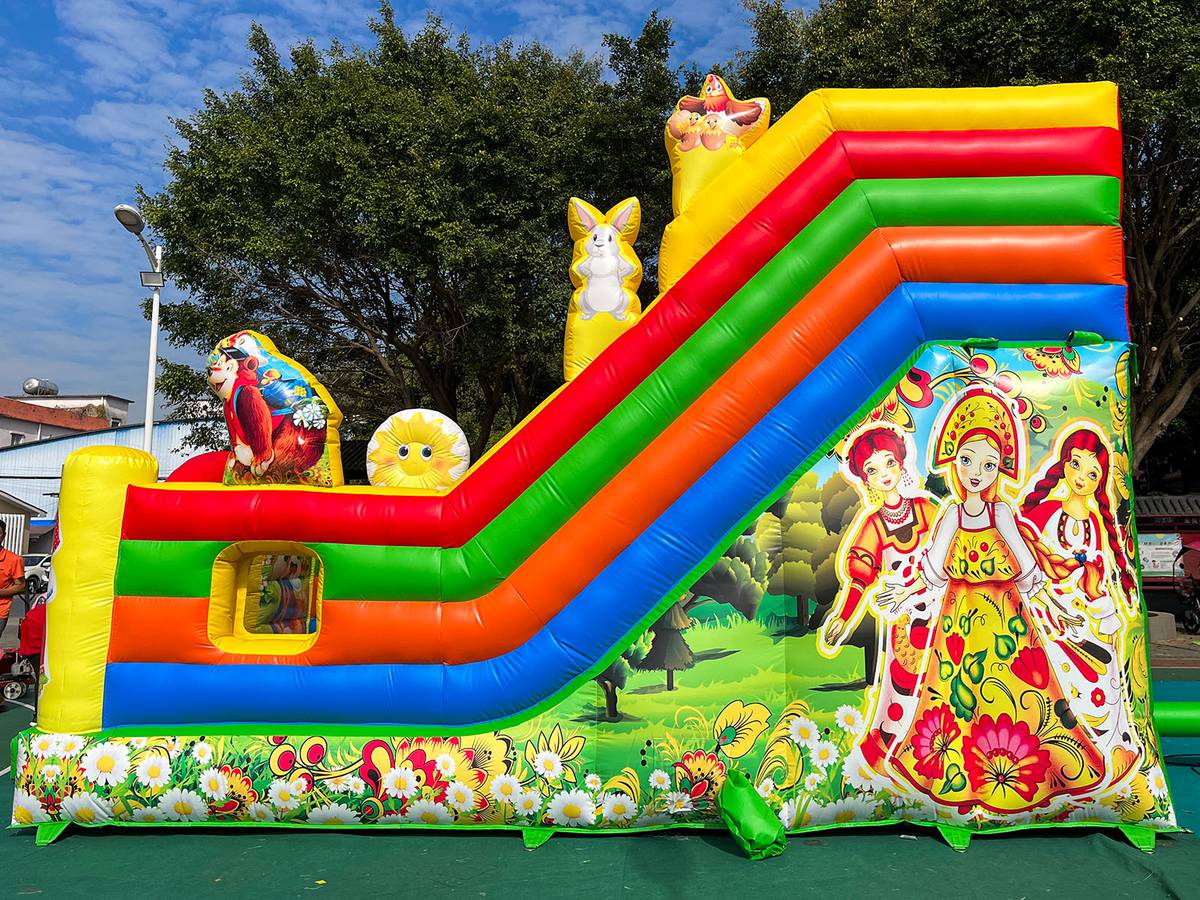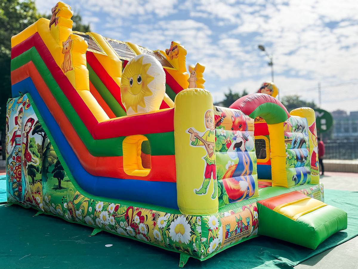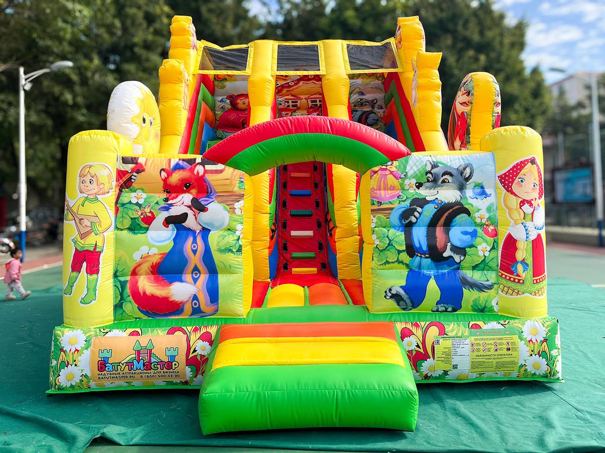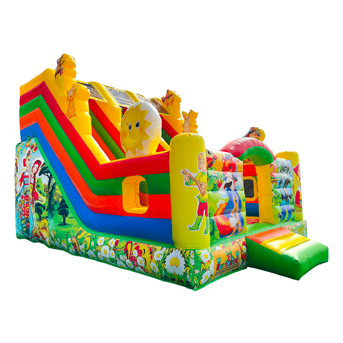 Надувной батут-горка «Славянский 2» (6x4x4.5 м) — это не просто аттракцион, а настоящая сказка в реальности. Его оформление вдохновлено детскими народными сказками: персонажи, звери, яркие цветы и улыбчивое солнышко — всё это оживает в одном пространстве, погружая детей в атмосферу доброты и веселья.