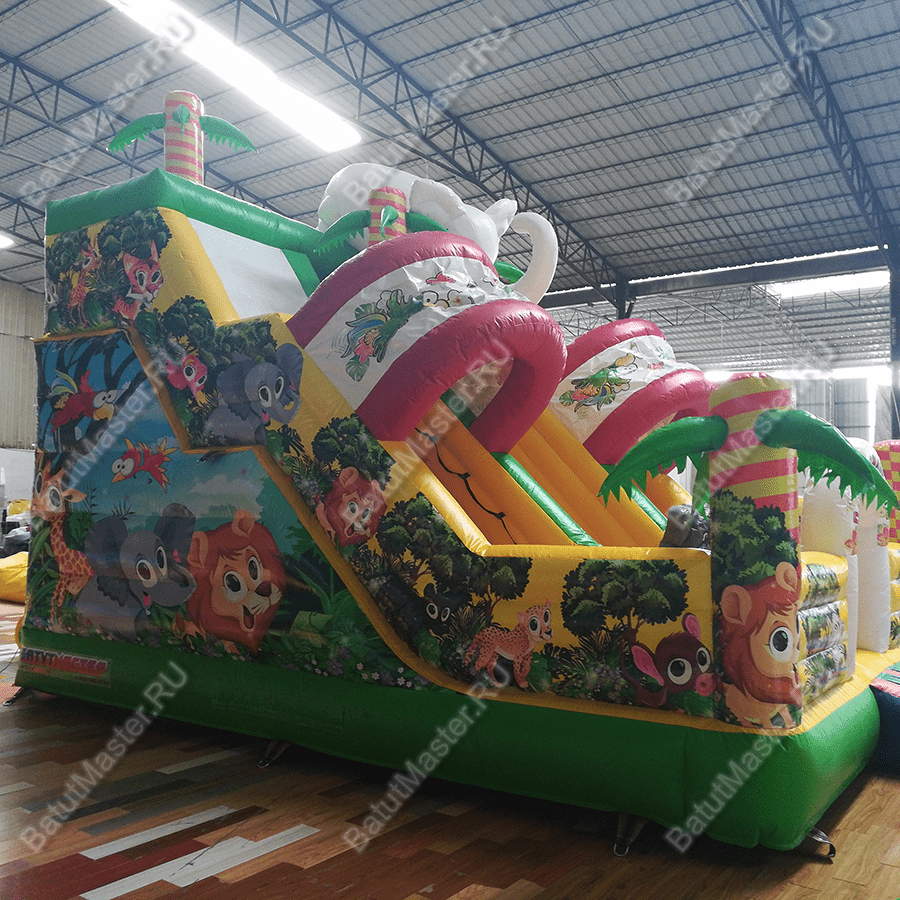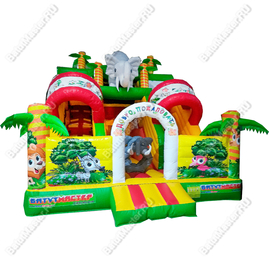 Добро пожаловать в гости к слонику, где можно провести время увлекательно и познавательно. Небольшой надувной батут оснащен самыми интересными модулями и зонами для активных игр. Главным акцентом развлечения здесь является большая горка с резким спуском. Подняться на горку необходимо по мягким ступенькам. Интересно детям будет также пролазать через кольцо в виде слоника. Здесь достаточно места для прыжков. Комплекс по бокам окружен высокими бортами, и даже при спуске они не позволят детям выпасть наружу. Спереди имеются окошки из прочной сетки, так родители смогут наблюдать за тем, как играют дети.