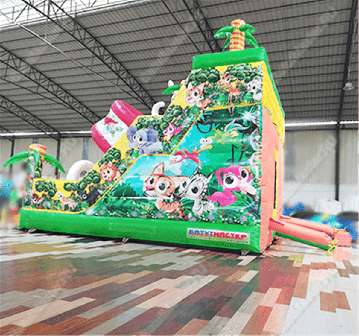 Здесь каждая деталь сделана так, чтобы занять и увлечь каждого ребенка. Яркие цвета притягивают взгляд. Также стоит отметить огромное поле для невероятных прыжков. Снаружи коммерческий батут украшен рисунками, имитирующими летнюю полянку с животными. Вход выполнен в виде арки.