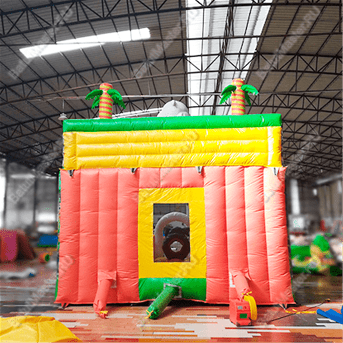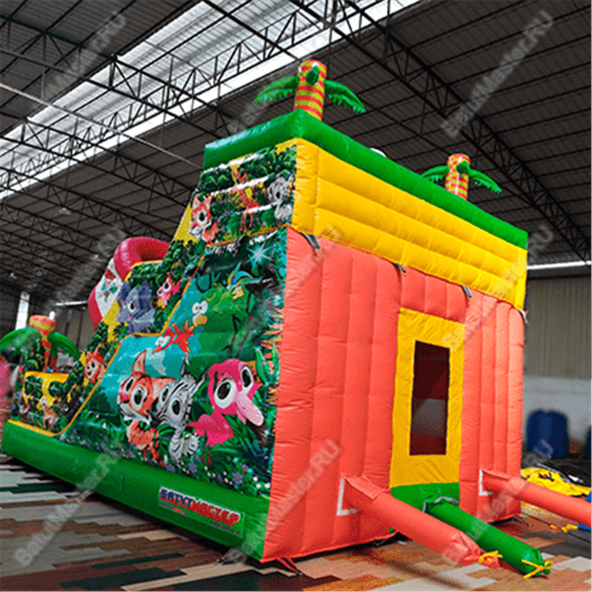 Безопасность комплекса держится на высоком уровне. По бокам имеются надувные борта, которые защищают от выпадения с батута. Батут предназначен для бизнеса. Выполнен в современных цветах из высококачественного ламинированного ПВХ. Такой материал не выгорает от солнечных лучей и не сжимается при низкой температуре.