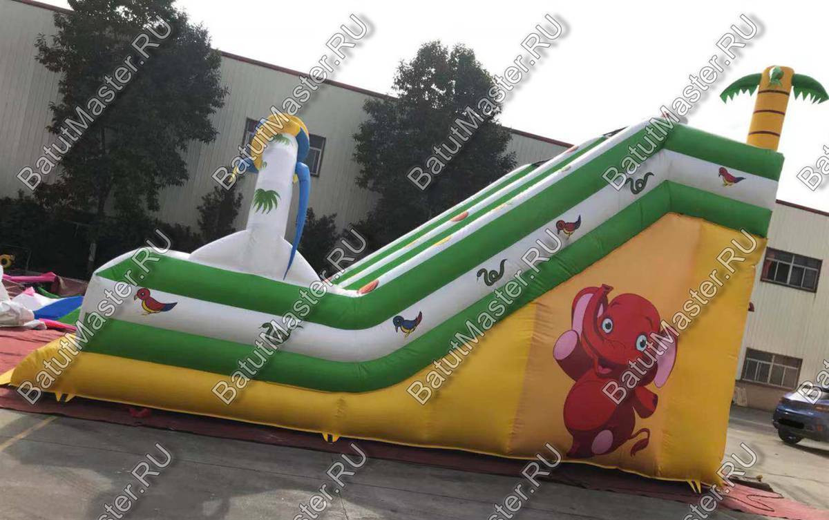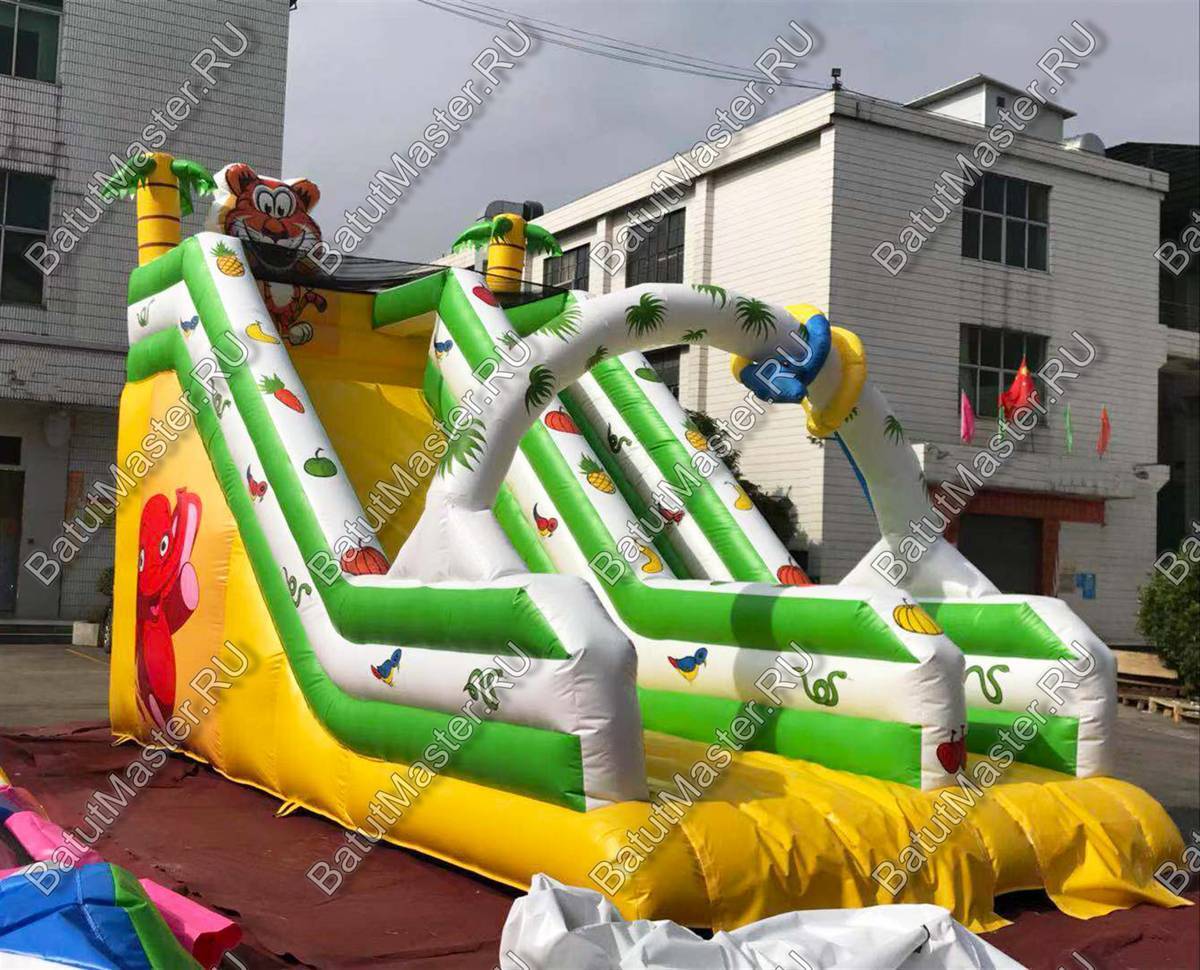 Коммерческий надувной батут «Тропический микс» представляет собой высокую горку с площадкой для прыжков. Такое сочетание очень веселит детей, ведь намного приятнее скатиться на упругую мягкую поверхность, нежели на твёрдую площадку.